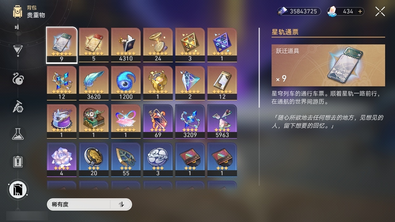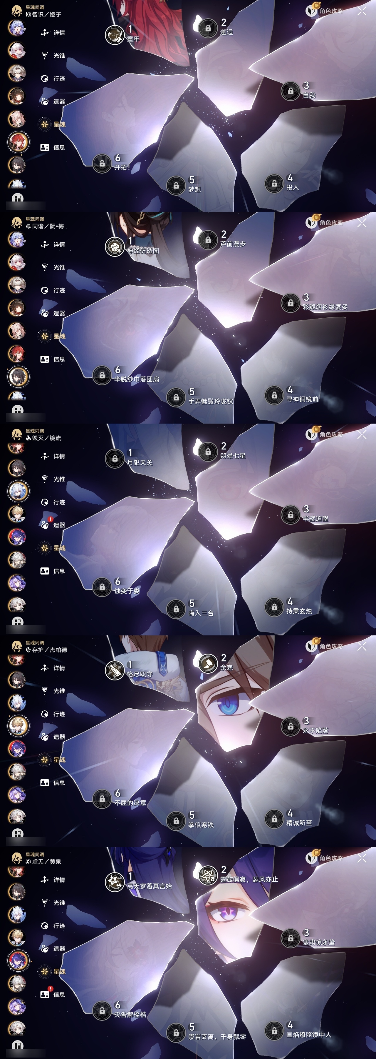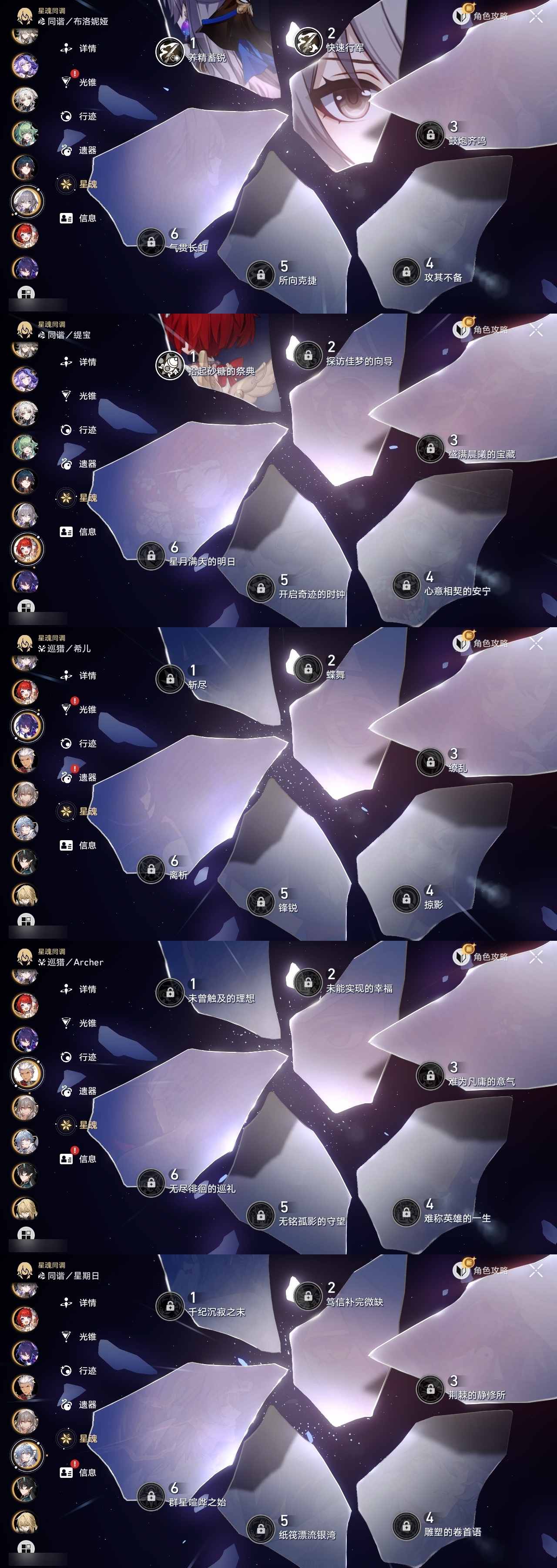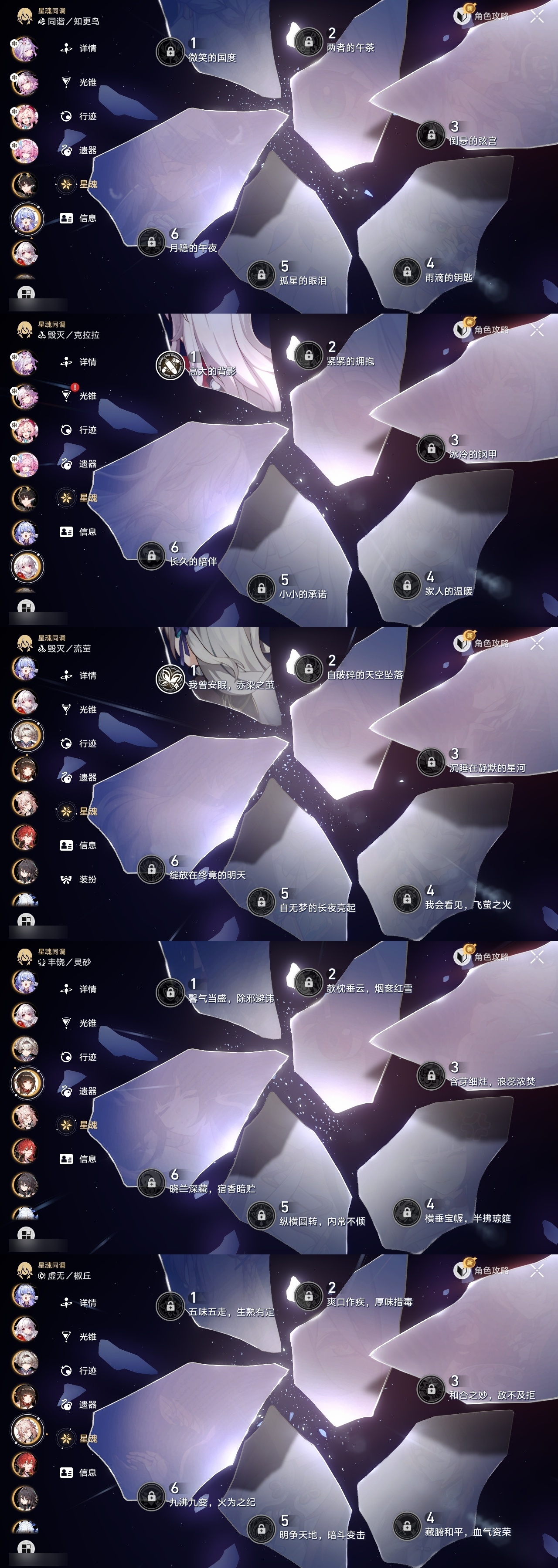 【崩坏·星穹铁道】【lyxq8715】冒险等级:70,女主,五星数量:44,五星角色:白露 2命布洛妮娅 2命杰帕德 2命瓦尔特 2命黄泉 2命姬子 1命克拉拉 1命缇宝 1命长夜月 1命流萤 1命椒丘飞霄景元希儿灵砂星期日罗刹刃丹恒·饮月遐蝶符玄镜流藿藿真理医生黑天鹅风堇知更鸟archer丹恒·腾荒昔涟__五星光锥:记一位星神的陨落 5精孤独的疗愈 5精记忆永不落幕 5精星海巡航 3精制胜的瞬间 2精银河铁道之夜以世界之名时节不居于夜色中我将,巡征追猎比阳光更明亮的让告别,更美一些重塑时光之忆行于流逝的岸__四星角色:娜塔莎 6命虎克 6命貊泽 6命黑塔 6命丹恒 6命艾丝妲 6命希露瓦 6命停云 6命素裳 6命桑博 6命三月七 6命青雀 6命佩拉 6命驭空 6命卢卡 6命玲可 6命桂乃芬 6命寒鸦 6命雪衣 6命米沙 6命加拉赫 6命阿兰 2命