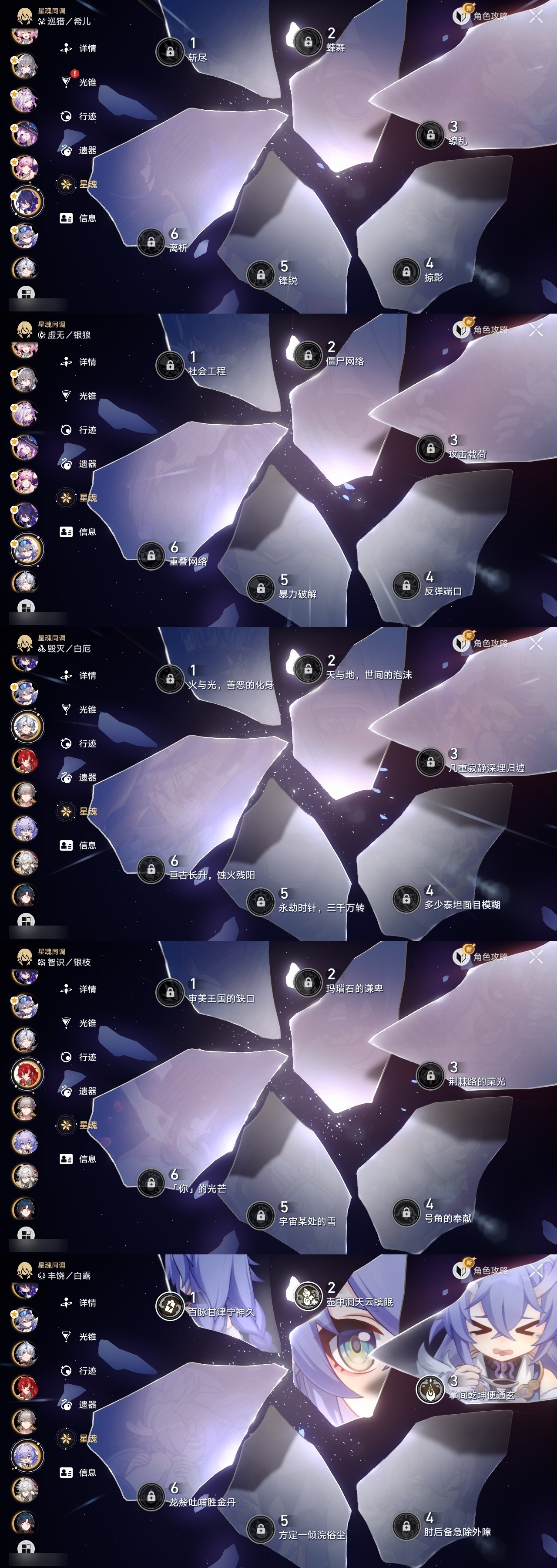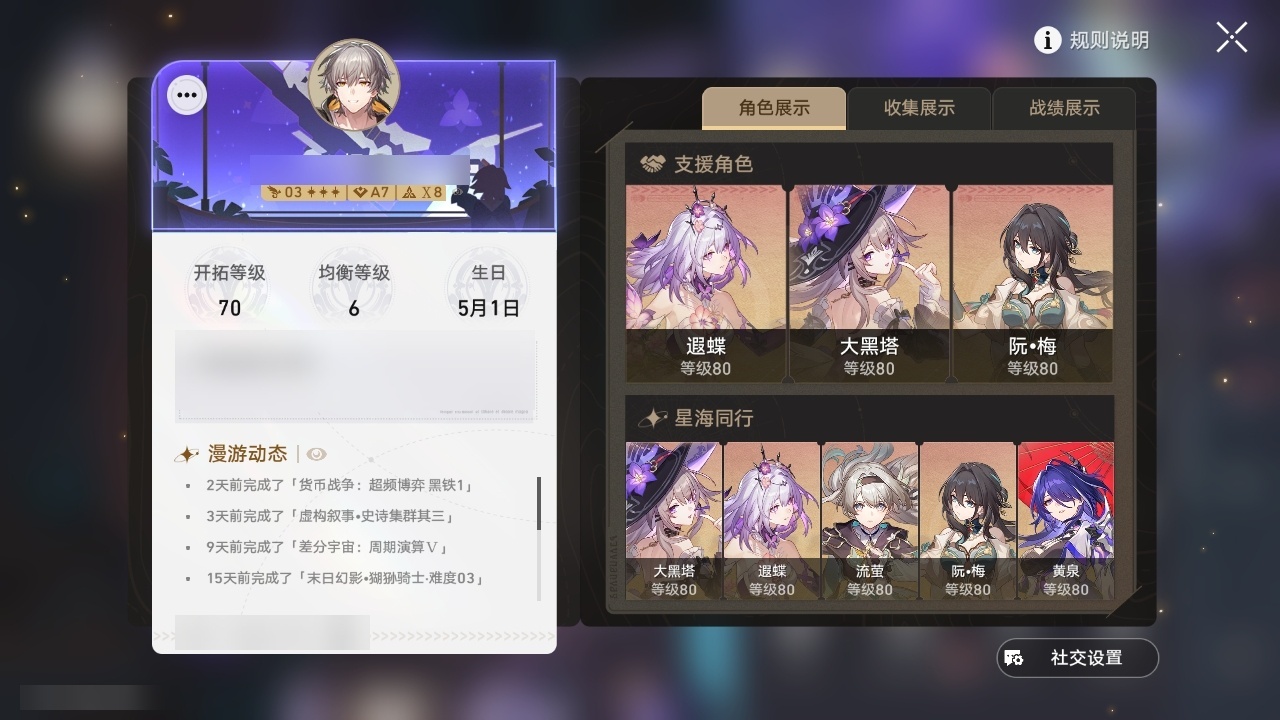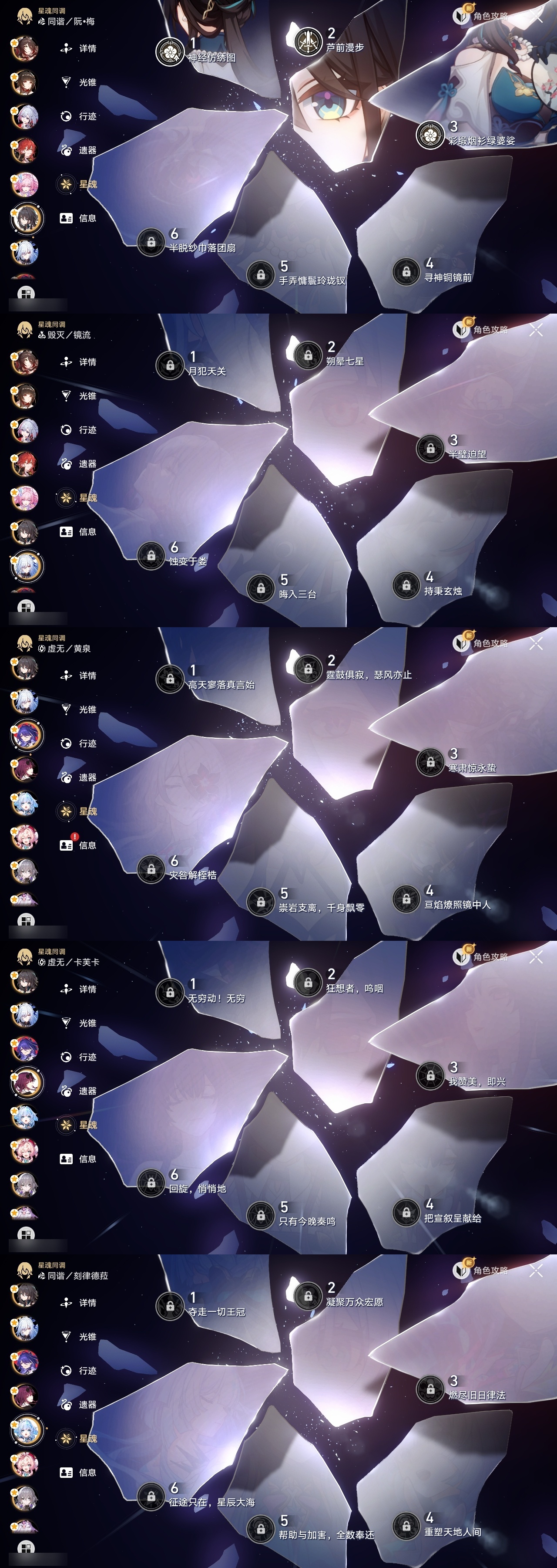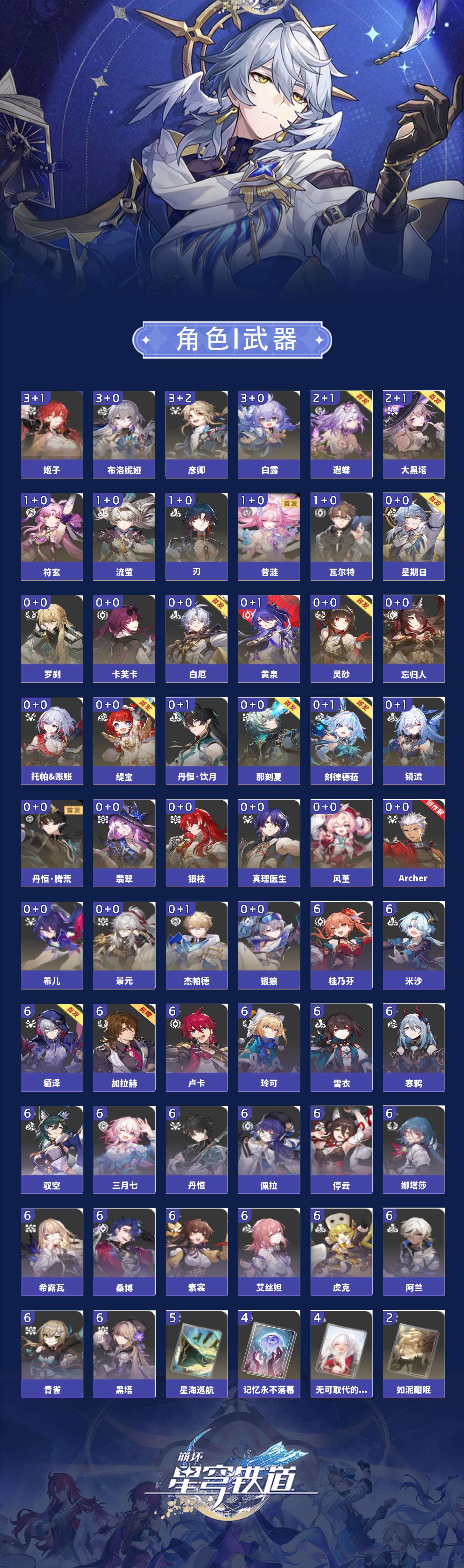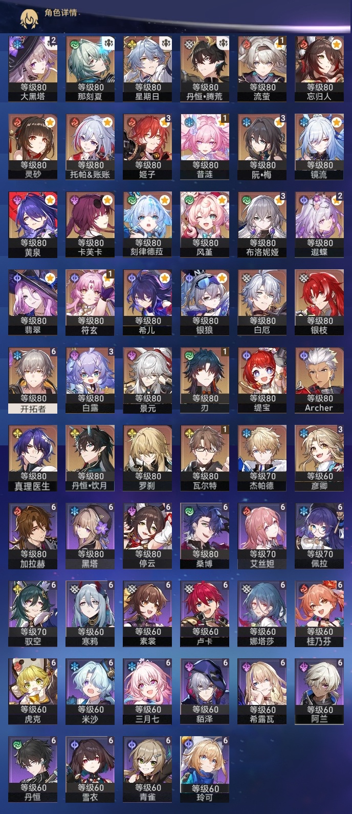 【崩坏·星穹铁道】【lyxq8722】冒险等级:70,男主,五星数量:49,五星角色:白露 3命布洛妮娅 3命姬子 3命彦卿 3命大黑塔 2命遐蝶 2命瓦尔特 1命刃 1命符玄 1命昔涟 1命流萤 1命银狼景元希儿灵砂杰帕德星期日忘归人罗刹缇宝卡芙卡丹恒·饮月镜流托帕账账银枝真理医生那刻夏黄泉风堇白厄archer刻律德菈丹恒·腾荒翡翠__五星光锥:星海巡航 5精无可取代的东西 4精记忆永不落幕 4精如泥酣眠 2精落日时起舞制胜的瞬间银河铁道之夜银河铁道之夜向着不可追问处比阳光更明亮的让告别,更美一些此身为剑镜中故我行于流逝的岸金血铭刻的时代__四星角色:阿兰 6命娜塔莎 6命虎克 6命貊泽 6命黑塔 6命丹恒 6命艾丝妲 6命希露瓦 6命停云 6命素裳 6命桑博 6命三月七 6命青雀 6命佩拉 6命驭空 6命卢卡 6命玲可 6命桂乃芬 6命寒鸦 6命雪衣 6命米沙 6命加拉赫 6命