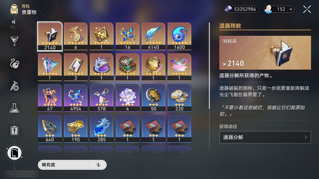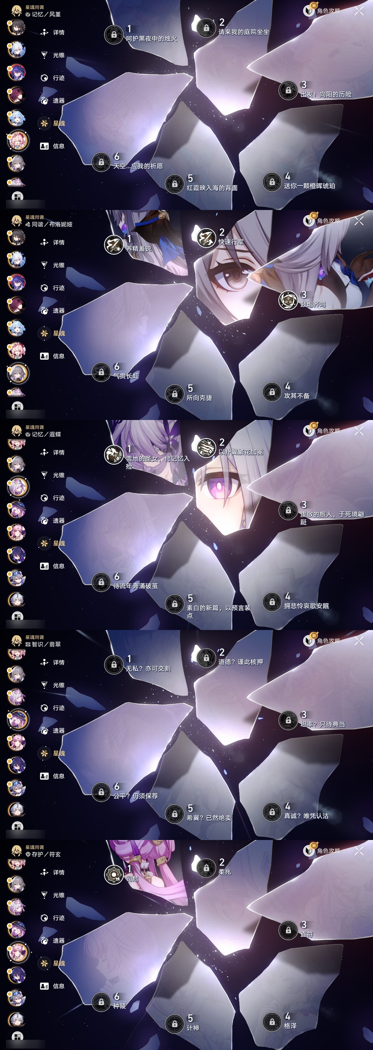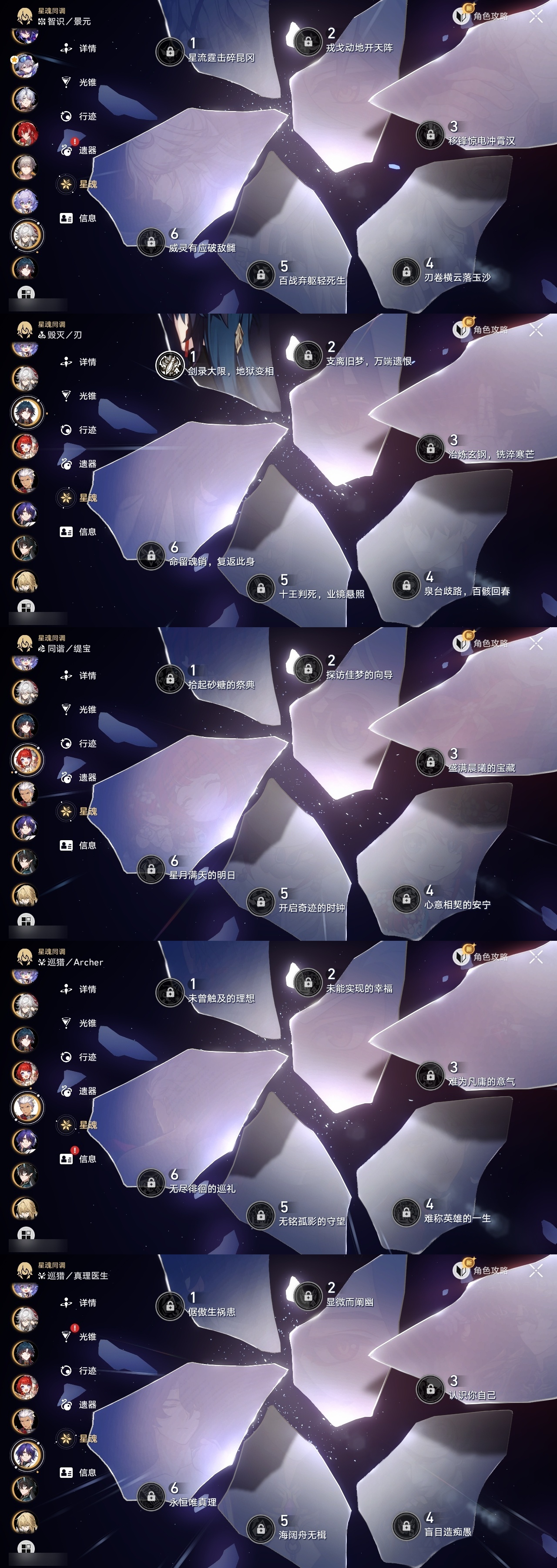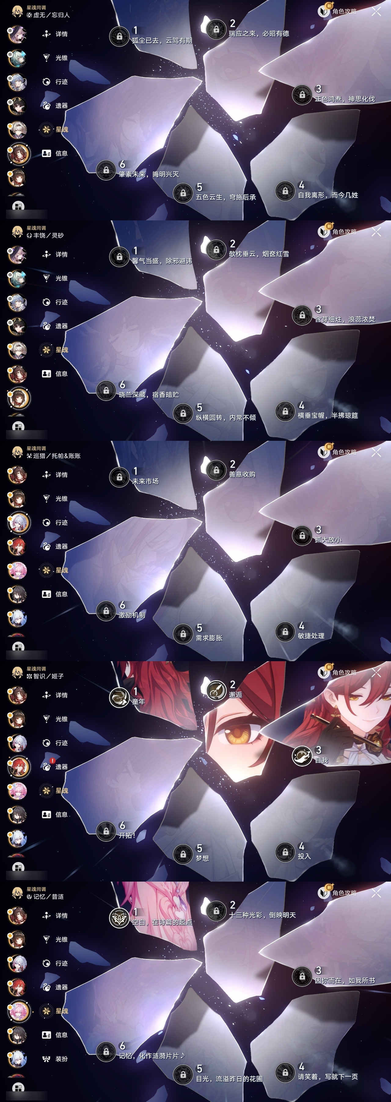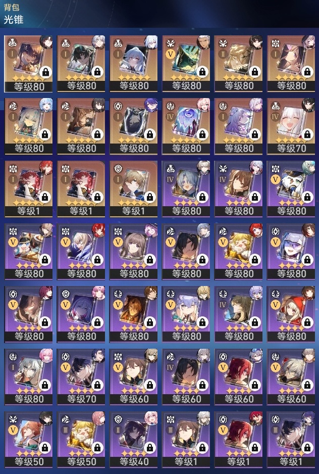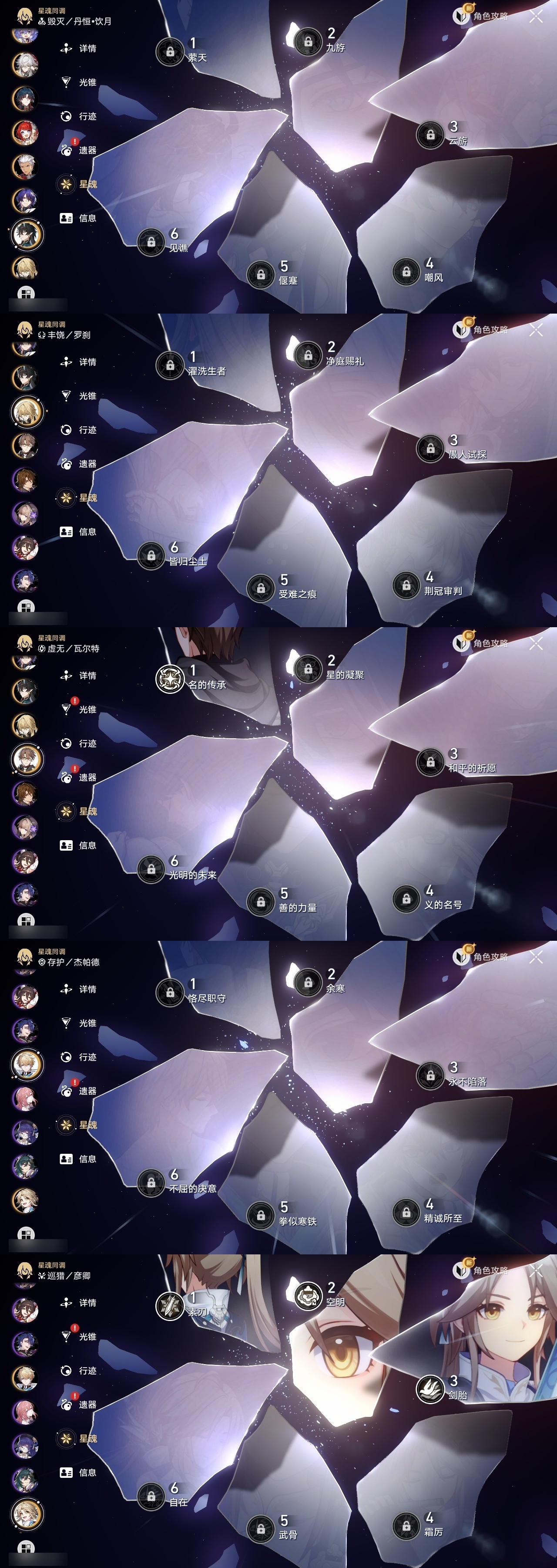 【崩坏·星穹铁道】【lyxq8722】冒险等级:70,男主,五星数量:49,五星角色:白露 3命布洛妮娅 3命姬子 3命彦卿 3命大黑塔 2命遐蝶 2命瓦尔特 1命刃 1命符玄 1命昔涟 1命流萤 1命银狼景元希儿灵砂杰帕德星期日忘归人罗刹缇宝卡芙卡丹恒·饮月镜流托帕账账银枝真理医生那刻夏黄泉风堇白厄archer刻律德菈丹恒·腾荒翡翠__五星光锥:星海巡航 5精无可取代的东西 4精记忆永不落幕 4精如泥酣眠 2精落日时起舞制胜的瞬间银河铁道之夜银河铁道之夜向着不可追问处比阳光更明亮的让告别,更美一些此身为剑镜中故我行于流逝的岸金血铭刻的时代__四星角色:阿兰 6命娜塔莎 6命虎克 6命貊泽 6命黑塔 6命丹恒 6命艾丝妲 6命希露瓦 6命停云 6命素裳 6命桑博 6命三月七 6命青雀 6命佩拉 6命驭空 6命卢卡 6命玲可 6命桂乃芬 6命寒鸦 6命雪衣 6命米沙 6命加拉赫 6命