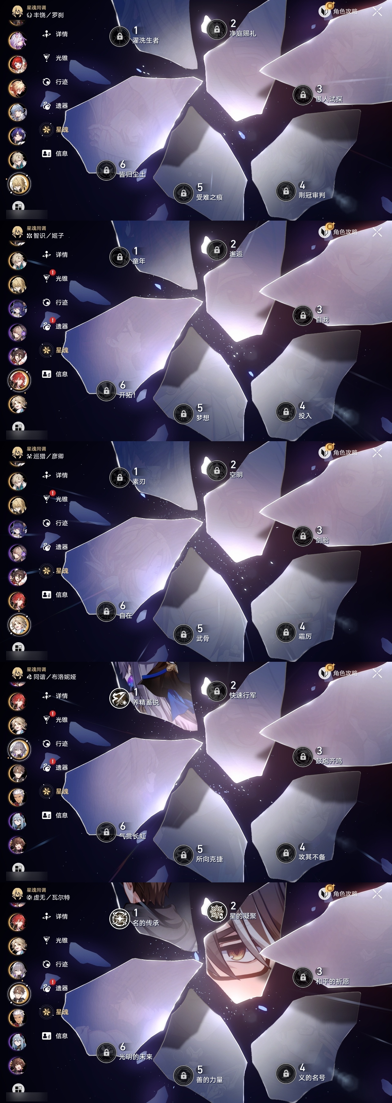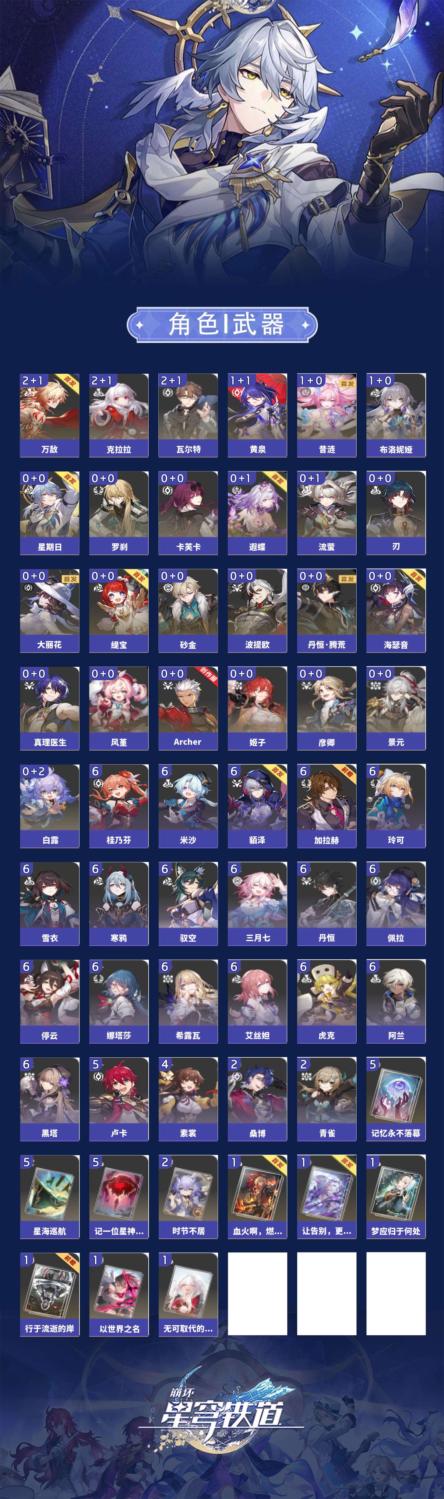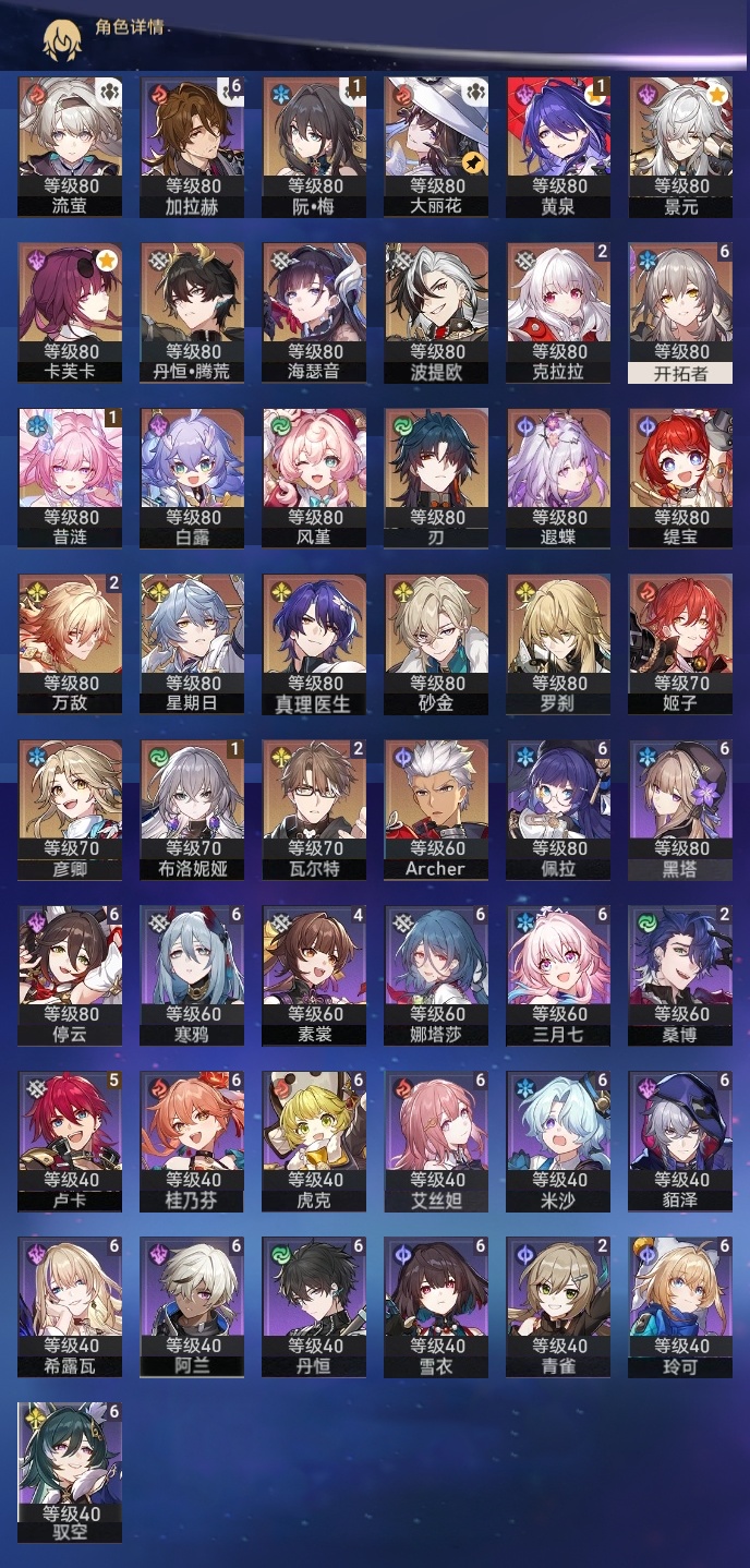 【崩坏·星穹铁道】【lyxq8742】冒险等级:70,女主,五星数量:35,五星角色:瓦尔特 2命克拉拉 2命万敌 2命布洛妮娅 1命黄泉 1命昔涟 1命景元白露姬子彦卿星期日罗刹缇宝刃卡芙卡遐蝶真理医生风堇砂金archer海瑟音丹恒·腾荒大丽花波提欧流萤__五星光锥:星海巡航 5精记一位星神的陨落 5精记忆永不落幕 5精时节不居 2精以世界之名无可取代的东西血火啊,燃烧前路让告别,更美一些行于流逝的岸梦应归于何处__四星角色:阿兰 6命娜塔莎 6命虎克 6命貊泽 6命黑塔 6命丹恒 6命艾丝妲 6命希露瓦 6命停云 6命三月七 6命佩拉 6命驭空 6命玲可 6命桂乃芬 6命寒鸦 6命雪衣 6命米沙 6命加拉赫 6命卢卡 5命素裳 4命桑博 2命青雀 2命