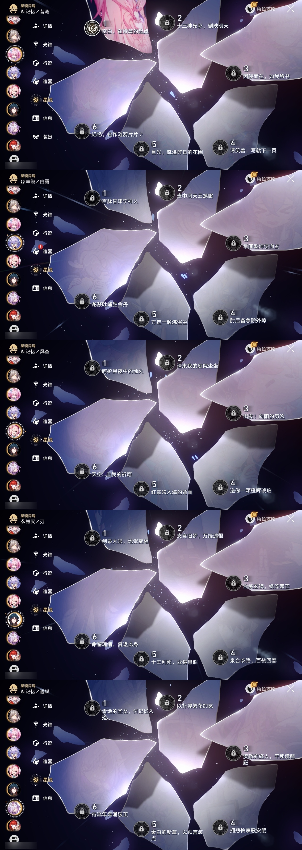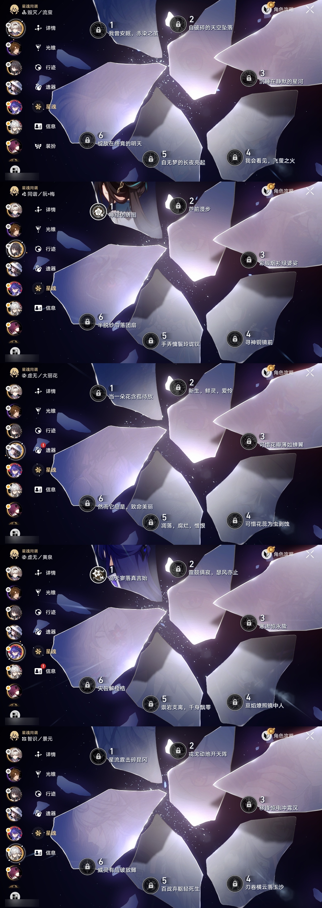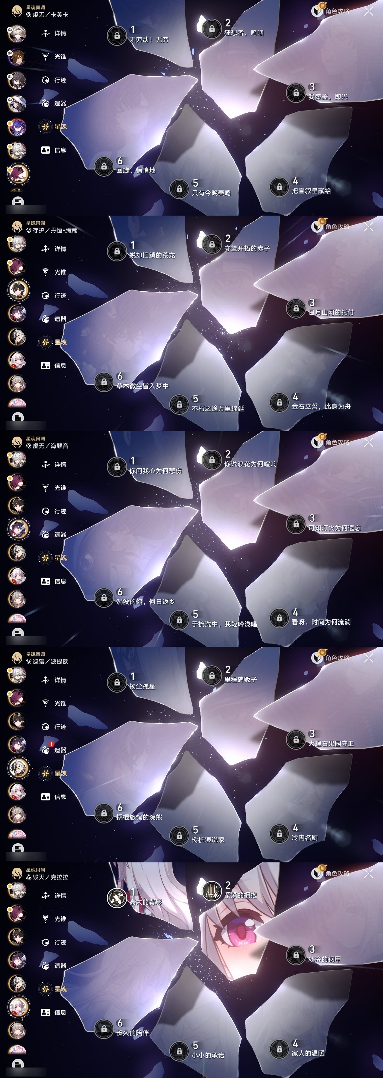 【崩坏·星穹铁道】【lyxq8742】冒险等级:70,女主,五星数量:35,五星角色:瓦尔特 2命克拉拉 2命万敌 2命布洛妮娅 1命黄泉 1命昔涟 1命景元白露姬子彦卿星期日罗刹缇宝刃卡芙卡遐蝶真理医生风堇砂金archer海瑟音丹恒·腾荒大丽花波提欧流萤__五星光锥:星海巡航 5精记一位星神的陨落 5精记忆永不落幕 5精时节不居 2精以世界之名无可取代的东西血火啊,燃烧前路让告别,更美一些行于流逝的岸梦应归于何处__四星角色:阿兰 6命娜塔莎 6命虎克 6命貊泽 6命黑塔 6命丹恒 6命艾丝妲 6命希露瓦 6命停云 6命三月七 6命佩拉 6命驭空 6命玲可 6命桂乃芬 6命寒鸦 6命雪衣 6命米沙 6命加拉赫 6命卢卡 5命素裳 4命桑博 2命青雀 2命