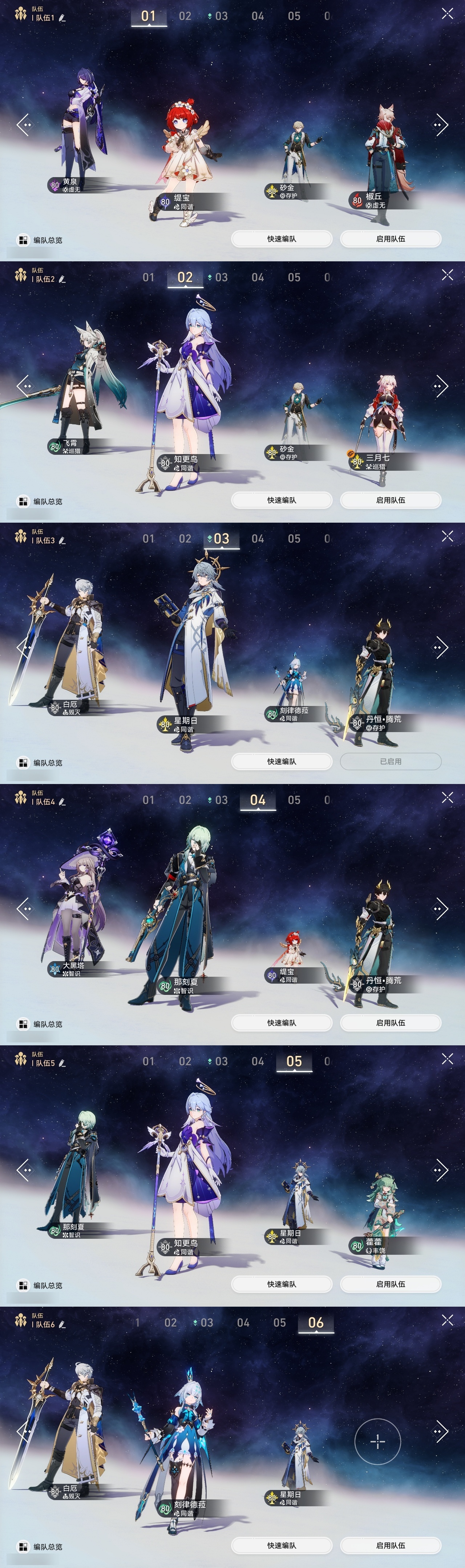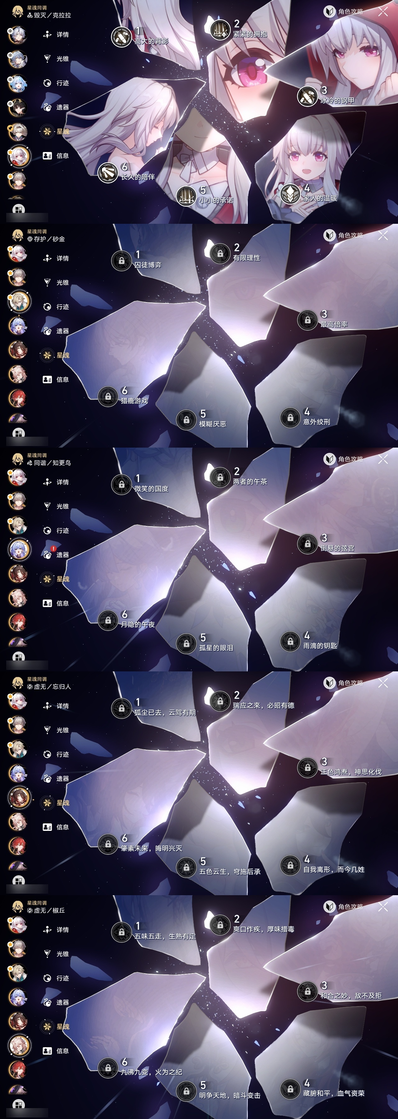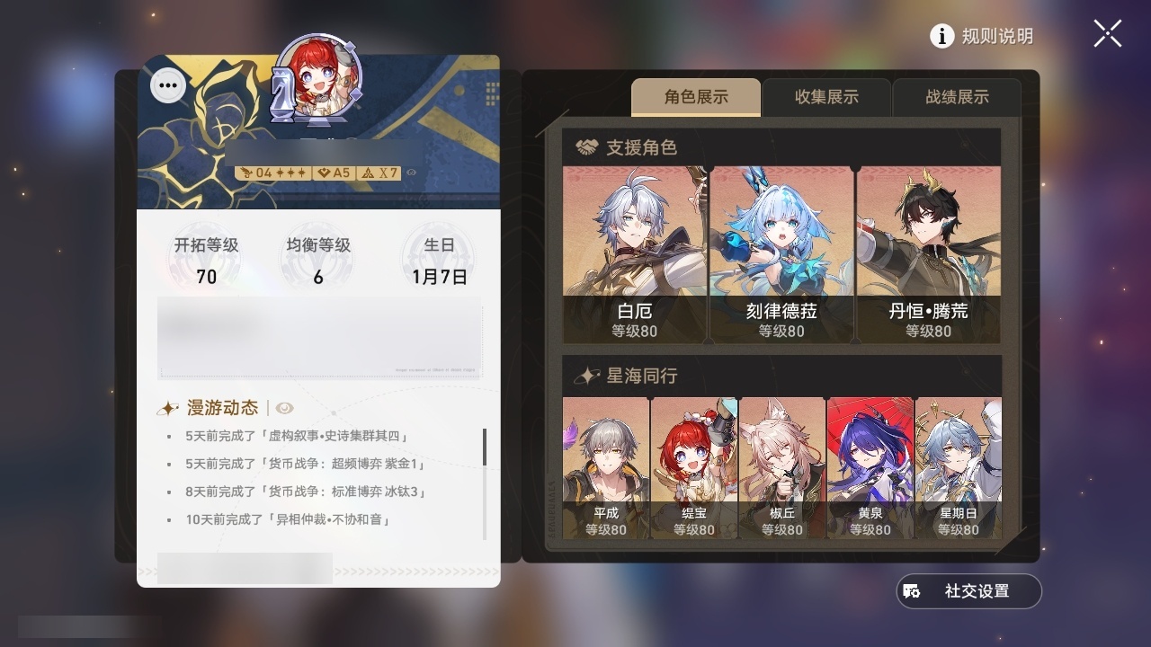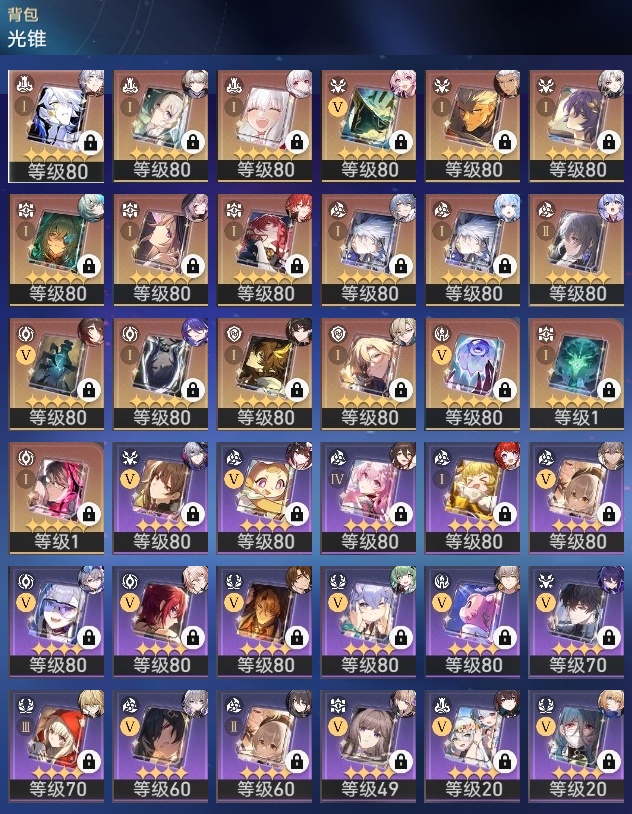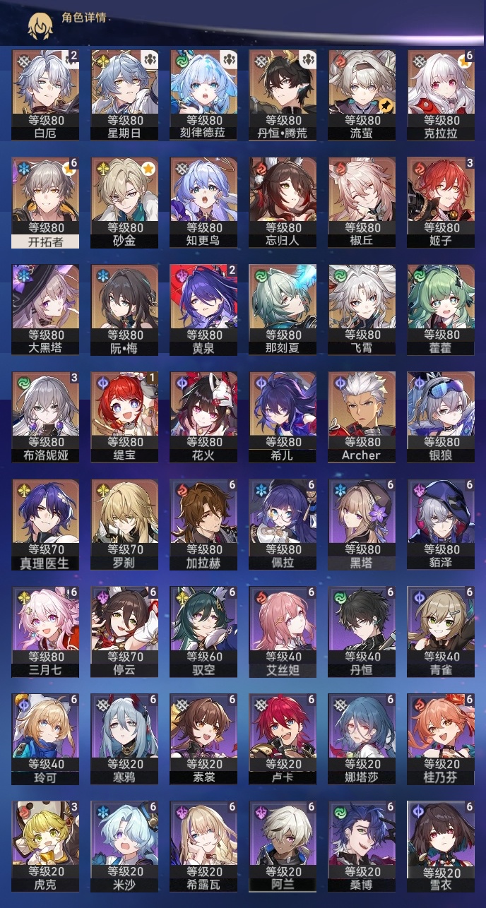 【崩坏·星穹铁道】【lyxq8769】冒险等级:70,男主,五星数量:43,五星角色:克拉拉 6命布洛妮娅 3命姬子 3命黄泉 2命白厄 2命缇宝 1命椒丘飞霄银狼希儿星期日大黑塔忘归人罗刹藿藿真理医生花火那刻夏砂金知更鸟archer刻律德菈丹恒·腾荒流萤__五星光锥:星海巡航 5精孤独的疗愈 5精记忆永不落幕 5精但战斗还未结束 2精银河铁道之夜以世界之名无可取代的东西不息的演算回到大地的飞行回到大地的飞行向着不可追问处纯粹思维的洗礼生命当付之一炬行于流逝的岸命运从未公平黎明恰如此燃烧理想燃烧的地狱纵然山河万程梦应归于何处__四星角色:阿兰 6命娜塔莎 6命貊泽 6命黑塔 6命丹恒 6命艾丝妲 6命希露瓦 6命停云 6命素裳 6命桑博 6命三月七 6命青雀 6命佩拉 6命驭空 6命卢卡 6命玲可 6命桂乃芬 6命寒鸦 6命雪衣 6命米沙 6命加拉赫 6命虎克 3命