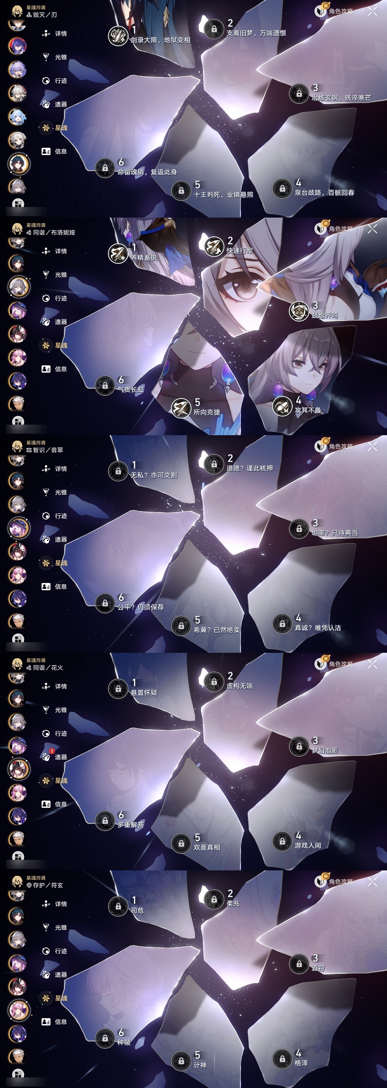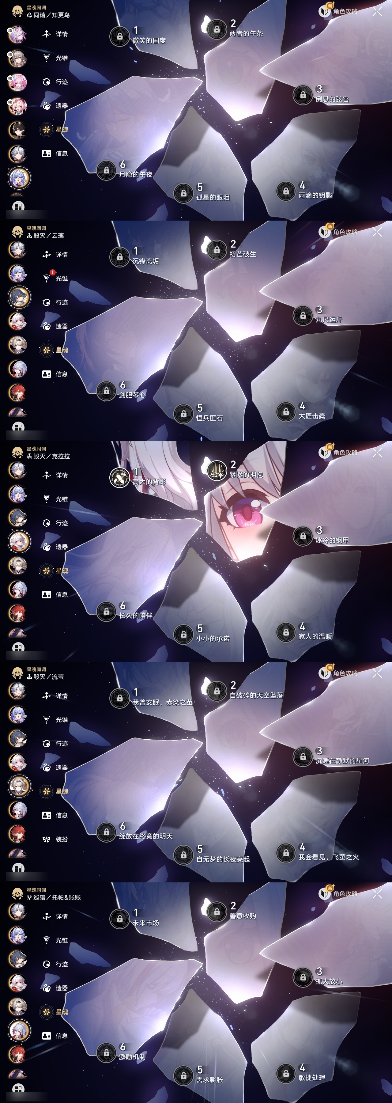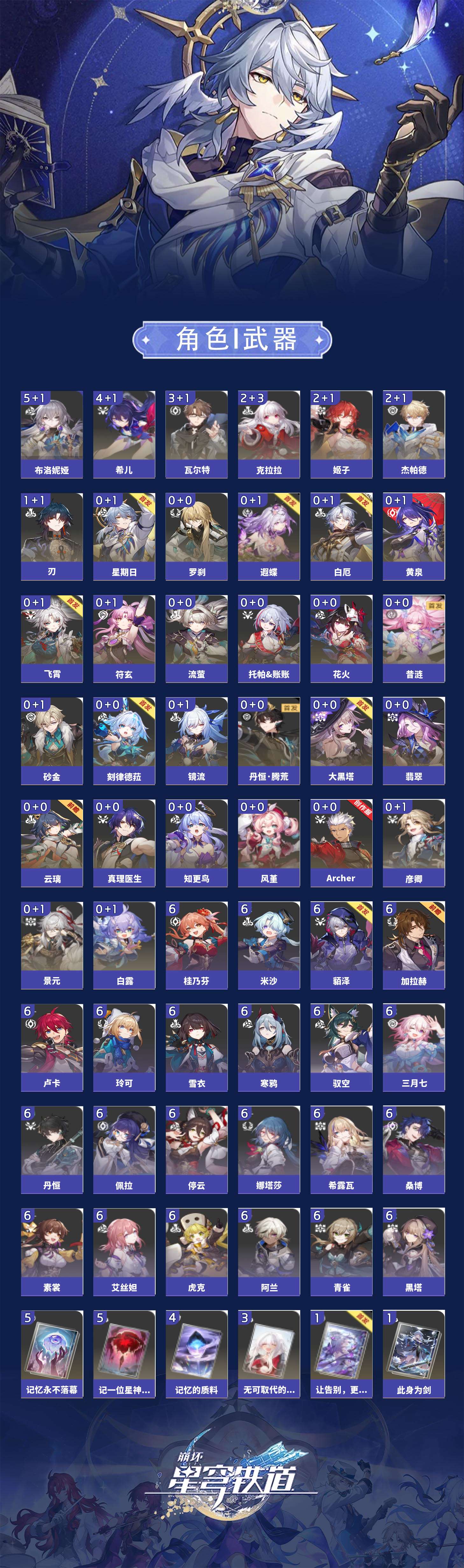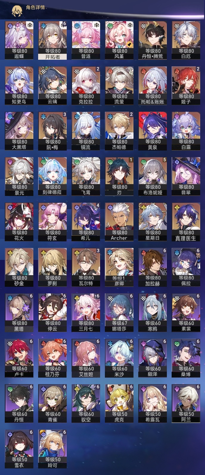 【崩坏·星穹铁道】【lyxq8733】冒险等级:70,女主,五星数量:58,五星角色:布洛妮娅 5命希儿 4命瓦尔特 3命姬子 2命杰帕德 2命克拉拉 2命刃 1命云璃飞霄景元白露彦卿星期日大黑塔罗刹遐蝶符玄镜流托帕账账真理医生花火黄泉风堇砂金知更鸟白厄archer刻律德菈丹恒·腾荒昔涟流萤翡翠__五星光锥:记一位星神的陨落 5精记忆永不落幕 5精记忆的质料 4精无可取代的东西 3精制胜的瞬间银河铁道之夜银河铁道之夜银河铁道之夜以世界之名时节不居如泥酣眠但战斗还未结束但战斗还未结束于夜色中拂晓之前我将,巡征追猎不息的演算回到大地的飞行到不了的彼岸她已闭上双眼让告别,更美一些此身为剑镜中故我行于流逝的岸命运从未公平黎明恰如此燃烧__四星角色:阿兰 6命娜塔莎 6命虎克 6命貊泽 6命黑塔 6命丹恒 6命艾丝妲 6命希露瓦 6命停云 6命素裳 6命桑博 6命三月七 6命青雀 6命佩拉 6命驭空 6命卢卡 6命玲可 6命桂乃芬 6命寒鸦 6命雪衣 6命米沙 6命加拉赫 6命