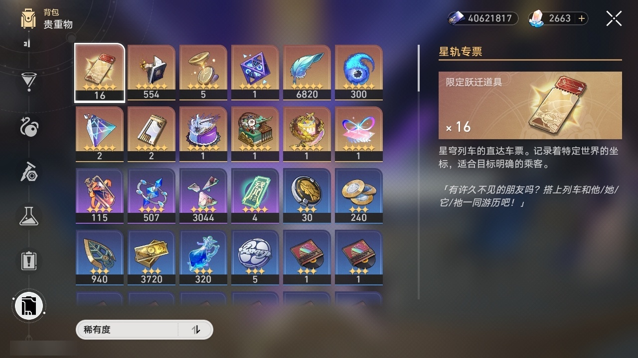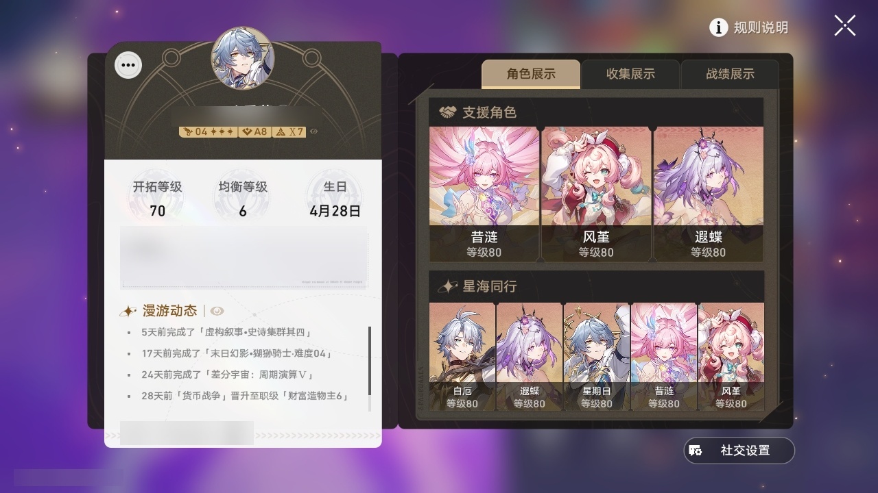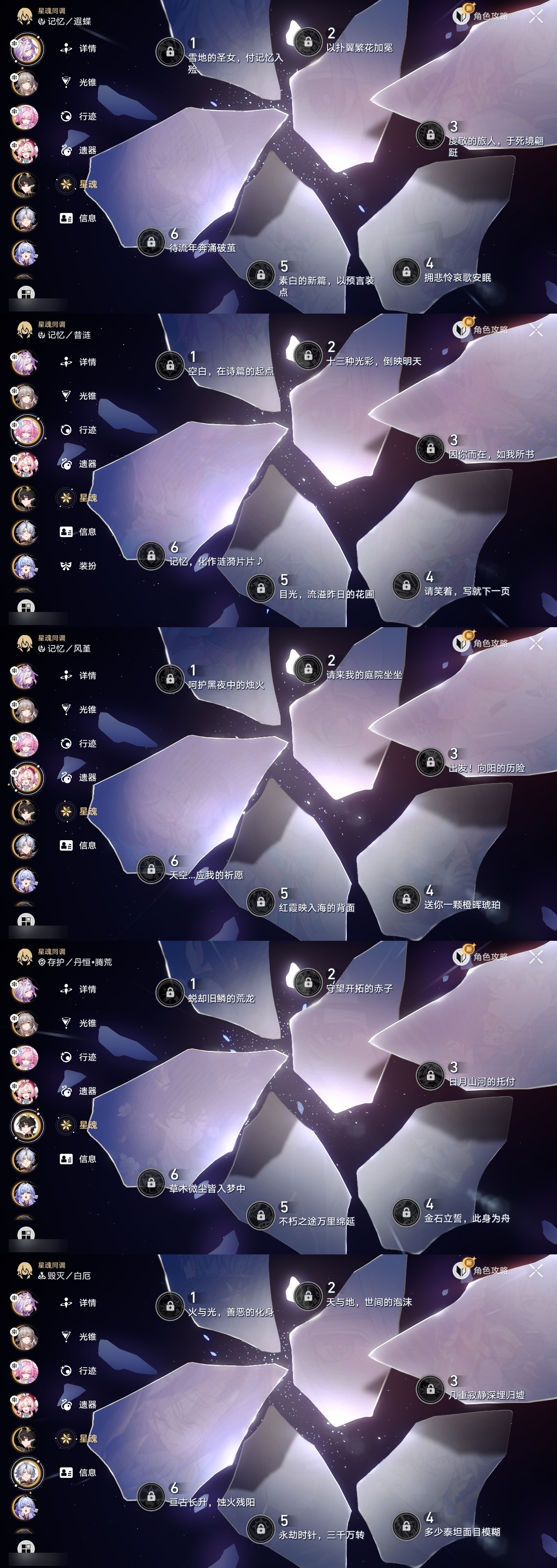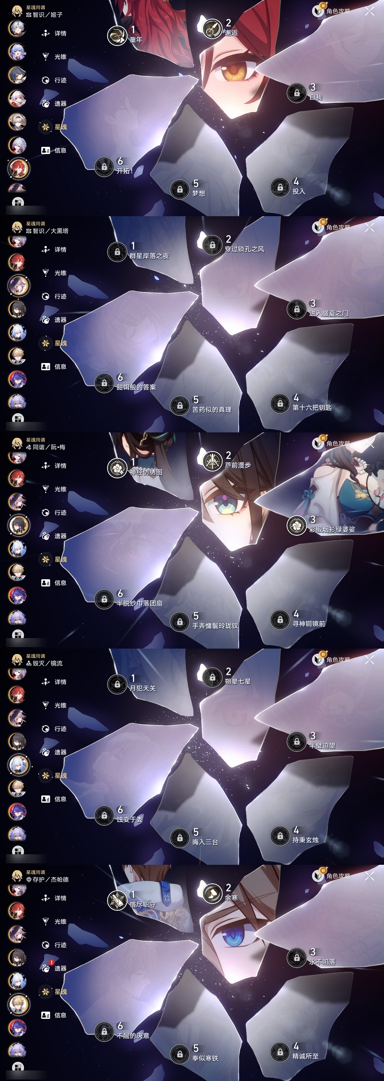 【崩坏·星穹铁道】【lyxq8733】冒险等级:70,女主,五星数量:58,五星角色:布洛妮娅 5命希儿 4命瓦尔特 3命姬子 2命杰帕德 2命克拉拉 2命刃 1命云璃飞霄景元白露彦卿星期日大黑塔罗刹遐蝶符玄镜流托帕账账真理医生花火黄泉风堇砂金知更鸟白厄archer刻律德菈丹恒·腾荒昔涟流萤翡翠__五星光锥:记一位星神的陨落 5精记忆永不落幕 5精记忆的质料 4精无可取代的东西 3精制胜的瞬间银河铁道之夜银河铁道之夜银河铁道之夜以世界之名时节不居如泥酣眠但战斗还未结束但战斗还未结束于夜色中拂晓之前我将,巡征追猎不息的演算回到大地的飞行到不了的彼岸她已闭上双眼让告别,更美一些此身为剑镜中故我行于流逝的岸命运从未公平黎明恰如此燃烧__四星角色:阿兰 6命娜塔莎 6命虎克 6命貊泽 6命黑塔 6命丹恒 6命艾丝妲 6命希露瓦 6命停云 6命素裳 6命桑博 6命三月七 6命青雀 6命佩拉 6命驭空 6命卢卡 6命玲可 6命桂乃芬 6命寒鸦 6命雪衣 6命米沙 6命加拉赫 6命
