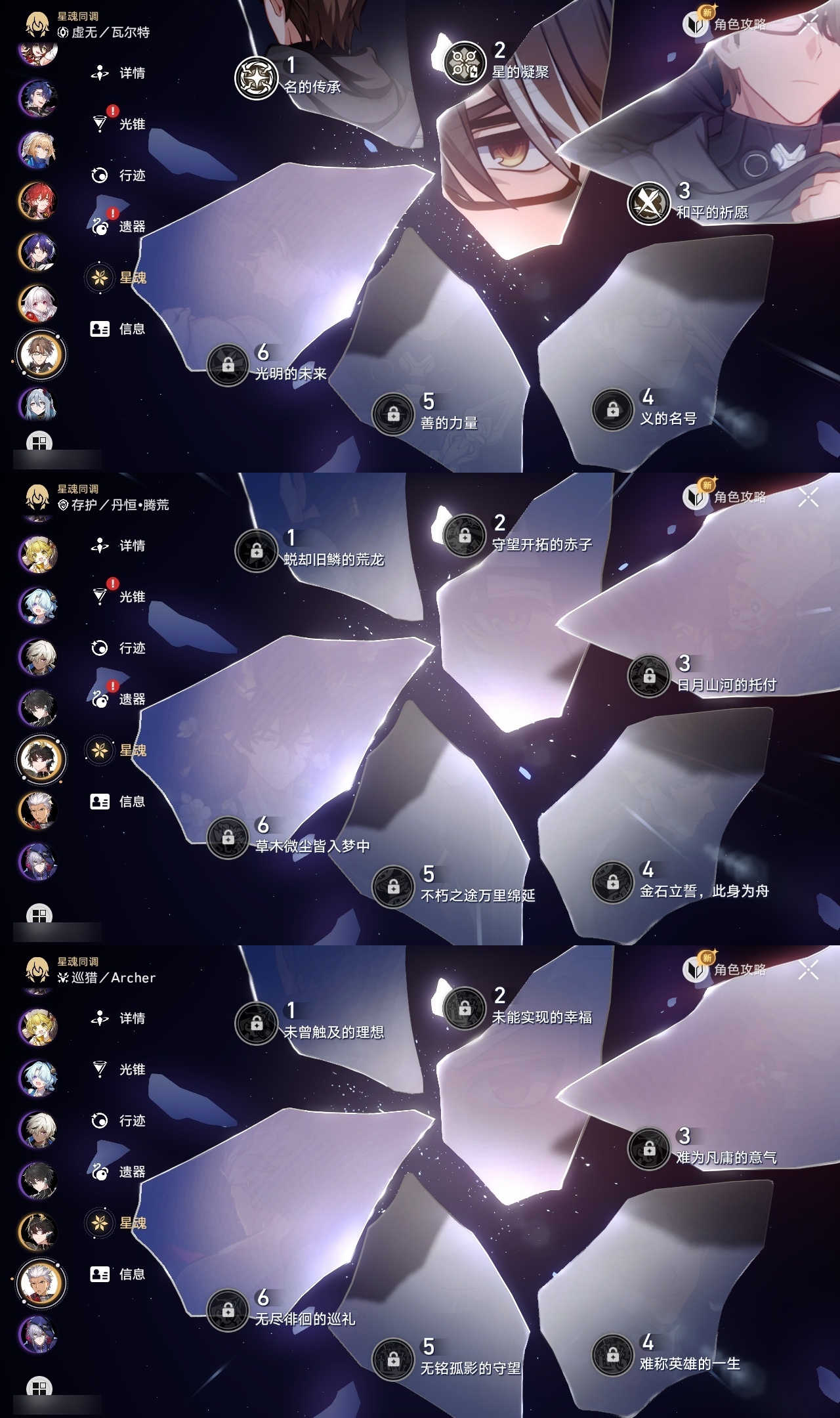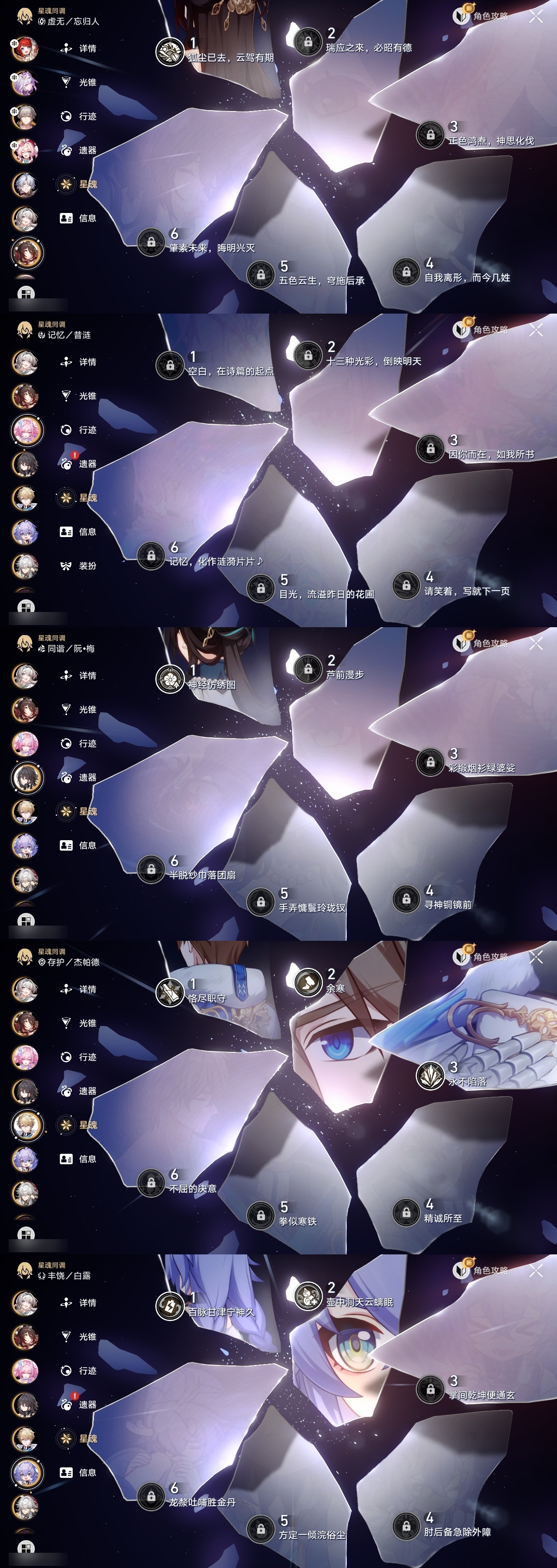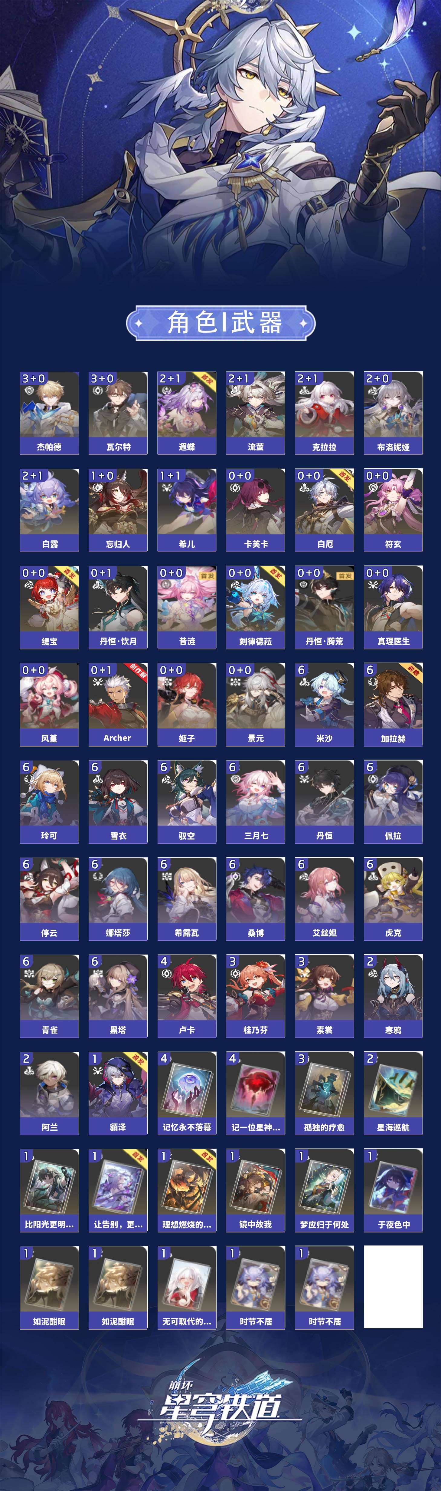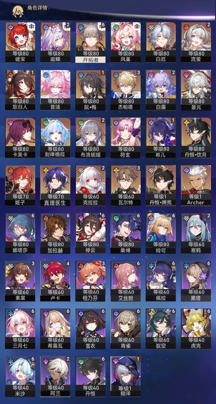 【崩坏·星穹铁道】【lyxq8793】冒险等级:70,男主,五星数量:37,五星角色:杰帕德 3命瓦尔特 3命白露 2命布洛妮娅 2命克拉拉 2命遐蝶 2命流萤 2命希儿 1命忘归人 1命景元姬子缇宝卡芙卡丹恒·饮月符玄真理医生风堇白厄archer刻律德菈丹恒·腾荒昔涟__五星光锥:记一位星神的陨落 4精记忆永不落幕 4精孤独的疗愈 3精星海巡航 2精无可取代的东西时节不居时节不居如泥酣眠如泥酣眠于夜色中比阳光更明亮的让告别,更美一些镜中故我理想燃烧的地狱梦应归于何处__四星角色:娜塔莎 6命虎克 6命黑塔 6命丹恒 6命艾丝妲 6命希露瓦 6命停云 6命桑博 6命三月七 6命青雀 6命佩拉 6命驭空 6命玲可 6命雪衣 6命米沙 6命加拉赫 6命卢卡 4命素裳 3命桂乃芬 3命阿兰 2命寒鸦 2命貊泽 1命