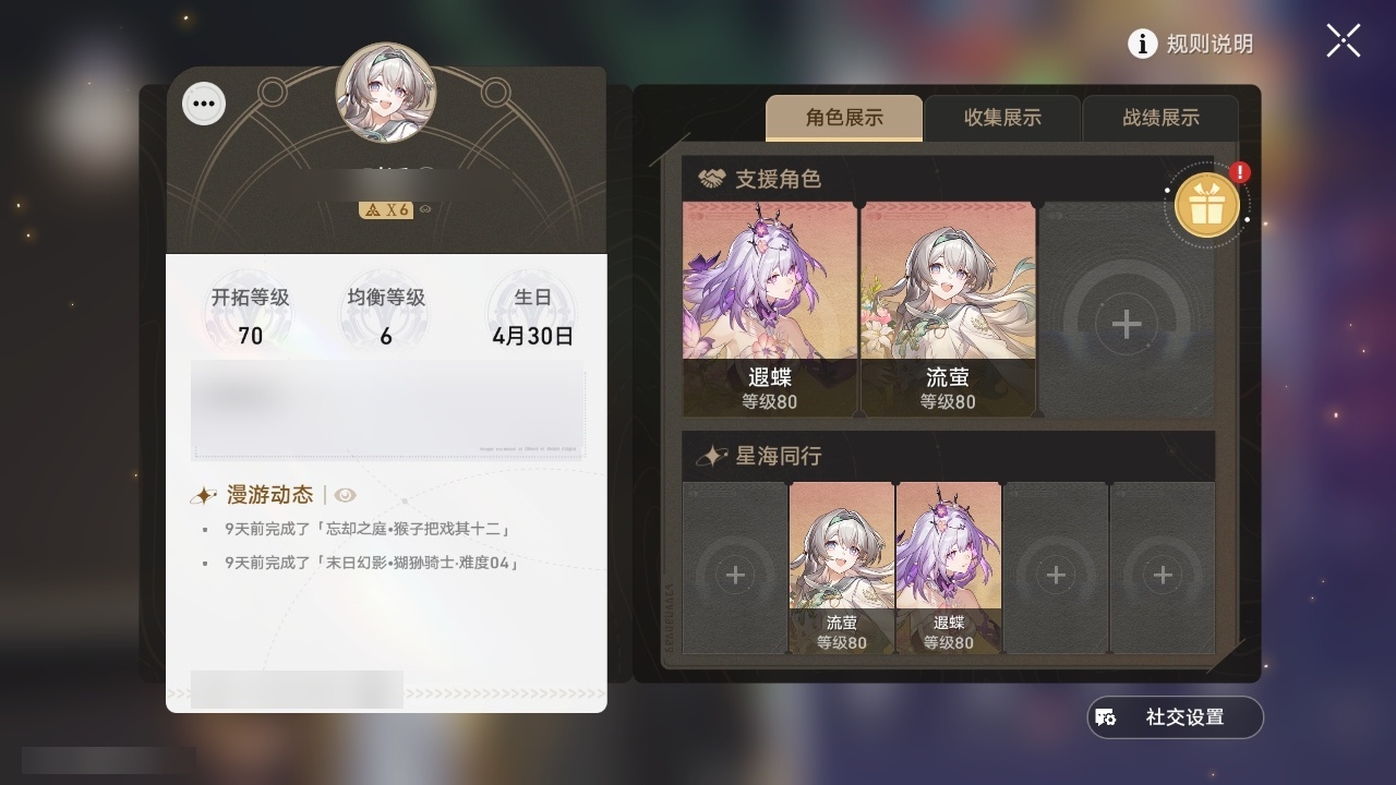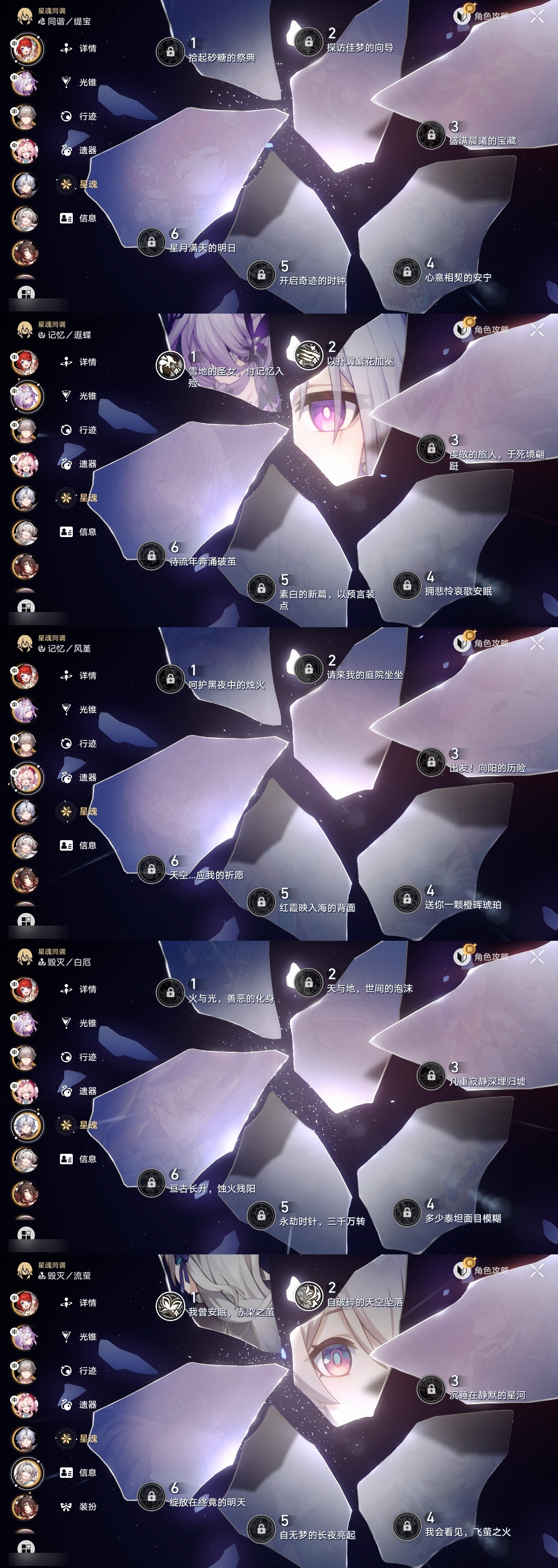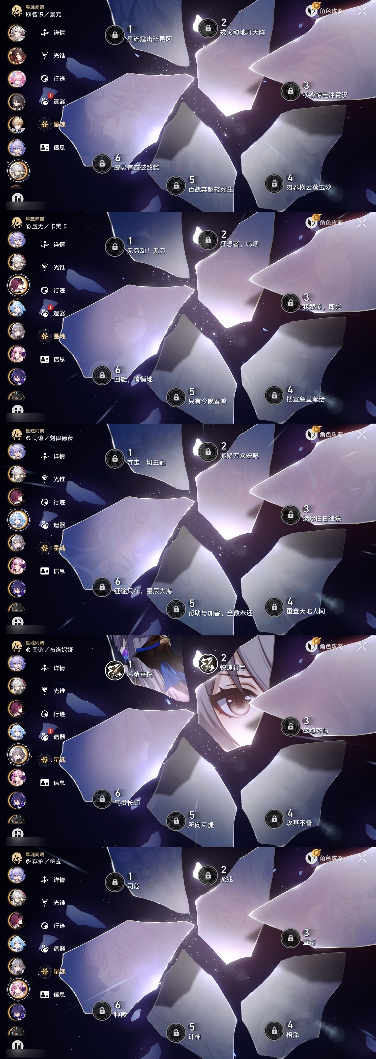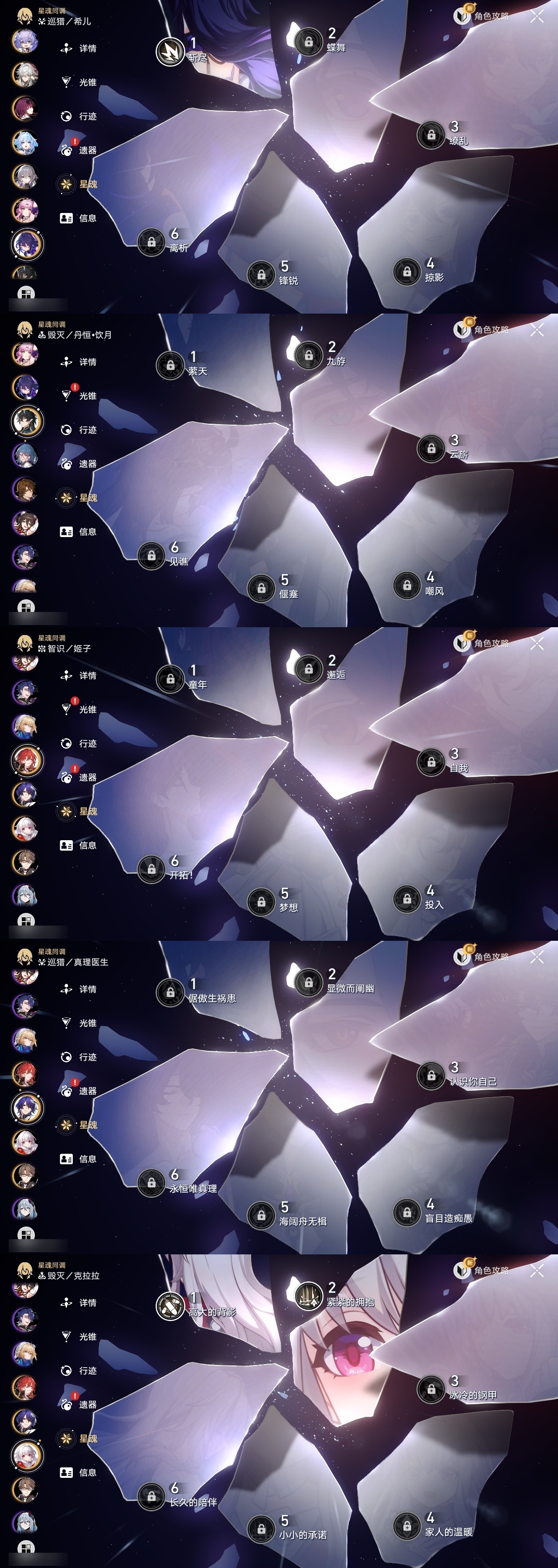 【崩坏·星穹铁道】【lyxq8793】冒险等级:70,男主,五星数量:37,五星角色:杰帕德 3命瓦尔特 3命白露 2命布洛妮娅 2命克拉拉 2命遐蝶 2命流萤 2命希儿 1命忘归人 1命景元姬子缇宝卡芙卡丹恒·饮月符玄真理医生风堇白厄archer刻律德菈丹恒·腾荒昔涟__五星光锥:记一位星神的陨落 4精记忆永不落幕 4精孤独的疗愈 3精星海巡航 2精无可取代的东西时节不居时节不居如泥酣眠如泥酣眠于夜色中比阳光更明亮的让告别,更美一些镜中故我理想燃烧的地狱梦应归于何处__四星角色:娜塔莎 6命虎克 6命黑塔 6命丹恒 6命艾丝妲 6命希露瓦 6命停云 6命桑博 6命三月七 6命青雀 6命佩拉 6命驭空 6命玲可 6命雪衣 6命米沙 6命加拉赫 6命卢卡 4命素裳 3命桂乃芬 3命阿兰 2命寒鸦 2命貊泽 1命