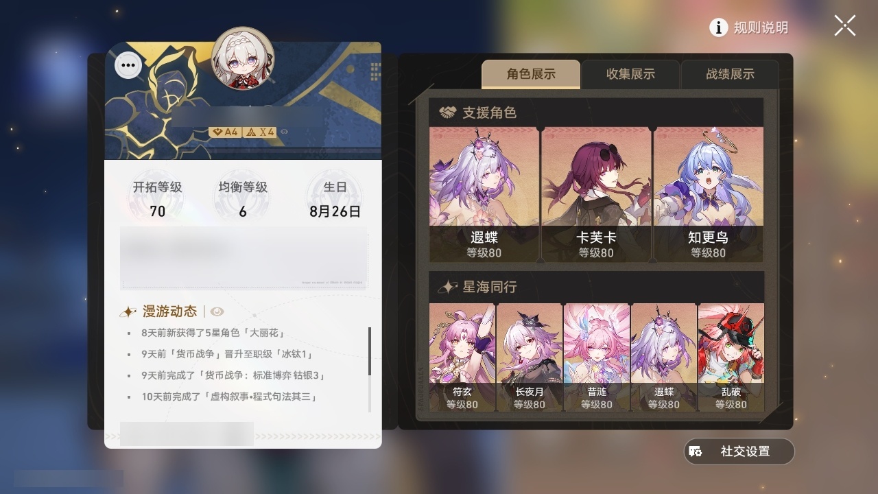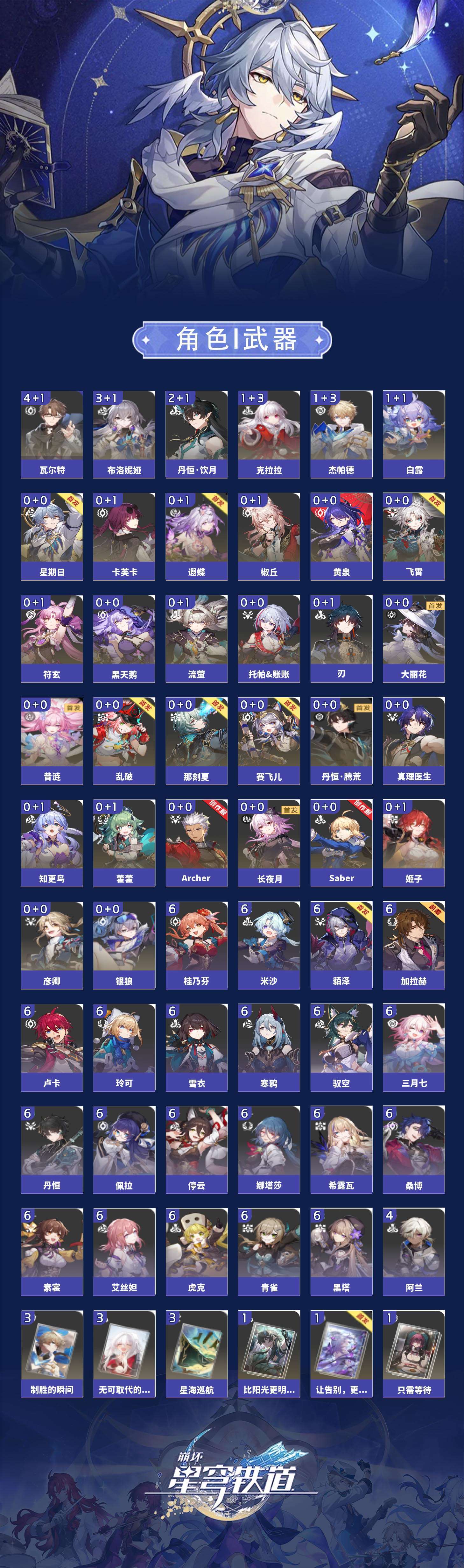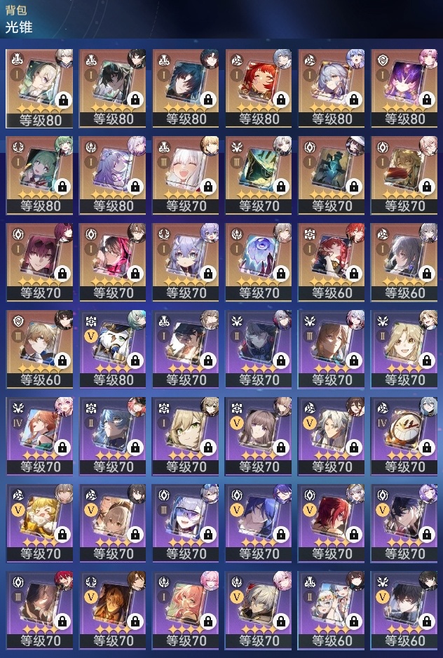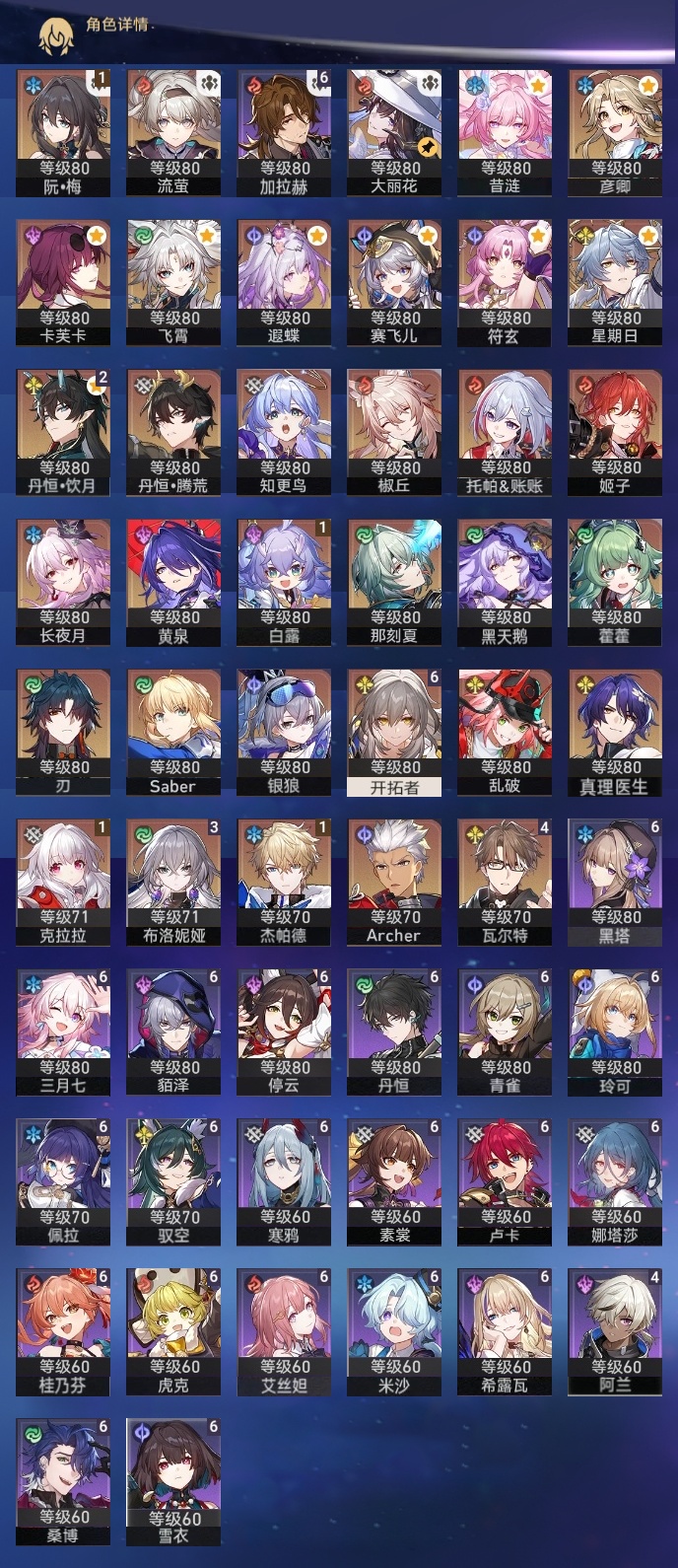 【崩坏·星穹铁道】【lyxq8785】冒险等级:70,女主,五星数量:51,五星角色:瓦尔特 4命布洛妮娅 3命丹恒·饮月 2命白露 1命杰帕德 1命克拉拉 1命椒丘飞霄银狼姬子彦卿乱破星期日刃卡芙卡遐蝶符玄托帕账账藿藿真理医生黑天鹅那刻夏黄泉知更鸟赛飞儿saberarcher长夜月丹恒·腾荒昔涟大丽花流萤__五星光锥:星海巡航 3精制胜的瞬间 3精无可取代的东西 3精那无数个春天银河铁道之夜以世界之名时节不居但战斗还未结束如果时间是一朵花到不了的彼岸孤独的疗愈只需等待比阳光更明亮的她已闭上双眼让告别,更美一些惊魂夜夜色流光溢彩记忆永不落幕梦应归于何处__四星角色:娜塔莎 6命虎克 6命貊泽 6命黑塔 6命丹恒 6命艾丝妲 6命希露瓦 6命停云 6命素裳 6命桑博 6命三月七 6命青雀 6命佩拉 6命驭空 6命卢卡 6命玲可 6命桂乃芬 6命寒鸦 6命雪衣 6命米沙 6命加拉赫 6命阿兰 4命