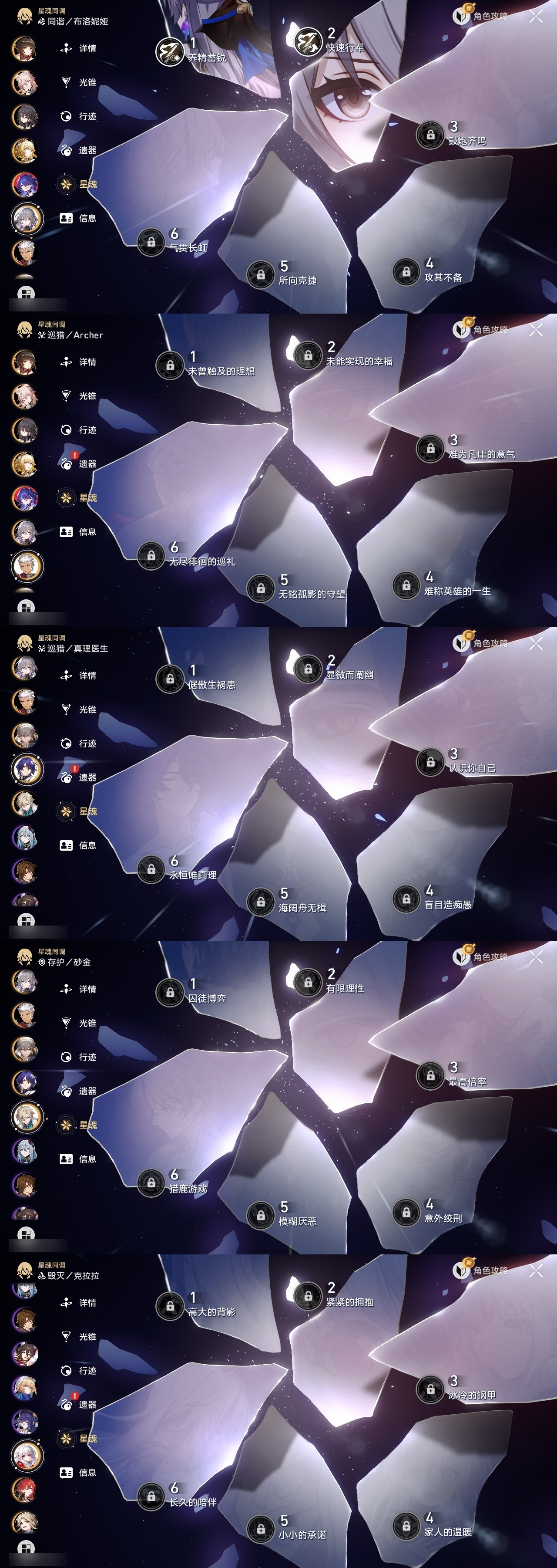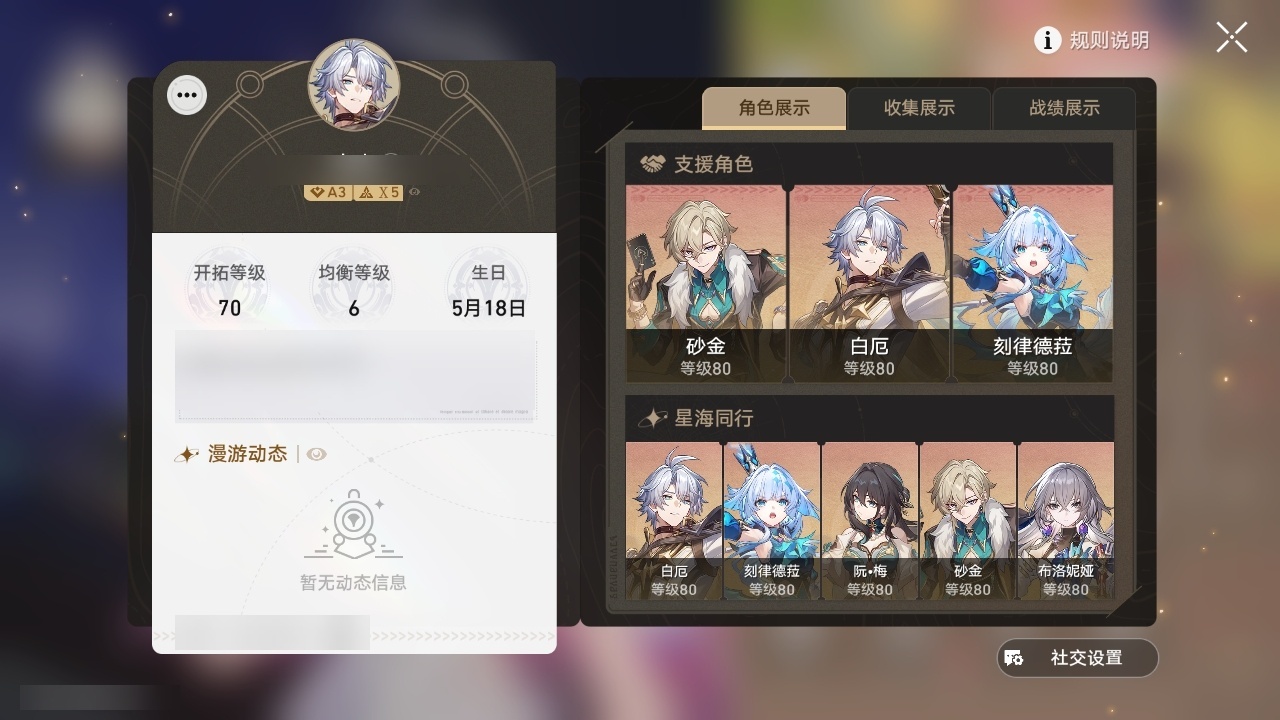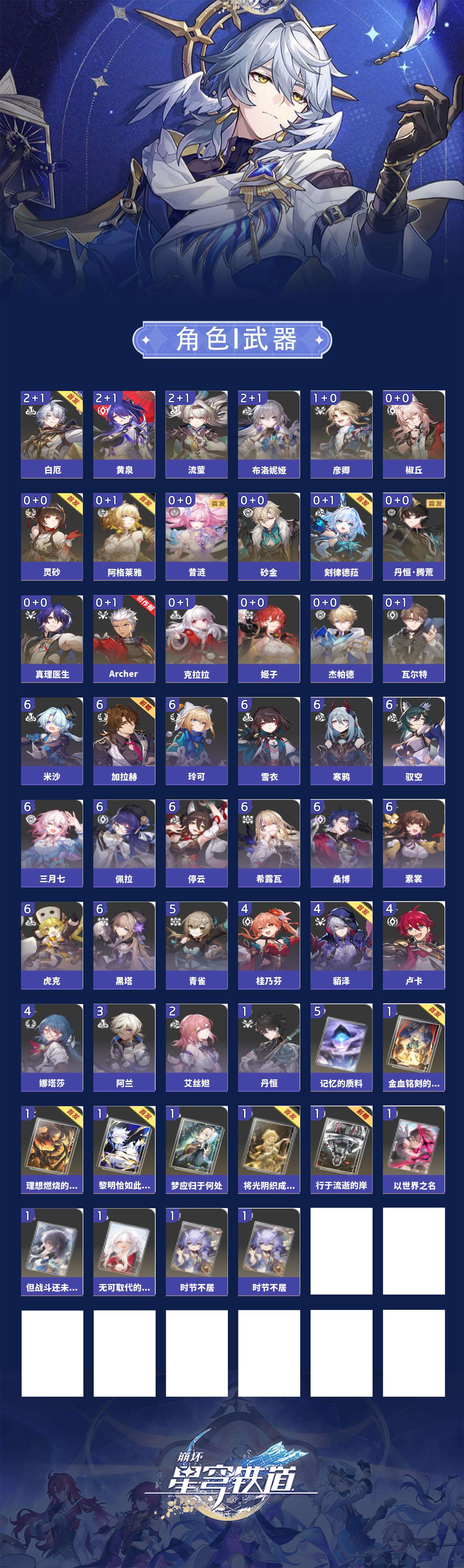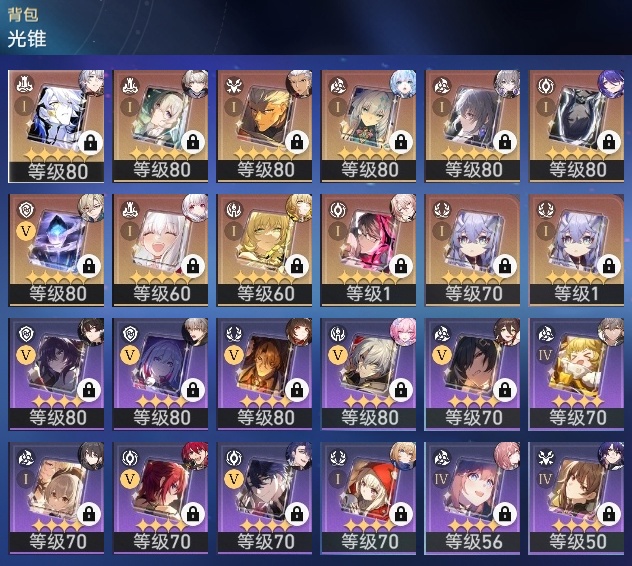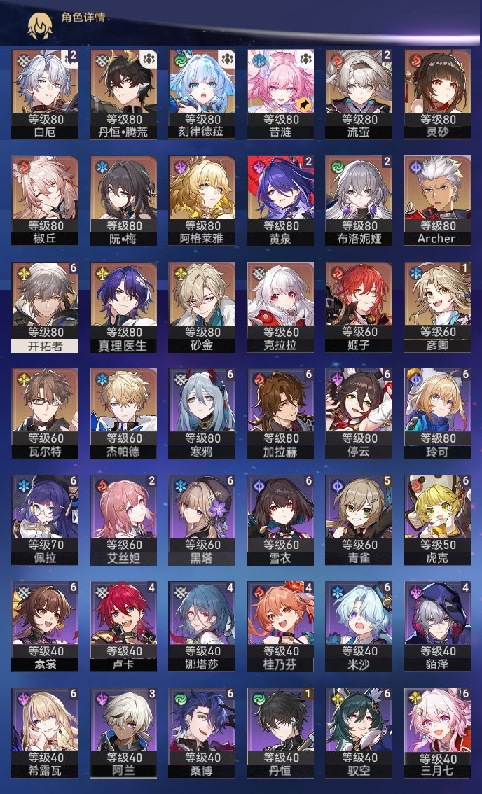 【崩坏·星穹铁道】【lyxq8865】冒险等级:70,男主,五星数量:30,五星角色:布洛妮娅 2命黄泉 2命白厄 2命流萤 2命彦卿 1命椒丘姬子灵砂杰帕德瓦尔特克拉拉阿格莱雅真理医生砂金archer刻律德菈丹恒·腾荒昔涟__五星光锥:记忆的质料 5精以世界之名无可取代的东西时节不居时节不居但战斗还未结束将光阴织成黄金行于流逝的岸黎明恰如此燃烧理想燃烧的地狱金血铭刻的时代梦应归于何处__四星角色:虎克 6命黑塔 6命希露瓦 6命停云 6命素裳 6命桑博 6命三月七 6命佩拉 6命驭空 6命玲可 6命寒鸦 6命雪衣 6命米沙 6命加拉赫 6命青雀 5命娜塔莎 4命貊泽 4命卢卡 4命桂乃芬 4命阿兰 3命艾丝妲 2命丹恒 1命