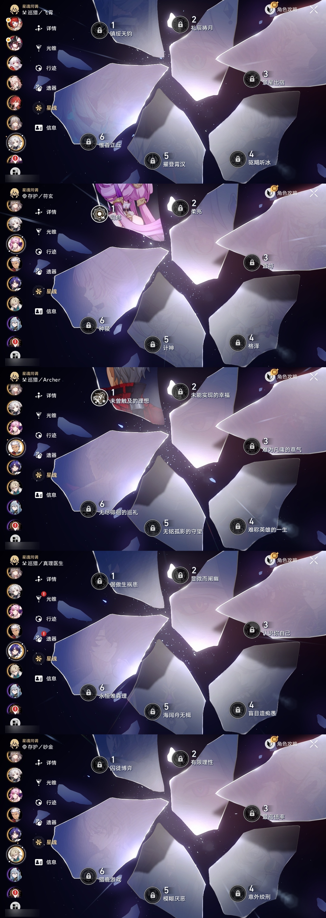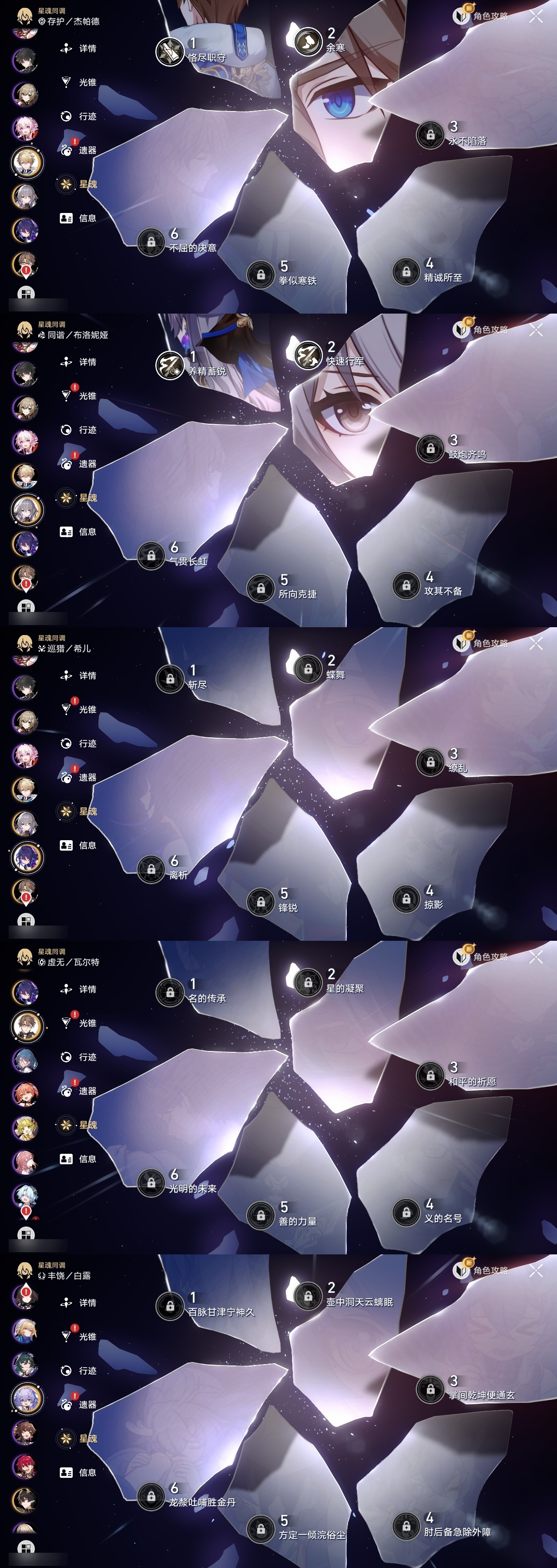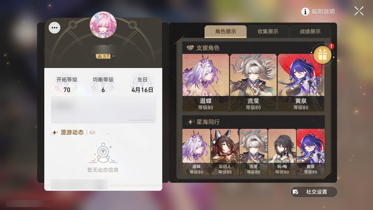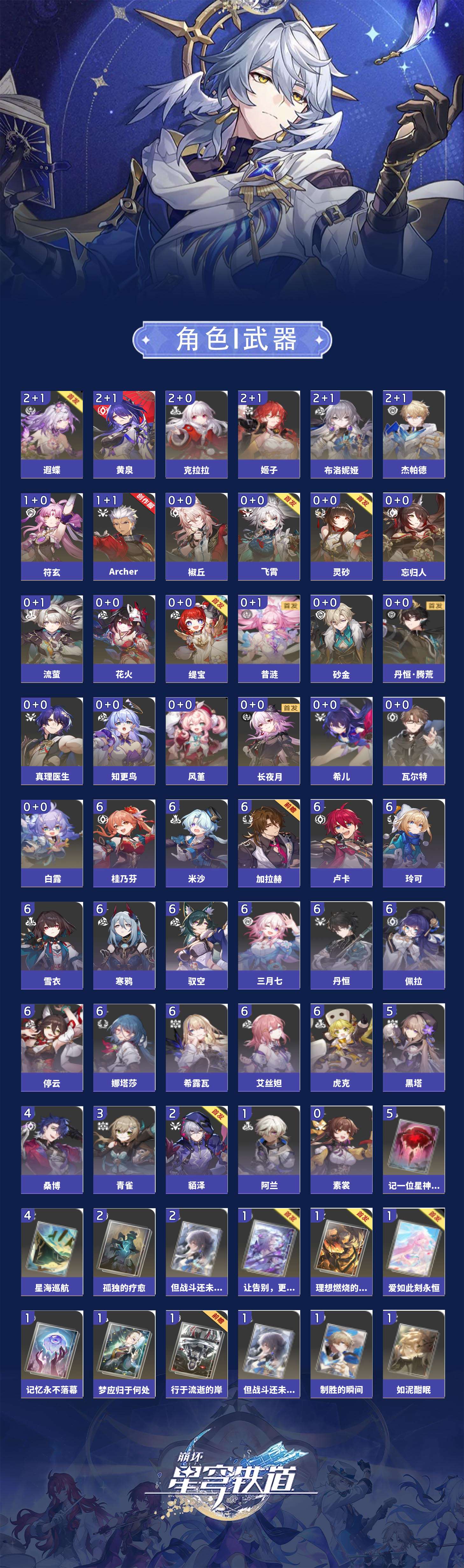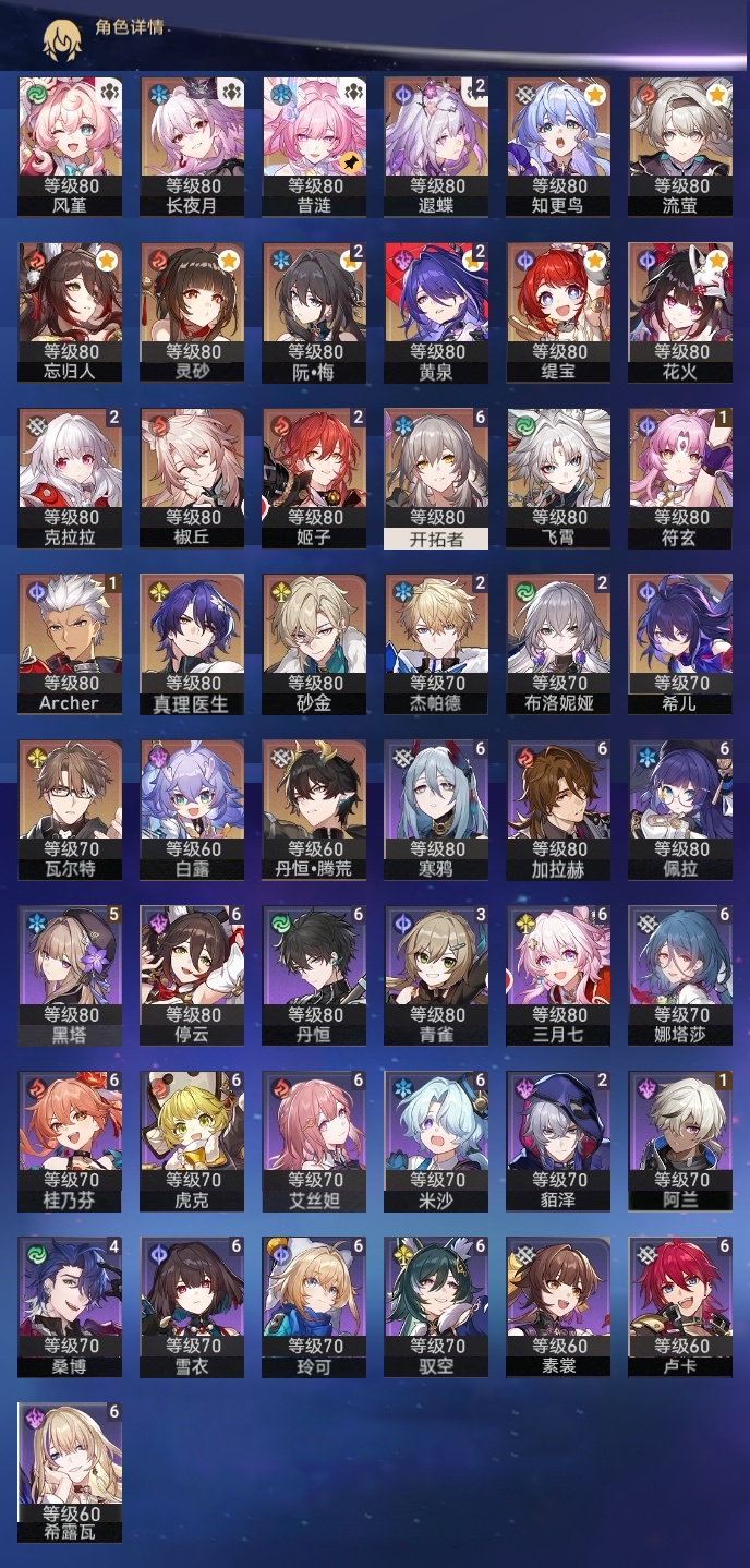 【崩坏·星穹铁道】【lyxq8850】冒险等级:70,女主,五星数量:41,五星角色:布洛妮娅 2命姬子 2命杰帕德 2命克拉拉 2命遐蝶 2命黄泉 2命符玄 1命archer 1命椒丘飞霄希儿白露灵砂瓦尔特忘归人缇宝真理医生花火风堇砂金知更鸟长夜月丹恒·腾荒昔涟流萤__五星光锥:记一位星神的陨落 5精星海巡航 4精但战斗还未结束 2精不息的演算 2精孤独的疗愈 2精记忆的质料制胜的瞬间银河铁道之夜如泥酣眠但战斗还未结束让告别,更美一些行于流逝的岸记忆永不落幕理想燃烧的地狱爱如此刻永恒梦应归于何处__四星角色:娜塔莎 6命虎克 6命丹恒 6命艾丝妲 6命希露瓦 6命停云 6命三月七 6命佩拉 6命驭空 6命卢卡 6命玲可 6命桂乃芬 6命寒鸦 6命雪衣 6命米沙 6命加拉赫 6命黑塔 5命桑博 4命青雀 3命貊泽 2命阿兰 1命素裳