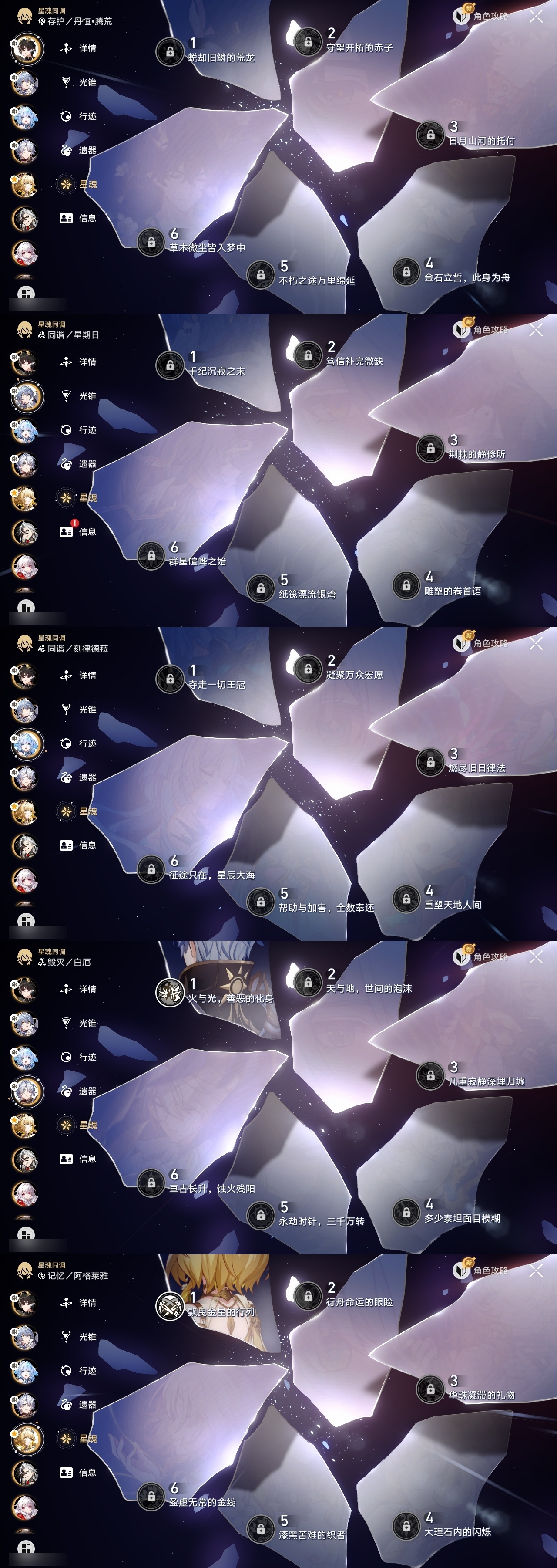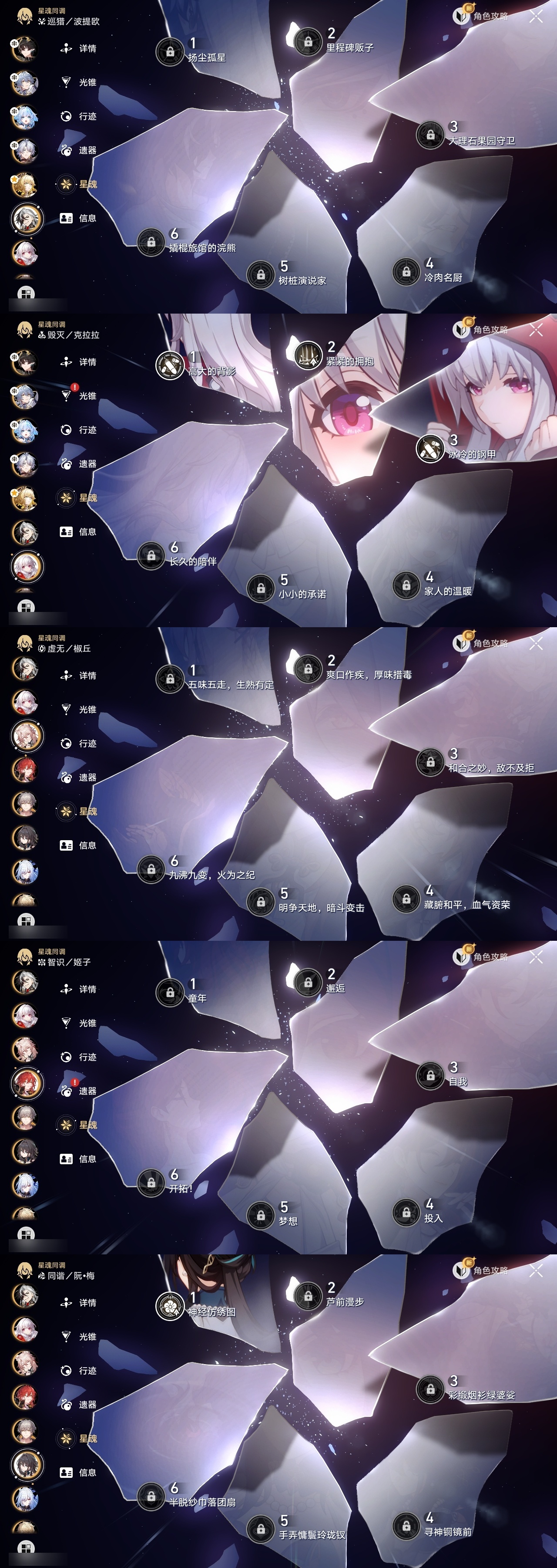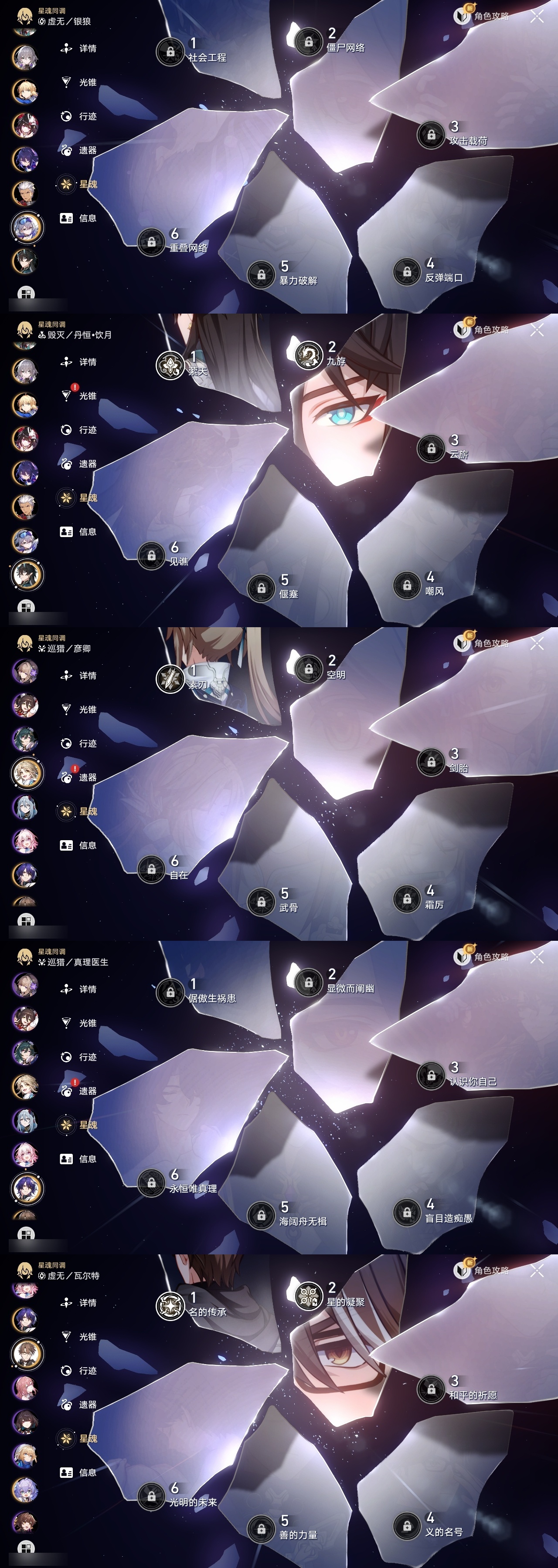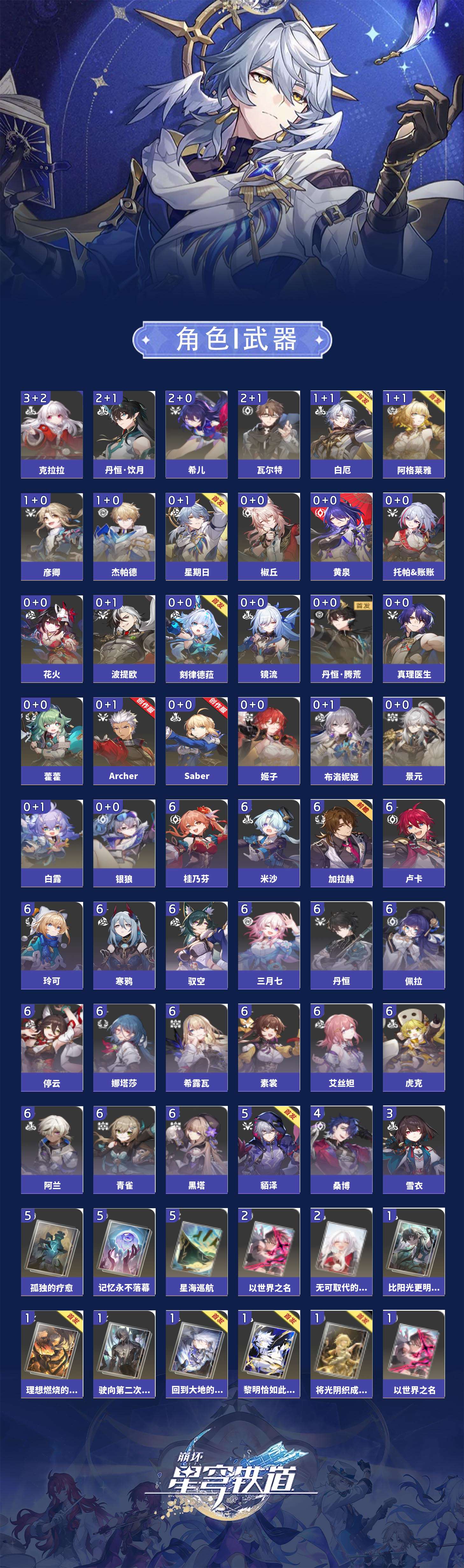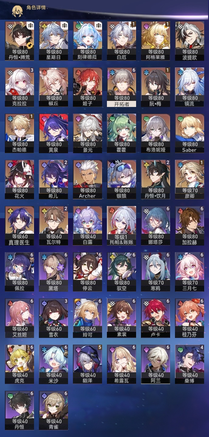 【崩坏·星穹铁道】【lyxq8821】冒险等级:70,男主,五星数量:42,五星角色:克拉拉 3命希儿 2命瓦尔特 2命丹恒·饮月 2命杰帕德 1命彦卿 1命阿格莱雅 1命白厄 1命椒丘银狼景元白露布洛妮娅姬子星期日镜流托帕账账藿藿真理医生花火黄泉saberarcher刻律德菈丹恒·腾荒波提欧__五星光锥:星海巡航 5精孤独的疗愈 5精记忆永不落幕 5精以世界之名 2精无可取代的东西 2精记忆的质料以世界之名时节不居时节不居但战斗还未结束回到大地的飞行将光阴织成黄金比阳光更明亮的黎明恰如此燃烧理想燃烧的地狱驶向第二次生命__四星角色:阿兰 6命娜塔莎 6命虎克 6命黑塔 6命丹恒 6命艾丝妲 6命希露瓦 6命停云 6命素裳 6命三月七 6命青雀 6命佩拉 6命驭空 6命卢卡 6命玲可 6命桂乃芬 6命寒鸦 6命米沙 6命加拉赫 6命貊泽 5命桑博 4命雪衣 3命