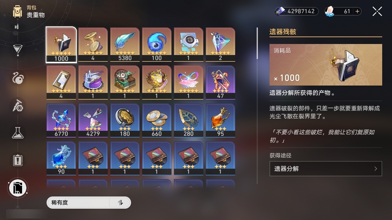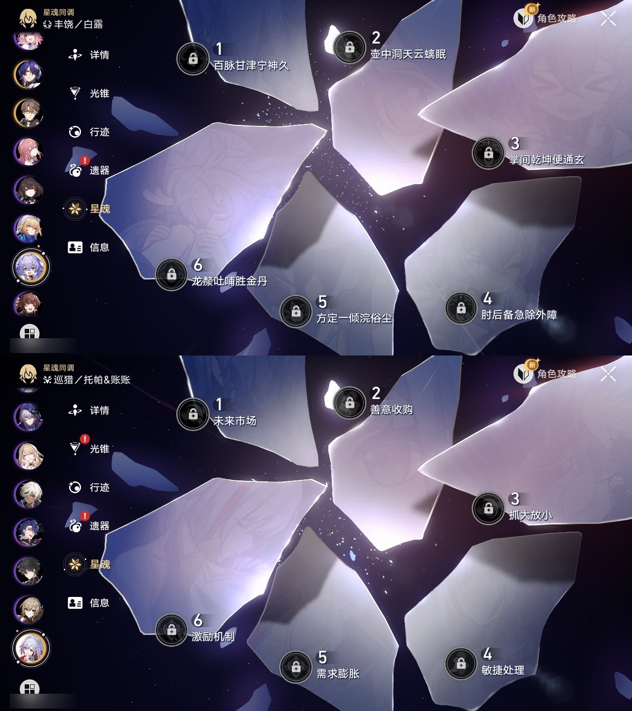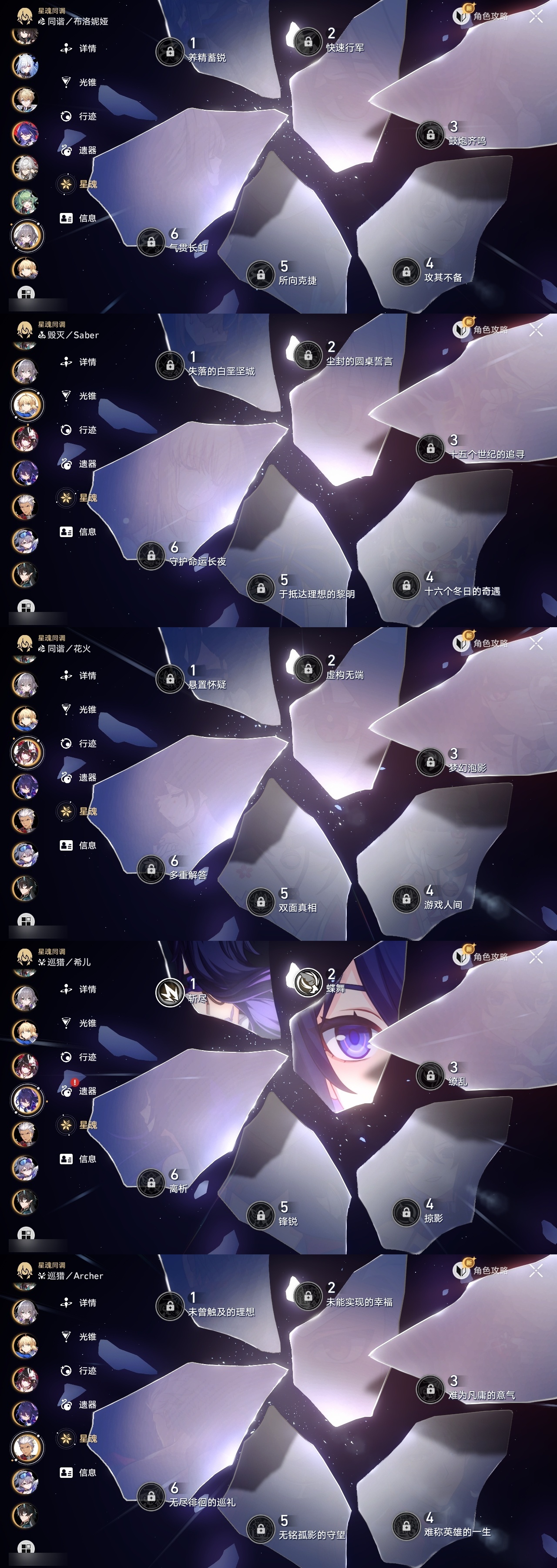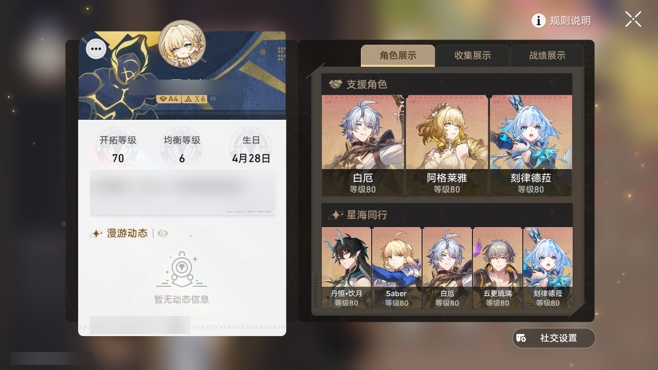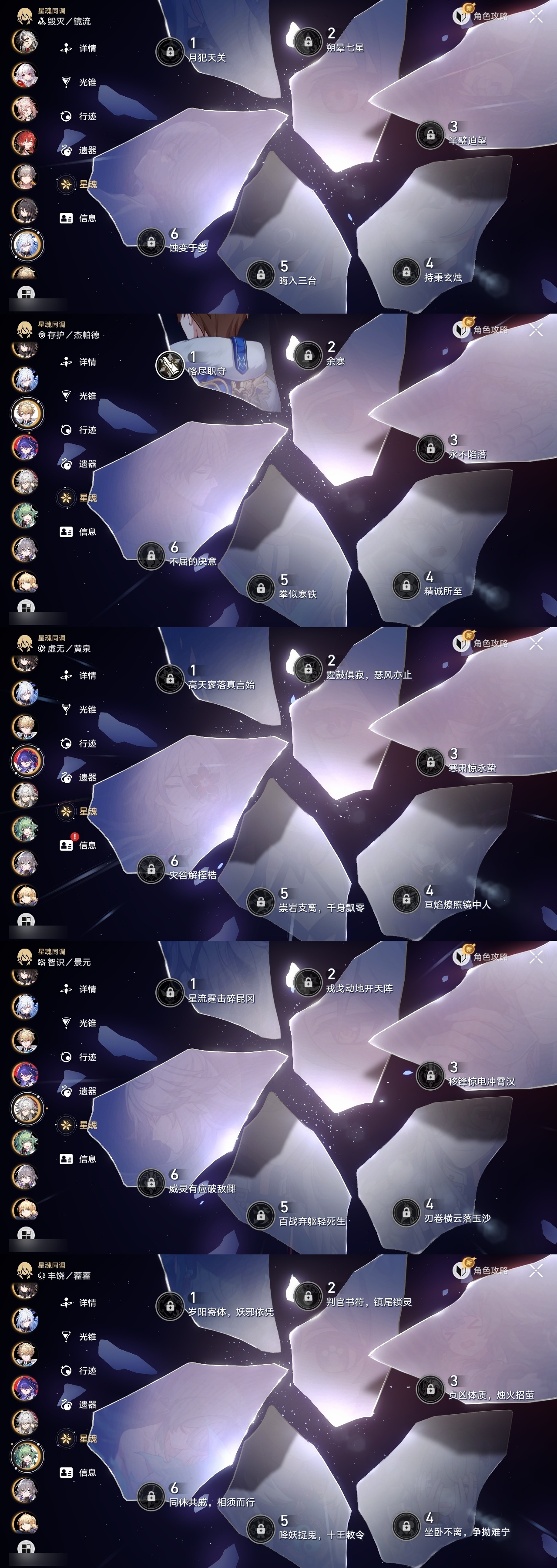 【崩坏·星穹铁道】【lyxq8821】冒险等级:70,男主,五星数量:42,五星角色:克拉拉 3命希儿 2命瓦尔特 2命丹恒·饮月 2命杰帕德 1命彦卿 1命阿格莱雅 1命白厄 1命椒丘银狼景元白露布洛妮娅姬子星期日镜流托帕账账藿藿真理医生花火黄泉saberarcher刻律德菈丹恒·腾荒波提欧__五星光锥:星海巡航 5精孤独的疗愈 5精记忆永不落幕 5精以世界之名 2精无可取代的东西 2精记忆的质料以世界之名时节不居时节不居但战斗还未结束回到大地的飞行将光阴织成黄金比阳光更明亮的黎明恰如此燃烧理想燃烧的地狱驶向第二次生命__四星角色:阿兰 6命娜塔莎 6命虎克 6命黑塔 6命丹恒 6命艾丝妲 6命希露瓦 6命停云 6命素裳 6命三月七 6命青雀 6命佩拉 6命驭空 6命卢卡 6命玲可 6命桂乃芬 6命寒鸦 6命米沙 6命加拉赫 6命貊泽 5命桑博 4命雪衣 3命