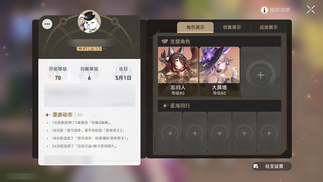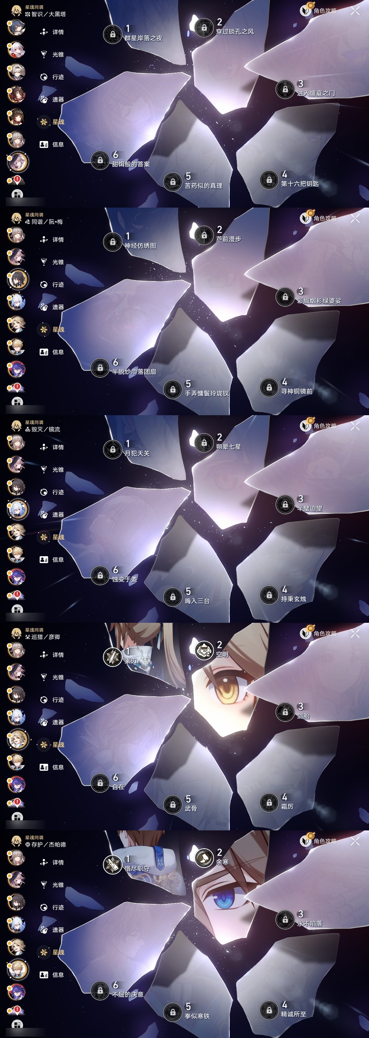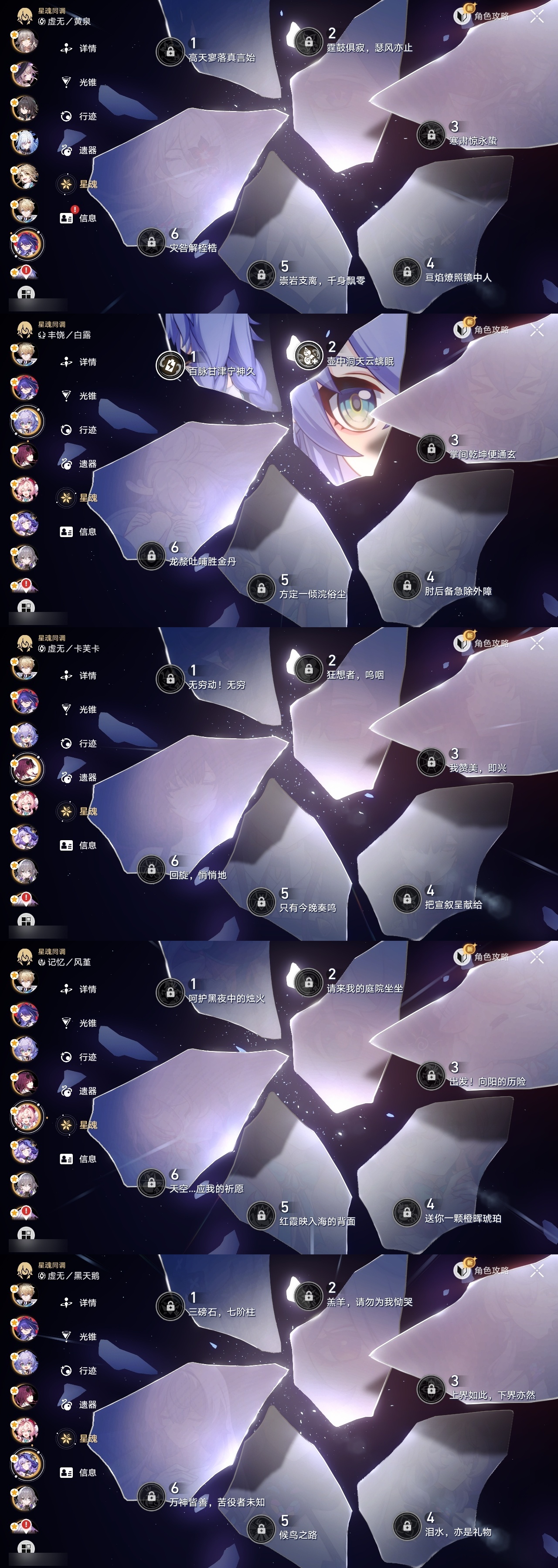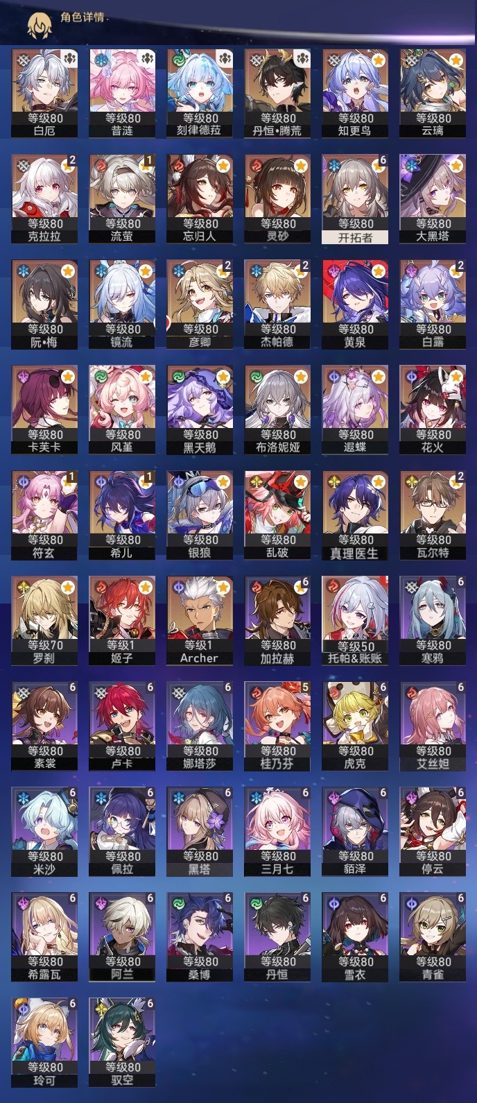 【崩坏·星穹铁道】【lyxq8855】冒险等级:70,女主,五星数量:48,五星角色:白露 2命杰帕德 2命彦卿 2命瓦尔特 2命克拉拉 2命希儿 1命符玄 1命流萤 1命云璃银狼布洛妮娅姬子灵砂乱破大黑塔忘归人罗刹卡芙卡遐蝶镜流托帕账账真理医生黑天鹅花火黄泉风堇知更鸟白厄archer刻律德菈丹恒·腾荒昔涟__五星光锥:星海巡航 5精记忆的质料 5精记一位星神的陨落 5精不息的演算 5精孤独的疗愈 5精记忆永不落幕 5精银河铁道之夜 2精无可取代的东西 2精制胜的瞬间但战斗还未结束于夜色中拂晓之前此身为剑镜中故我行于流逝的岸爱如此刻永恒__四星角色:阿兰 6命娜塔莎 6命虎克 6命貊泽 6命黑塔 6命丹恒 6命艾丝妲 6命希露瓦 6命停云 6命素裳 6命桑博 6命三月七 6命青雀 6命佩拉 6命驭空 6命卢卡 6命玲可 6命寒鸦 6命雪衣 6命米沙 6命加拉赫 6命桂乃芬 5命