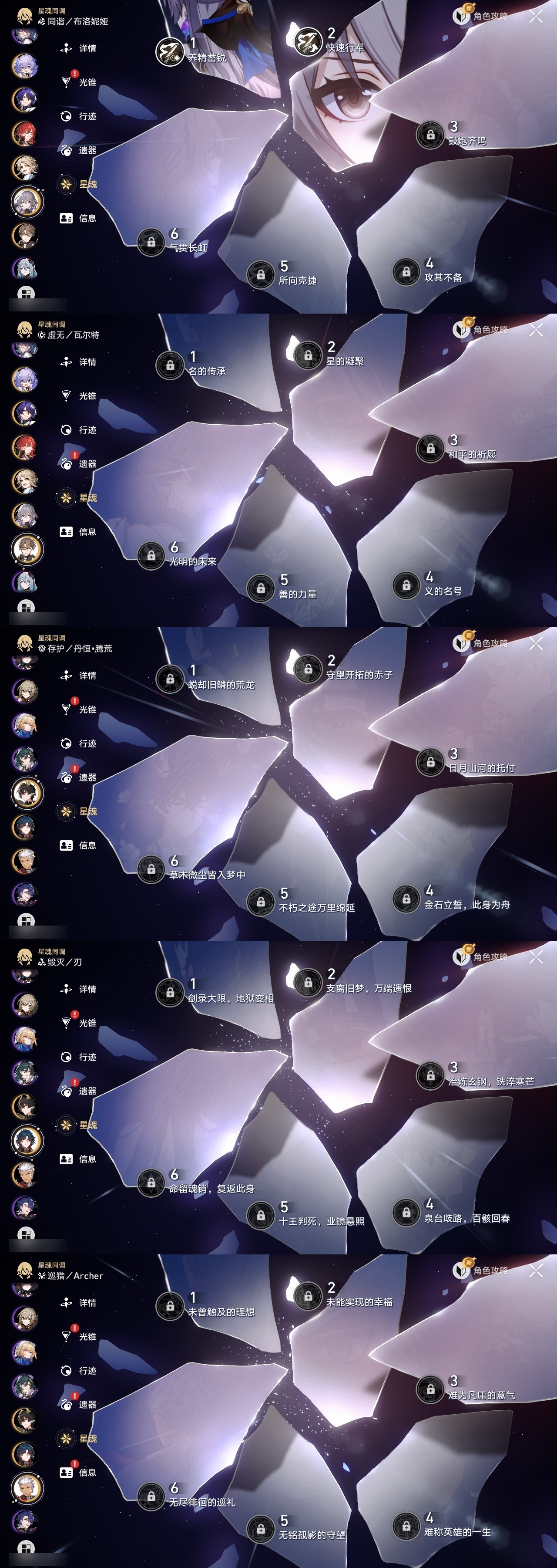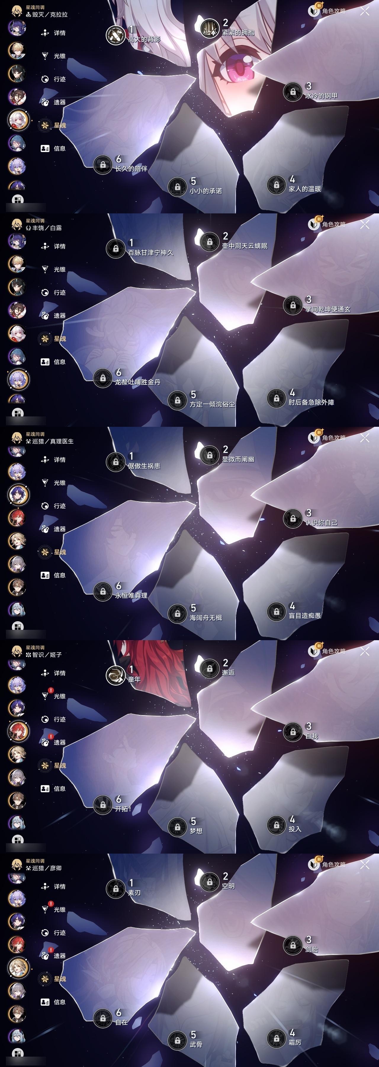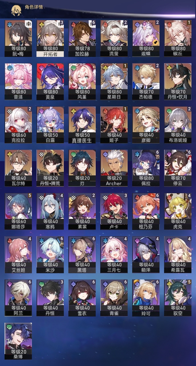 【崩坏·星穹铁道】【lyxq8848】冒险等级:70,女主,五星数量:26,五星角色:布洛妮娅 2命杰帕德 2命克拉拉 2命遐蝶 2命流萤 2命椒丘 1命姬子 1命星期日 1命白露彦卿瓦尔特刃丹恒·饮月真理医生黄泉风堇archer丹恒·腾荒昔涟__五星光锥:记一位星神的陨落 5精记忆永不落幕 5精以世界之名 3精制胜的瞬间无可取代的东西让告别,更美一些行于流逝的岸__四星角色:阿兰 6命黑塔 6命停云 6命青雀 6命佩拉 6命玲可 6命桂乃芬 6命雪衣 6命米沙 6命加拉赫 6命娜塔莎 5命驭空 5命貊泽 4命虎克 4命艾丝妲 4命希露瓦 4命三月七 4命寒鸦 4命丹恒 3命卢卡 3命素裳 2命桑博
