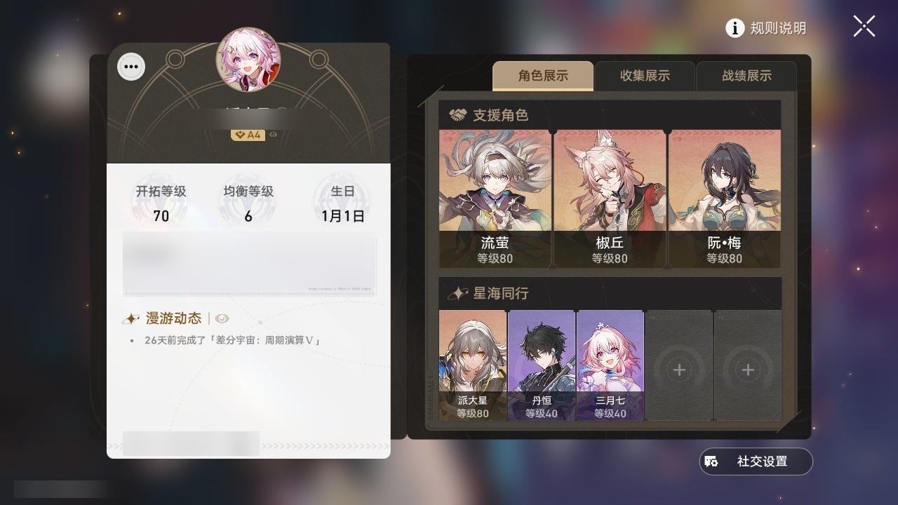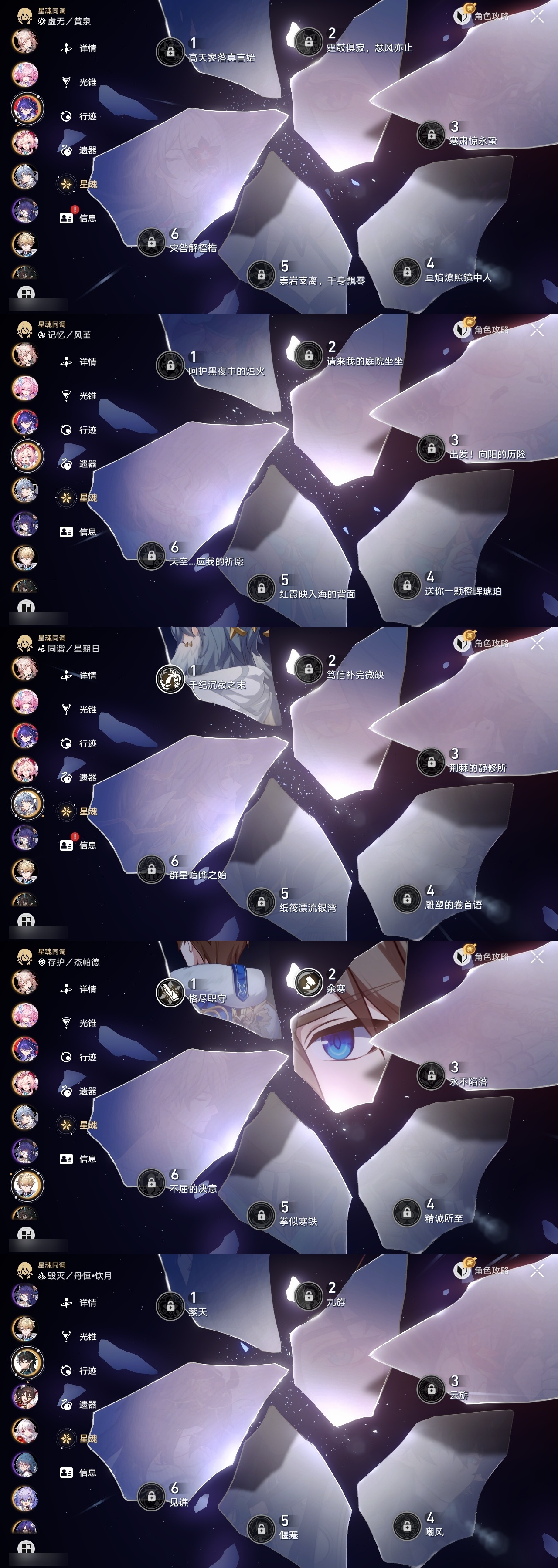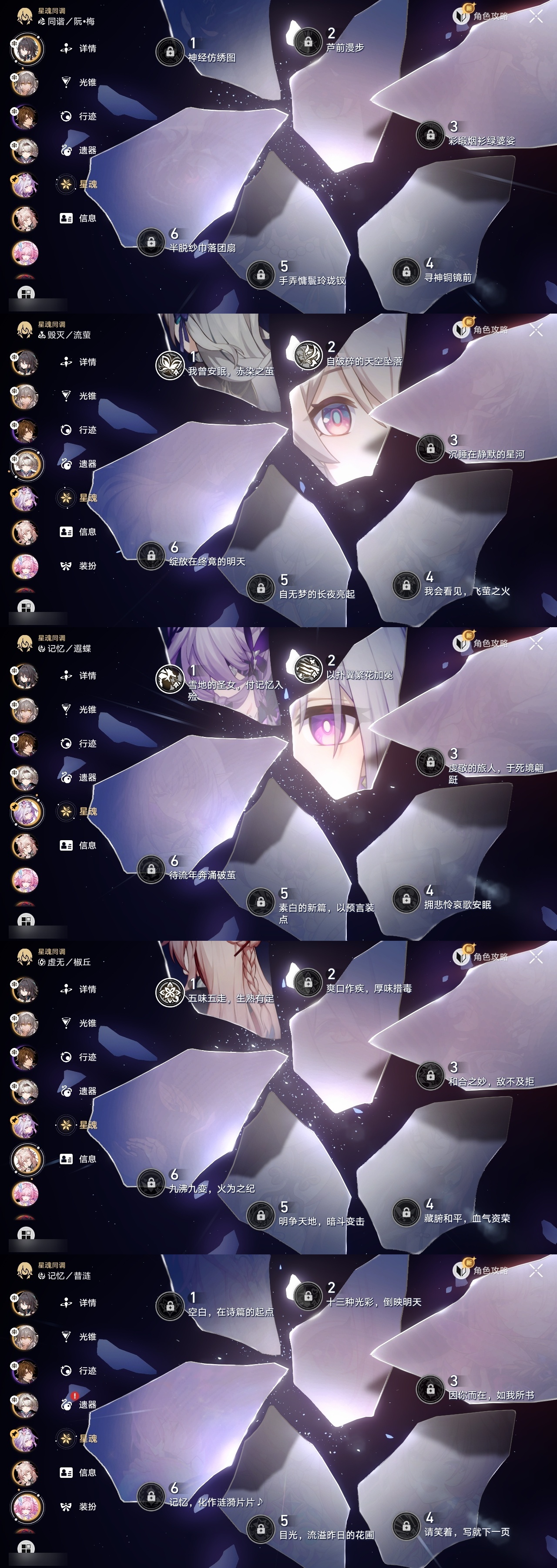 【崩坏·星穹铁道】【lyxq8848】冒险等级:70,女主,五星数量:26,五星角色:布洛妮娅 2命杰帕德 2命克拉拉 2命遐蝶 2命流萤 2命椒丘 1命姬子 1命星期日 1命白露彦卿瓦尔特刃丹恒·饮月真理医生黄泉风堇archer丹恒·腾荒昔涟__五星光锥:记一位星神的陨落 5精记忆永不落幕 5精以世界之名 3精制胜的瞬间无可取代的东西让告别,更美一些行于流逝的岸__四星角色:阿兰 6命黑塔 6命停云 6命青雀 6命佩拉 6命玲可 6命桂乃芬 6命雪衣 6命米沙 6命加拉赫 6命娜塔莎 5命驭空 5命貊泽 4命虎克 4命艾丝妲 4命希露瓦 4命三月七 4命寒鸦 4命丹恒 3命卢卡 3命素裳 2命桑博