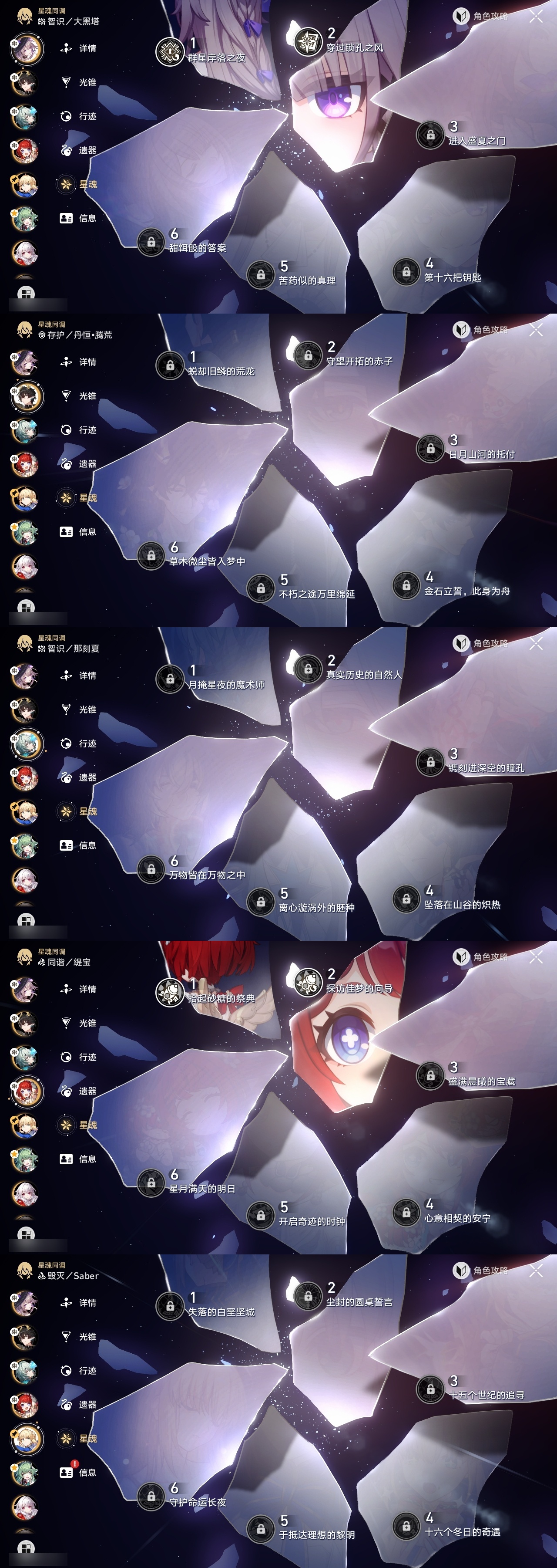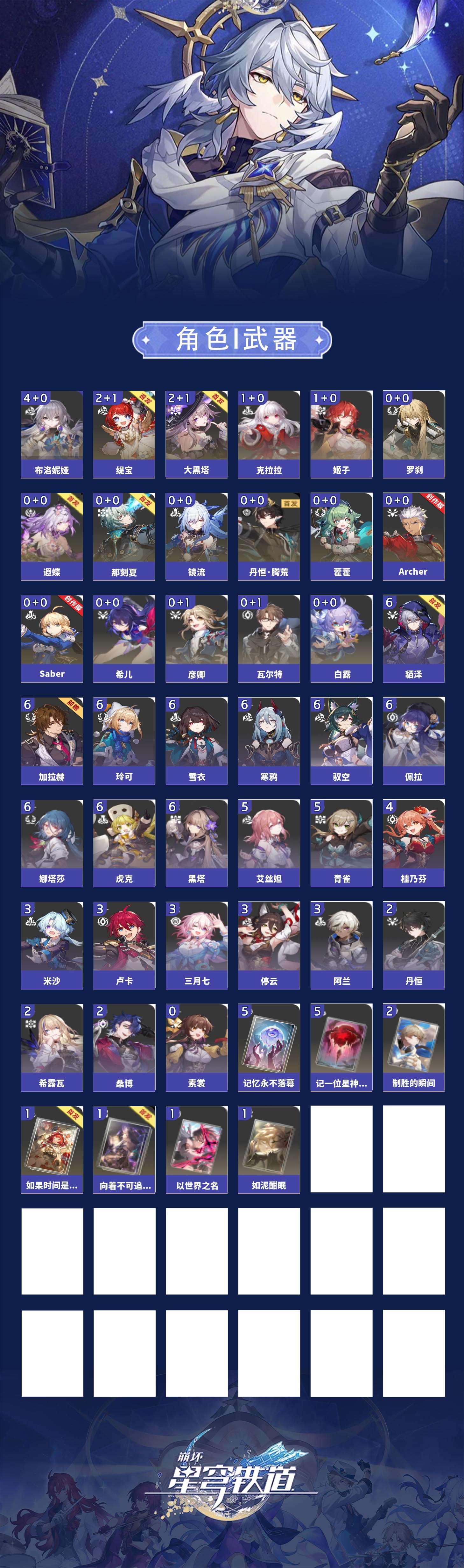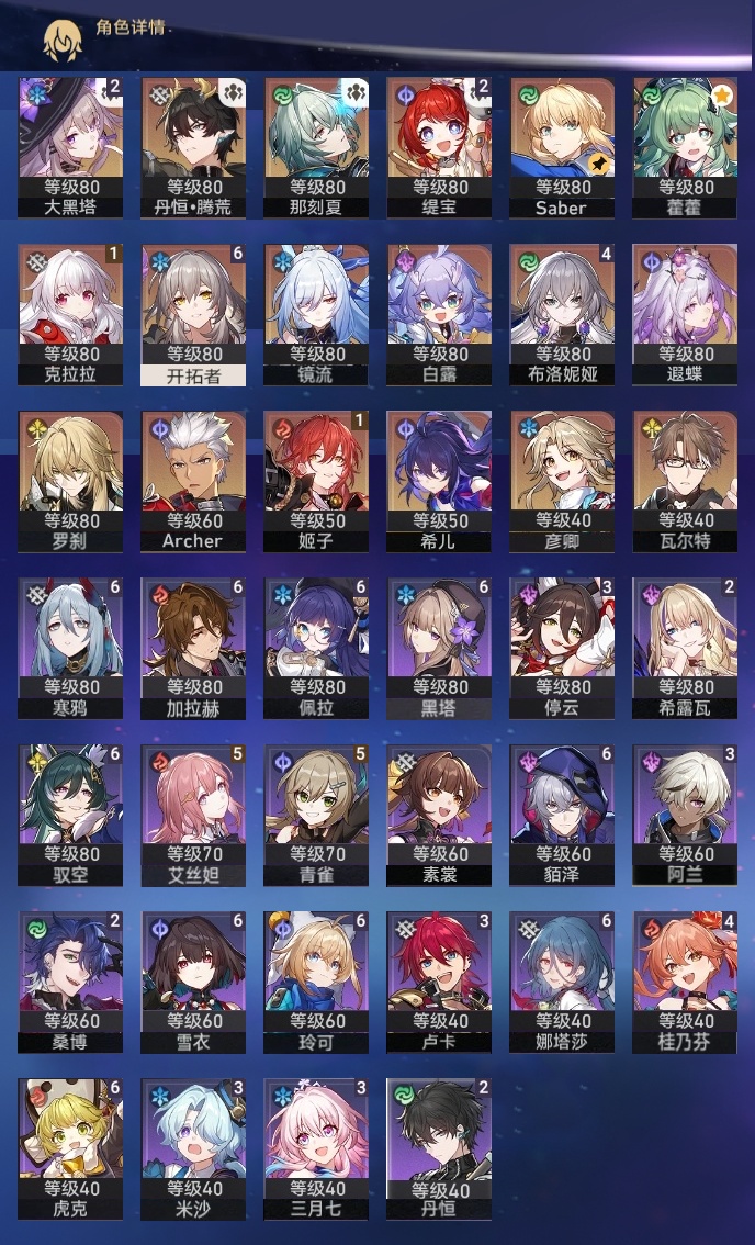 【崩坏·星穹铁道】【lyxq8908】冒险等级:70,女主,五星数量:25,五星角色:布洛妮娅 4命大黑塔 2命缇宝 2命姬子 1命克拉拉 1命希儿白露彦卿瓦尔特罗刹遐蝶镜流藿藿那刻夏saberarcher丹恒·腾荒__五星光锥:记一位星神的陨落 5精不息的演算 5精记忆永不落幕 5精制胜的瞬间 2精以世界之名如泥酣眠向着不可追问处如果时间是一朵花__四星角色:娜塔莎 6命虎克 6命貊泽 6命黑塔 6命佩拉 6命驭空 6命玲可 6命寒鸦 6命雪衣 6命加拉赫 6命艾丝妲 5命青雀 5命桂乃芬 4命阿兰 3命停云 3命三月七 3命卢卡 3命米沙 3命丹恒 2命希露瓦 2命桑博 2命素裳