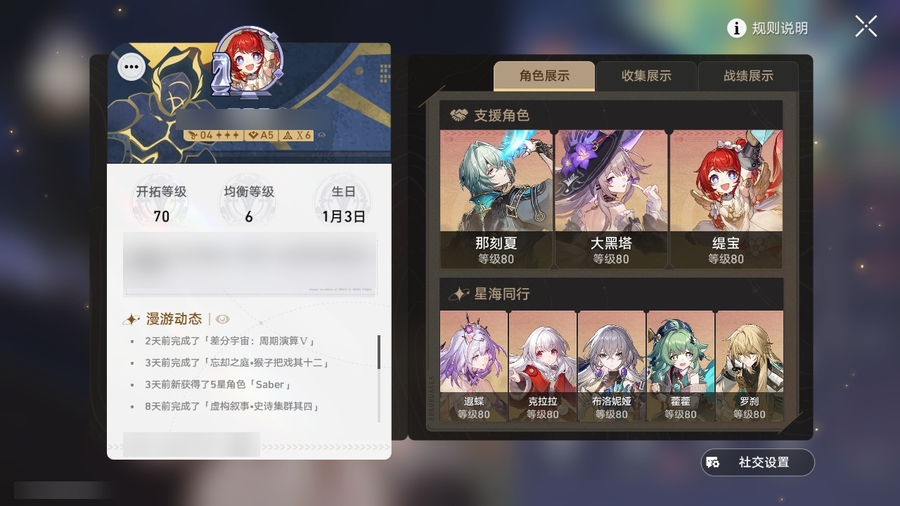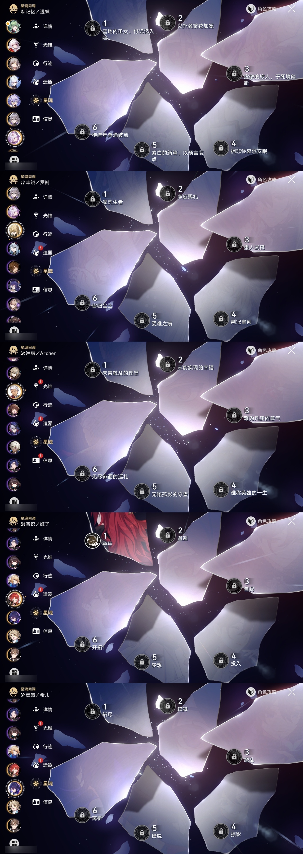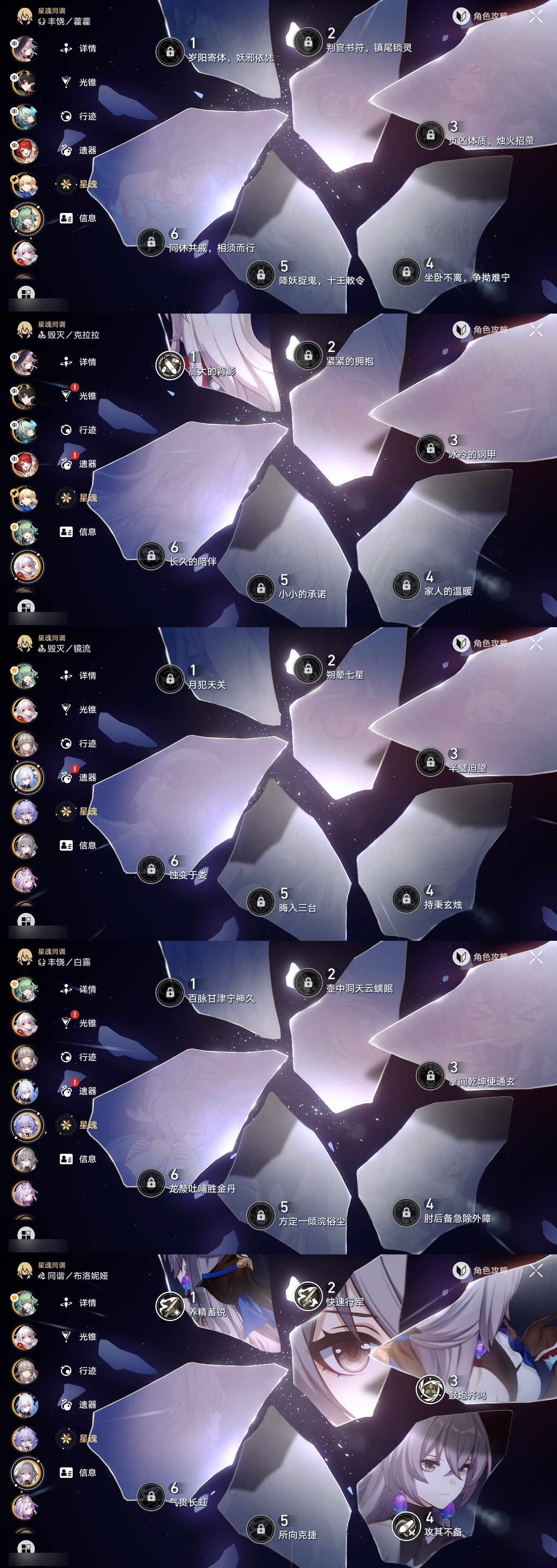【崩坏·星穹铁道】【lyxq8908】冒险等级:70,女主,五星数量:25,五星角色:布洛妮娅 4命大黑塔 2命缇宝 2命姬子 1命克拉拉 1命希儿白露彦卿瓦尔特罗刹遐蝶镜流藿藿那刻夏saberarcher丹恒·腾荒__五星光锥:记一位星神的陨落 5精不息的演算 5精记忆永不落幕 5精制胜的瞬间 2精以世界之名如泥酣眠向着不可追问处如果时间是一朵花__四星角色:娜塔莎 6命虎克 6命貊泽 6命黑塔 6命佩拉 6命驭空 6命玲可 6命寒鸦 6命雪衣 6命加拉赫 6命艾丝妲 5命青雀 5命桂乃芬 4命阿兰 3命停云 3命三月七 3命卢卡 3命米沙 3命丹恒 2命希露瓦 2命桑博 2命素裳