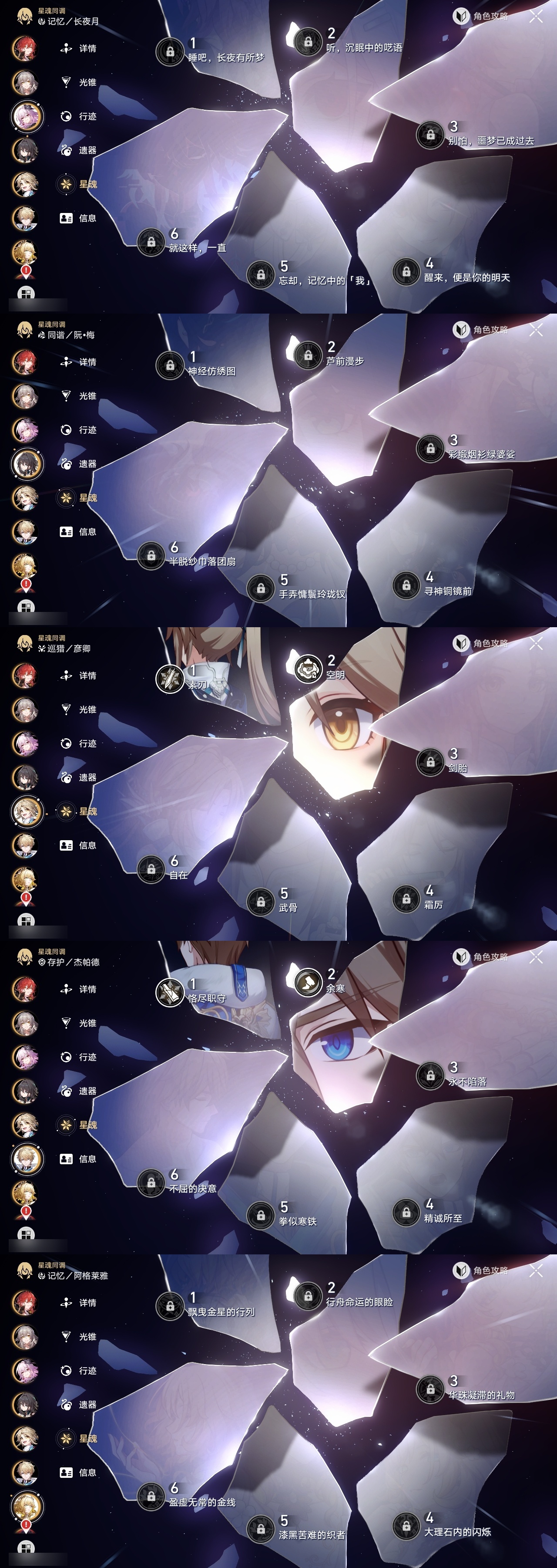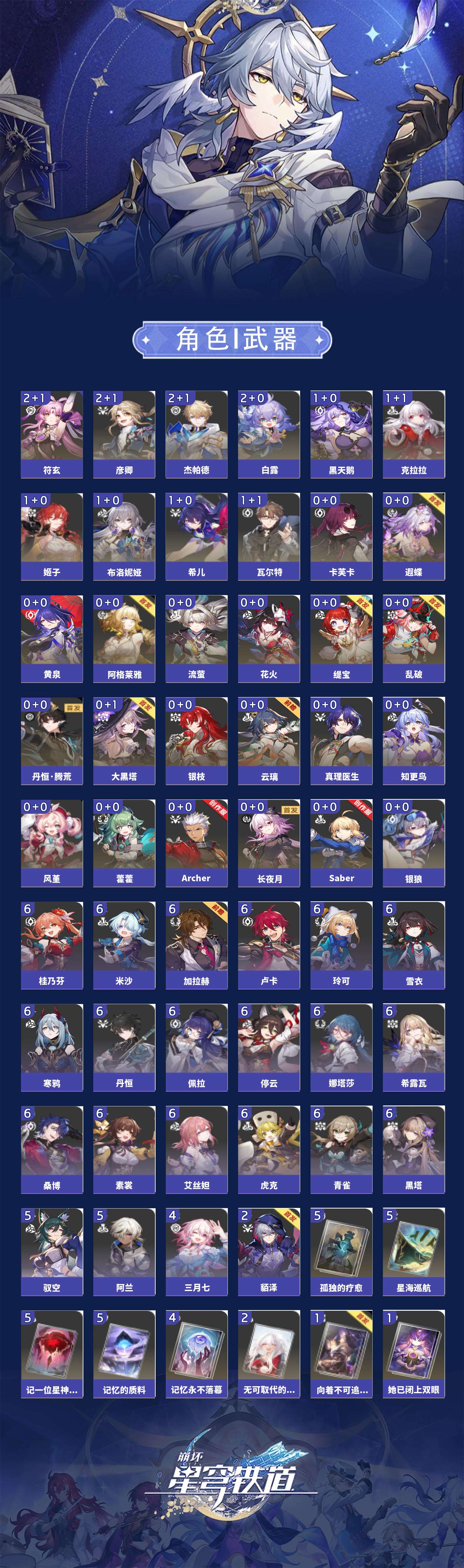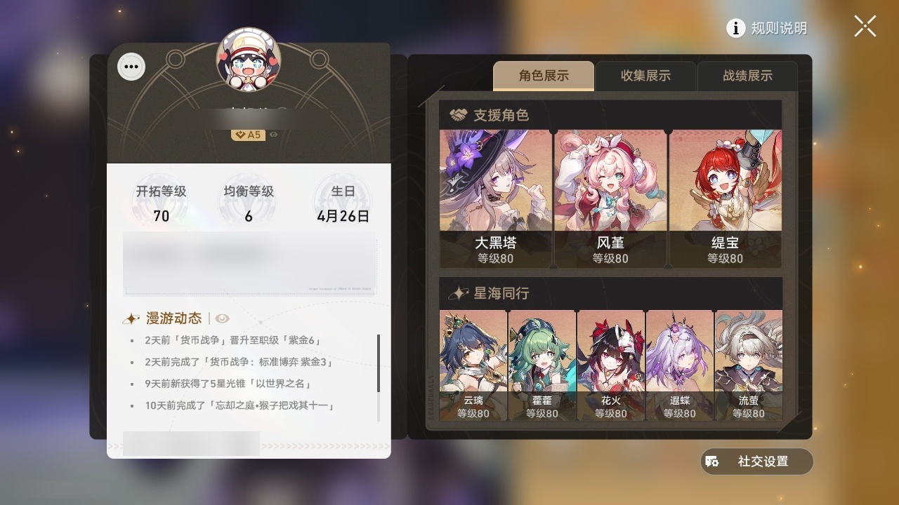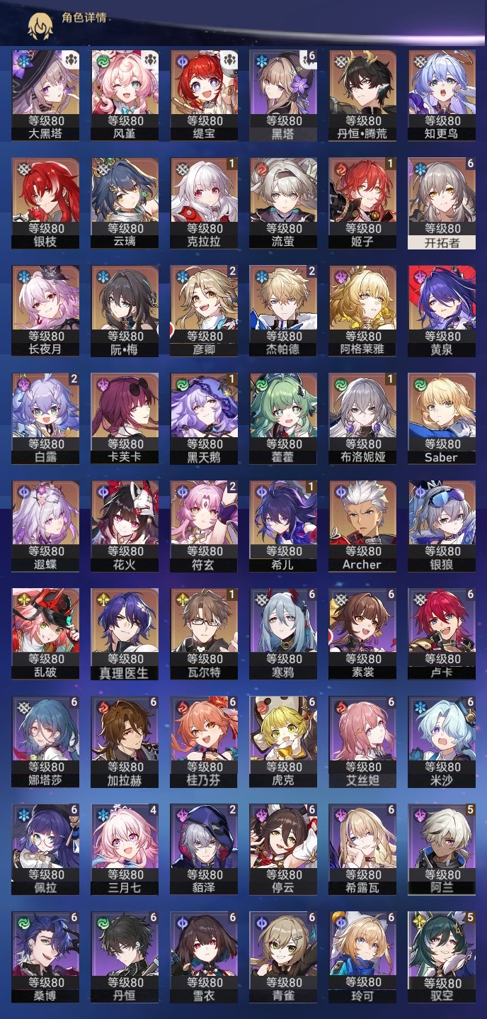 【崩坏·星穹铁道】【lyxq8924】冒险等级:70,女主,五星数量:43,五星角色:白露 2命杰帕德 2命彦卿 2命符玄 2命希儿 1命布洛妮娅 1命姬子 1命瓦尔特 1命克拉拉 1命黑天鹅 1命云璃银狼乱破大黑塔阿格莱雅缇宝卡芙卡遐蝶藿藿银枝真理医生花火黄泉风堇知更鸟saberarcher长夜月丹恒·腾荒流萤__五星光锥:星海巡航 5精记忆的质料 5精记一位星神的陨落 5精不息的演算 5精孤独的疗愈 5精记忆永不落幕 4精无可取代的东西 2精制胜的瞬间以世界之名无可取代的东西如泥酣眠向着不可追问处她已闭上双眼__四星角色:娜塔莎 6命虎克 6命黑塔 6命丹恒 6命艾丝妲 6命希露瓦 6命停云 6命素裳 6命桑博 6命青雀 6命佩拉 6命卢卡 6命玲可 6命桂乃芬 6命寒鸦 6命雪衣 6命米沙 6命加拉赫 6命阿兰 5命驭空 5命三月七 4命貊泽 2命