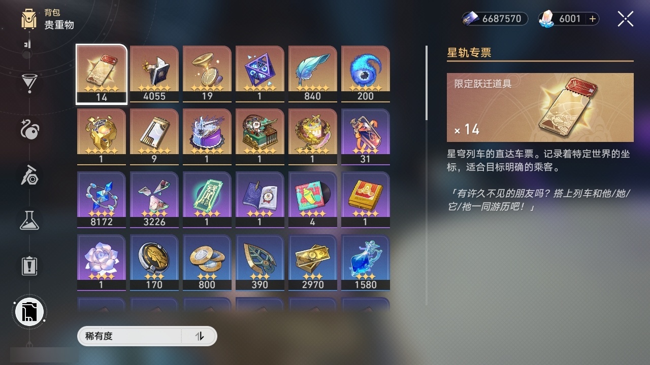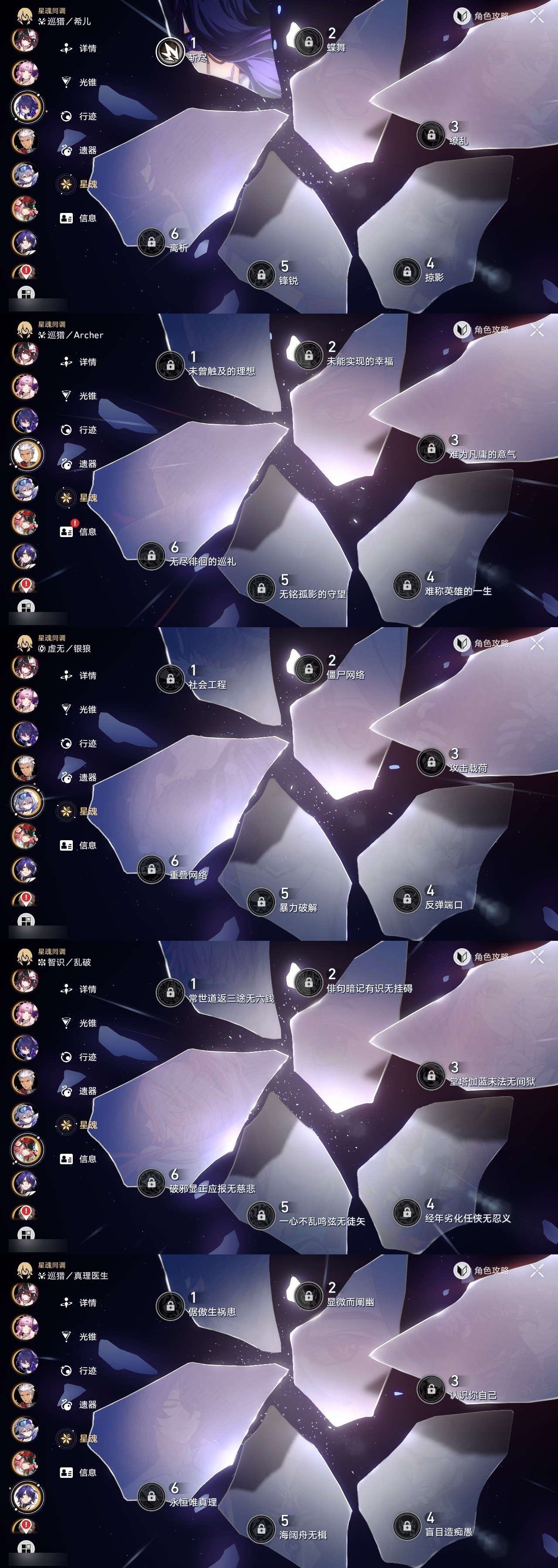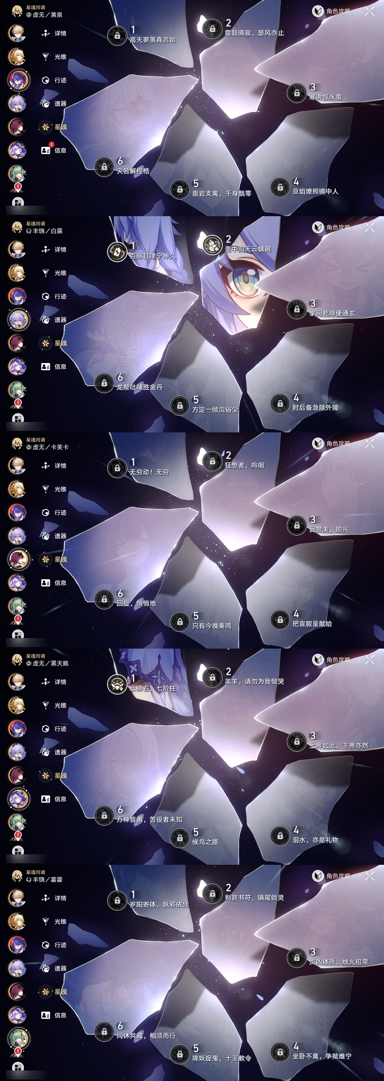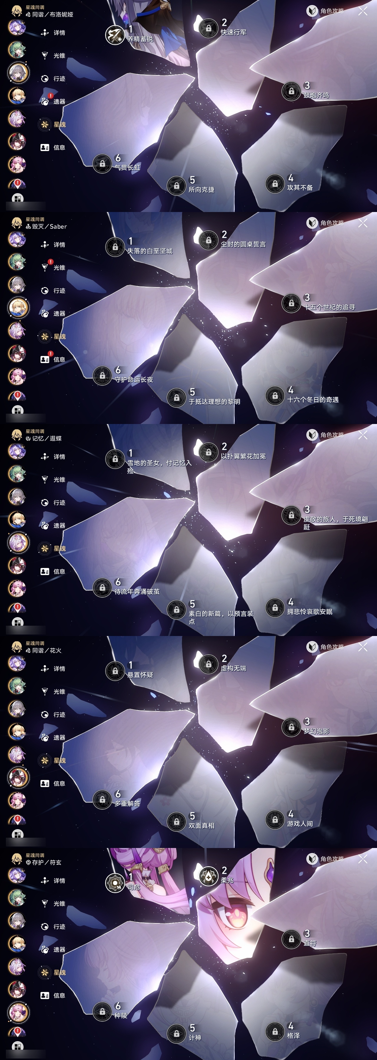 【崩坏·星穹铁道】【lyxq8924】冒险等级:70,女主,五星数量:43,五星角色:白露 2命杰帕德 2命彦卿 2命符玄 2命希儿 1命布洛妮娅 1命姬子 1命瓦尔特 1命克拉拉 1命黑天鹅 1命云璃银狼乱破大黑塔阿格莱雅缇宝卡芙卡遐蝶藿藿银枝真理医生花火黄泉风堇知更鸟saberarcher长夜月丹恒·腾荒流萤__五星光锥:星海巡航 5精记忆的质料 5精记一位星神的陨落 5精不息的演算 5精孤独的疗愈 5精记忆永不落幕 4精无可取代的东西 2精制胜的瞬间以世界之名无可取代的东西如泥酣眠向着不可追问处她已闭上双眼__四星角色:娜塔莎 6命虎克 6命黑塔 6命丹恒 6命艾丝妲 6命希露瓦 6命停云 6命素裳 6命桑博 6命青雀 6命佩拉 6命卢卡 6命玲可 6命桂乃芬 6命寒鸦 6命雪衣 6命米沙 6命加拉赫 6命阿兰 5命驭空 5命三月七 4命貊泽 2命