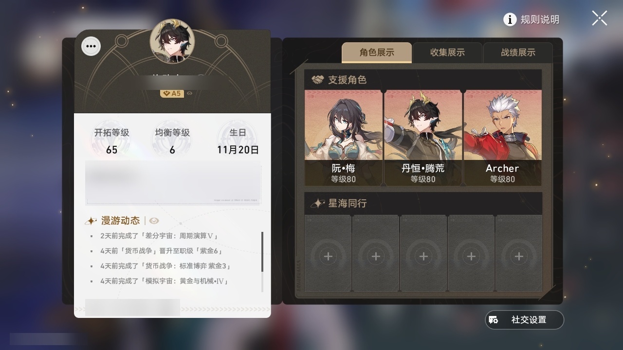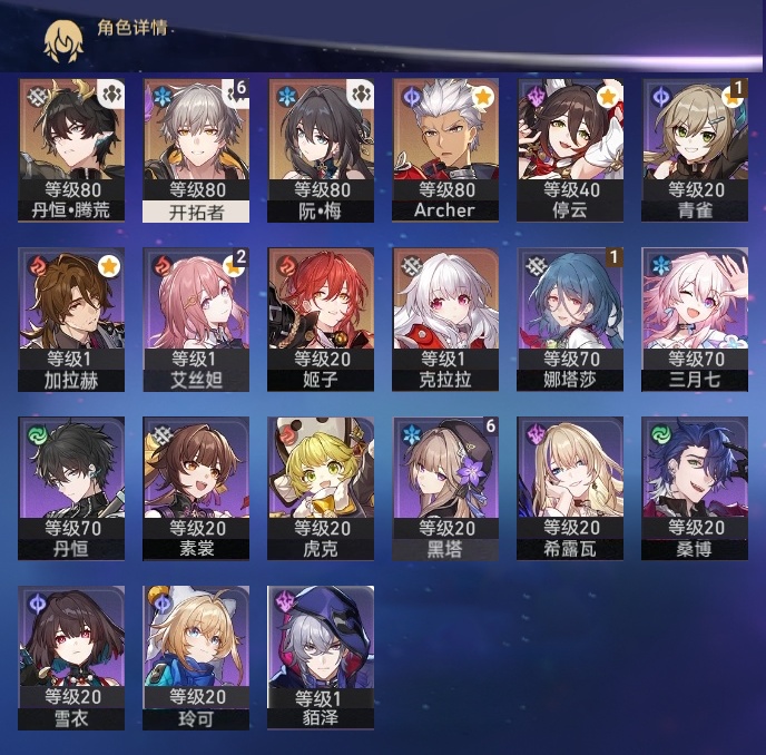 【崩坏·星穹铁道】【lyxq8920】冒险等级:65,男主,五星数量:6,五星角色:姬子克拉拉archer丹恒·腾荒__五星光锥:记忆永不落幕 5精如泥酣眠__四星角色:黑塔 6命艾丝妲 2命娜塔莎 1命青雀 1命貊泽虎克丹恒希露瓦停云素裳桑博三月七玲可雪衣加拉赫728抽