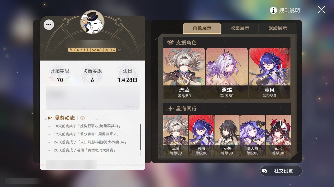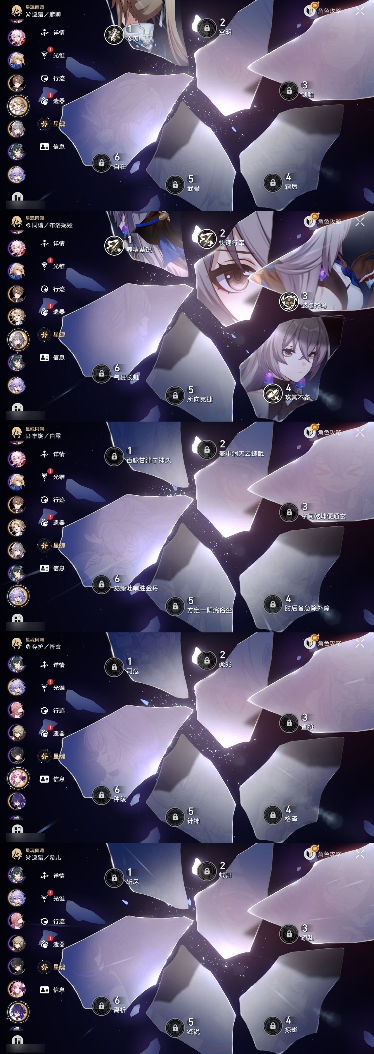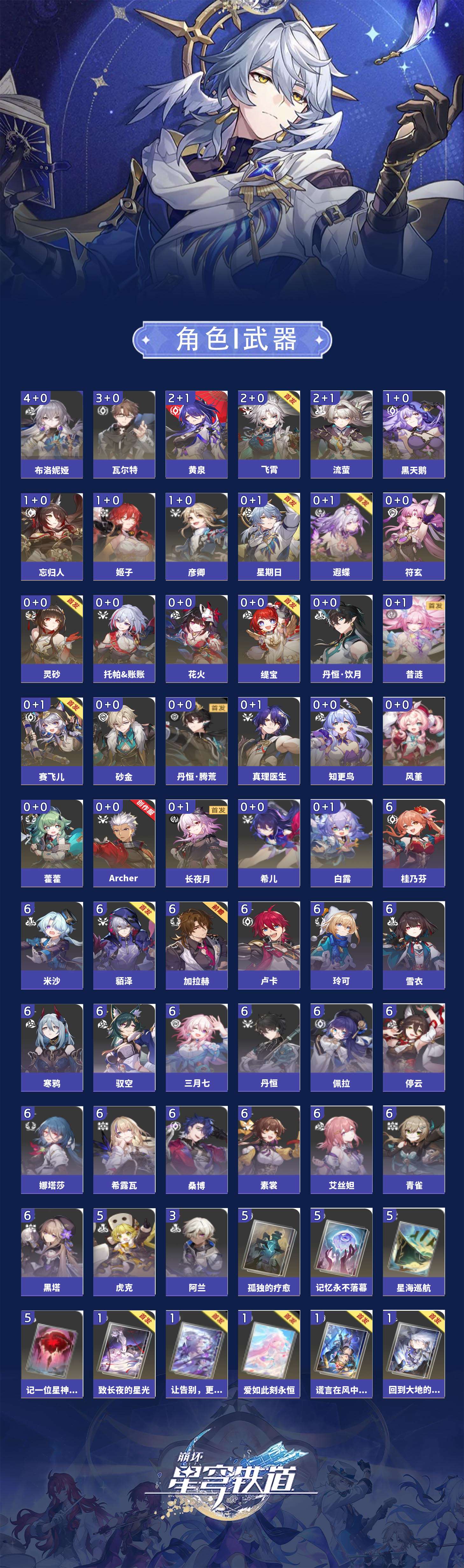 【崩坏·星穹铁道】【lyxq8974】冒险等级:70,男主,五星数量:46,五星角色:布洛妮娅 4命瓦尔特 3命飞霄 2命黄泉 2命流萤 2命姬子 1命彦卿 1命忘归人 1命黑天鹅 1命希儿白露灵砂星期日缇宝丹恒·饮月遐蝶符玄托帕账账藿藿真理医生花火风堇砂金知更鸟赛飞儿archer长夜月丹恒·腾荒昔涟__五星光锥:星海巡航 5精记一位星神的陨落 5精孤独的疗愈 5精记忆永不落幕 5精制胜的瞬间制胜的瞬间无可取代的东西时节不居不息的演算回到大地的飞行让告别,更美一些纯粹思维的洗礼行于流逝的岸谎言在风中飘扬致长夜的星光爱如此刻永恒梦应归于何处__四星角色:娜塔莎 6命貊泽 6命黑塔 6命丹恒 6命艾丝妲 6命希露瓦 6命停云 6命素裳 6命桑博 6命三月七 6命青雀 6命佩拉 6命驭空 6命卢卡 6命玲可 6命桂乃芬 6命寒鸦 6命雪衣 6命米沙 6命加拉赫 6命虎克 5命阿兰 3命