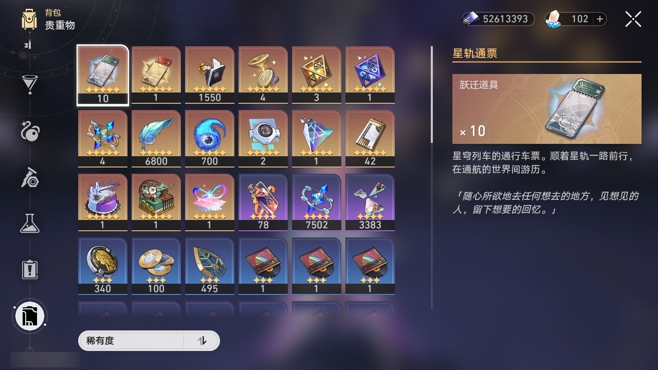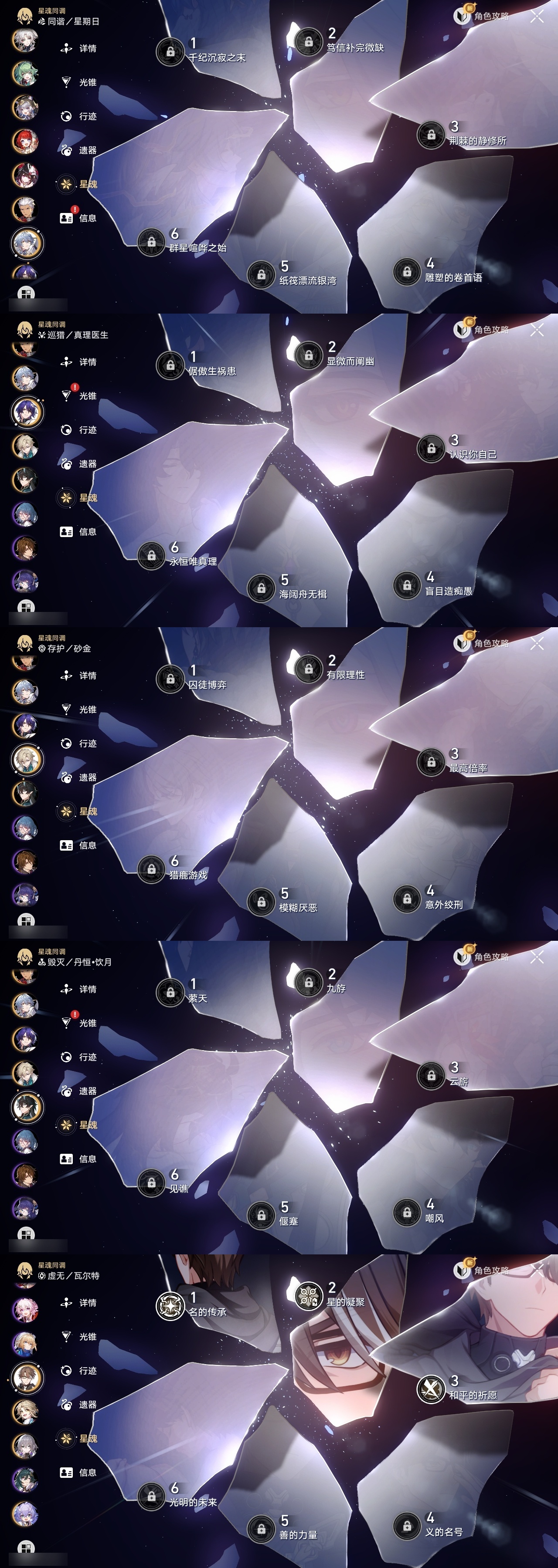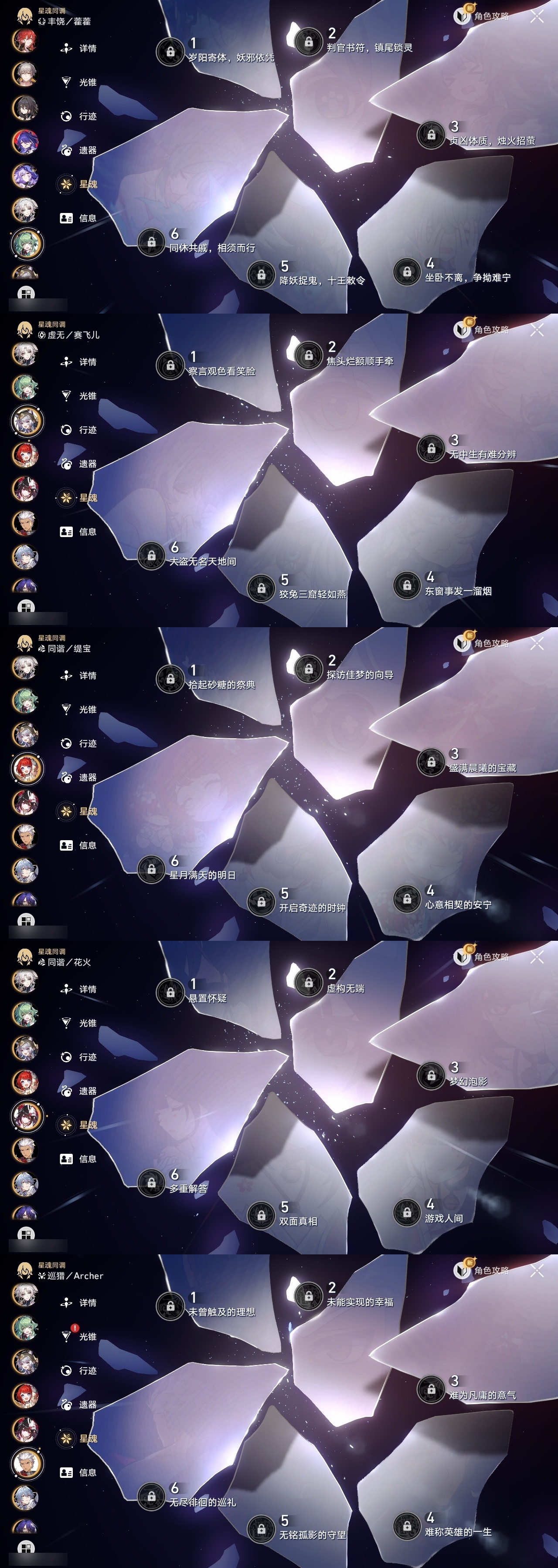 【崩坏·星穹铁道】【lyxq8974】冒险等级:70,男主,五星数量:46,五星角色:布洛妮娅 4命瓦尔特 3命飞霄 2命黄泉 2命流萤 2命姬子 1命彦卿 1命忘归人 1命黑天鹅 1命希儿白露灵砂星期日缇宝丹恒·饮月遐蝶符玄托帕账账藿藿真理医生花火风堇砂金知更鸟赛飞儿archer长夜月丹恒·腾荒昔涟__五星光锥:星海巡航 5精记一位星神的陨落 5精孤独的疗愈 5精记忆永不落幕 5精制胜的瞬间制胜的瞬间无可取代的东西时节不居不息的演算回到大地的飞行让告别,更美一些纯粹思维的洗礼行于流逝的岸谎言在风中飘扬致长夜的星光爱如此刻永恒梦应归于何处__四星角色:娜塔莎 6命貊泽 6命黑塔 6命丹恒 6命艾丝妲 6命希露瓦 6命停云 6命素裳 6命桑博 6命三月七 6命青雀 6命佩拉 6命驭空 6命卢卡 6命玲可 6命桂乃芬 6命寒鸦 6命雪衣 6命米沙 6命加拉赫 6命虎克 5命阿兰 3命