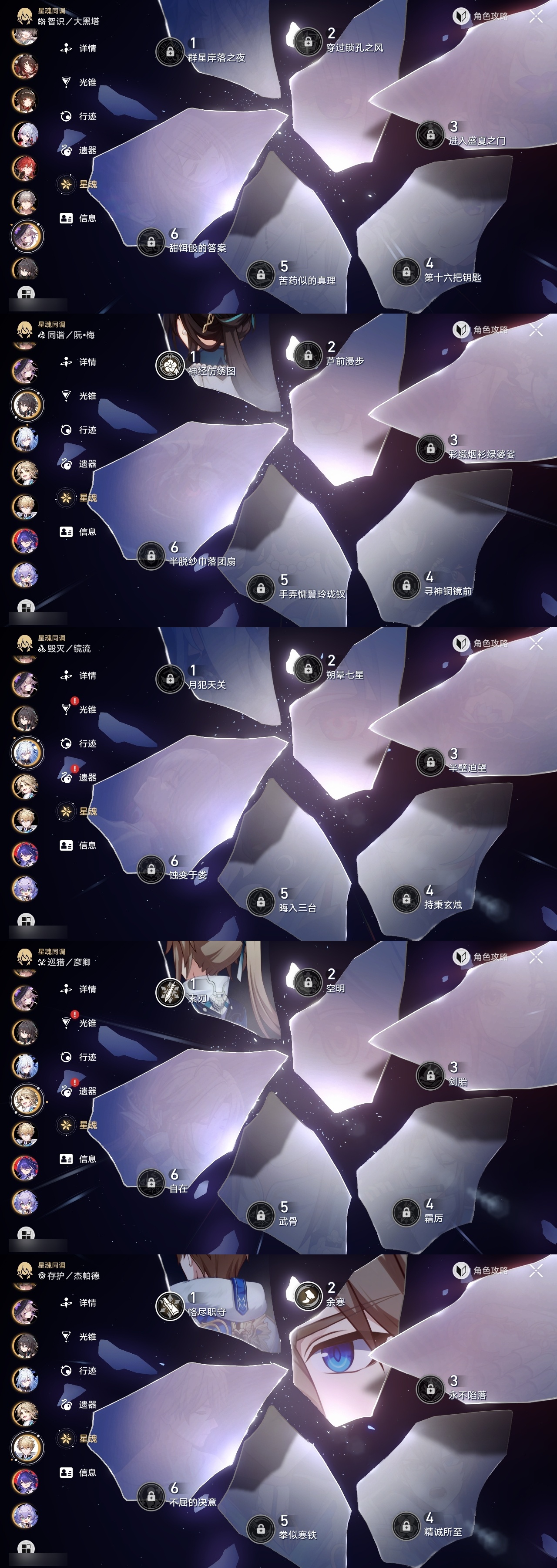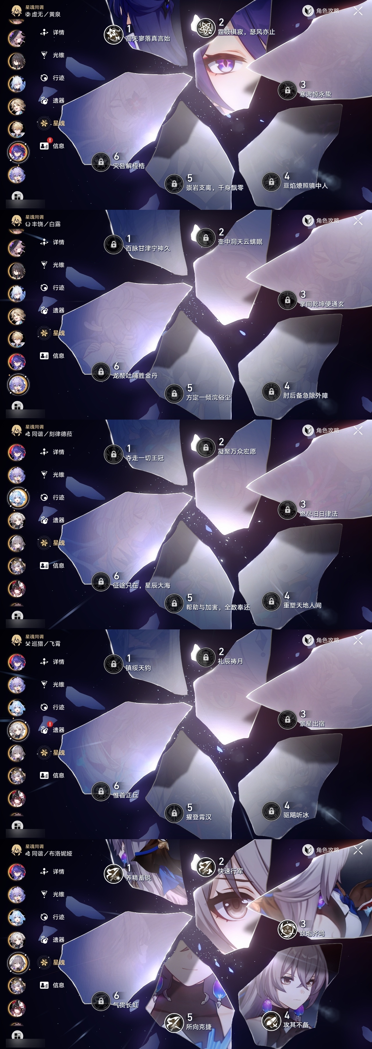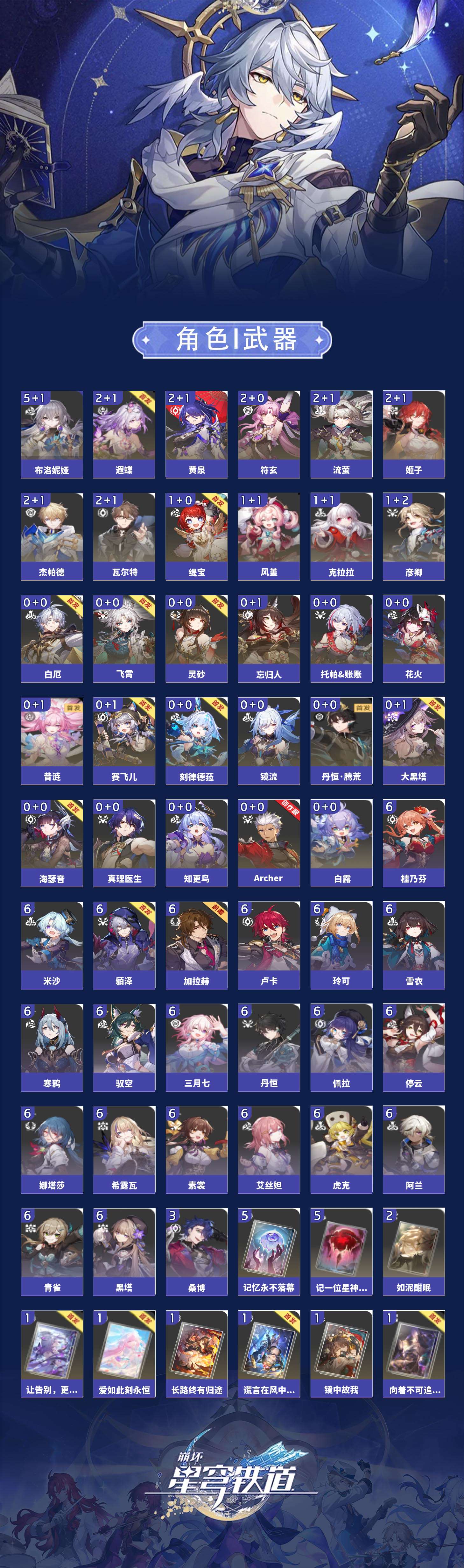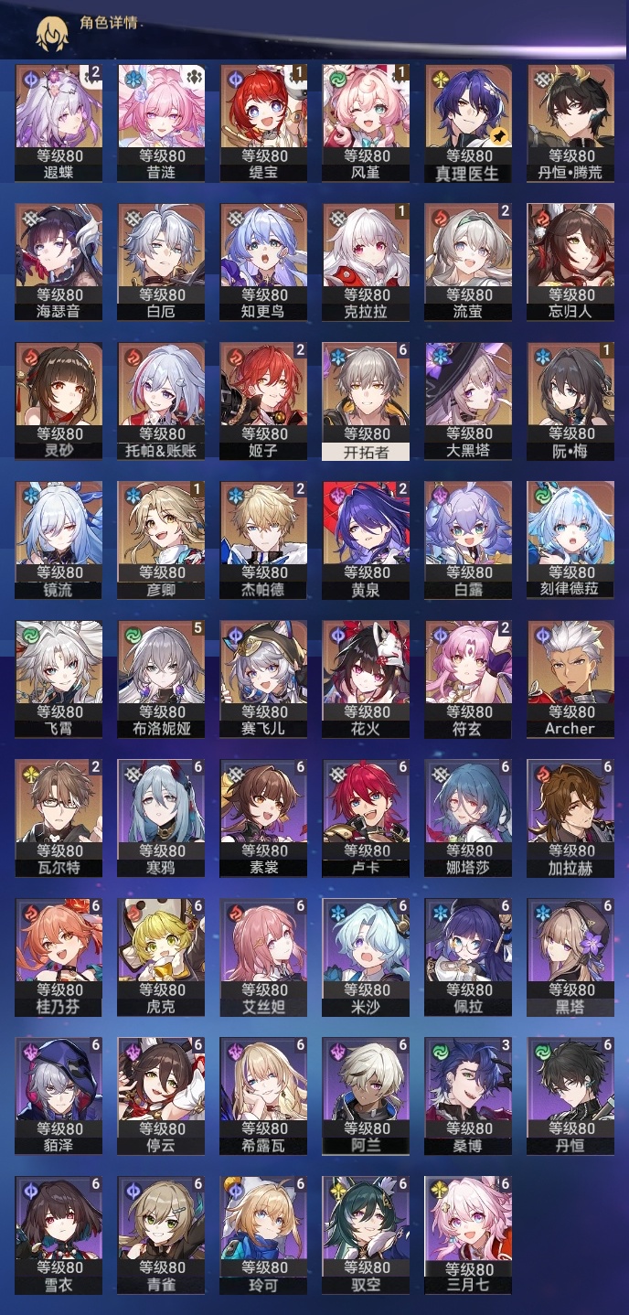 【崩坏·星穹铁道】【lyxq8929】冒险等级:70,男主,五星数量:47,五星角色:布洛妮娅 5命姬子 2命杰帕德 2命瓦尔特 2命符玄 2命遐蝶 2命黄泉 2命流萤 2命彦卿 1命克拉拉 1命缇宝 1命风堇 1命飞霄白露灵砂大黑塔忘归人镜流托帕账账真理医生花火知更鸟赛飞儿白厄archer海瑟音刻律德菈丹恒·腾荒昔涟__五星光锥:记一位星神的陨落 5精记忆永不落幕 5精如泥酣眠 2精星海巡航制胜的瞬间银河铁道之夜以世界之名无可取代的东西但战斗还未结束向着不可追问处长路终有归途让告别,更美一些镜中故我行于流逝的岸愿虹光永驻天空谎言在风中飘扬爱如此刻永恒梦应归于何处__四星角色:阿兰 6命娜塔莎 6命虎克 6命貊泽 6命黑塔 6命丹恒 6命艾丝妲 6命希露瓦 6命停云 6命素裳 6命三月七 6命青雀 6命佩拉 6命驭空 6命卢卡 6命玲可 6命桂乃芬 6命寒鸦 6命雪衣 6命米沙 6命加拉赫 6命桑博 3命