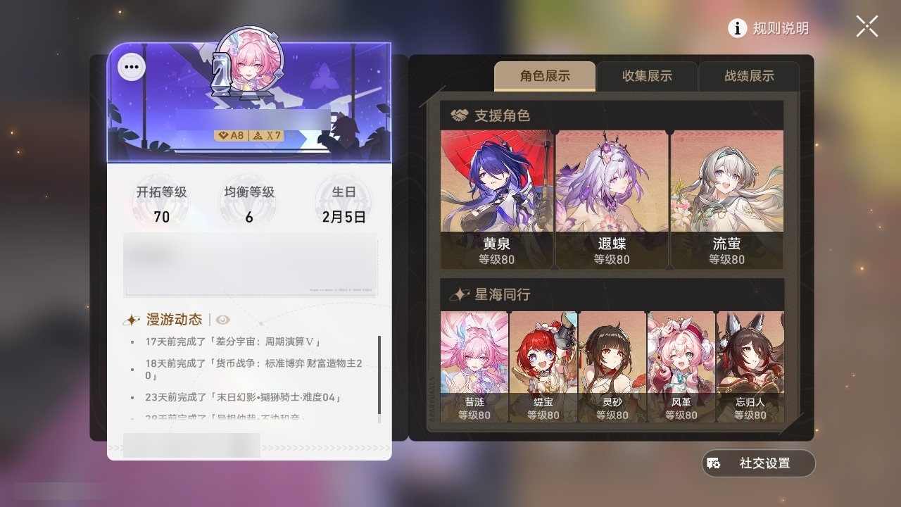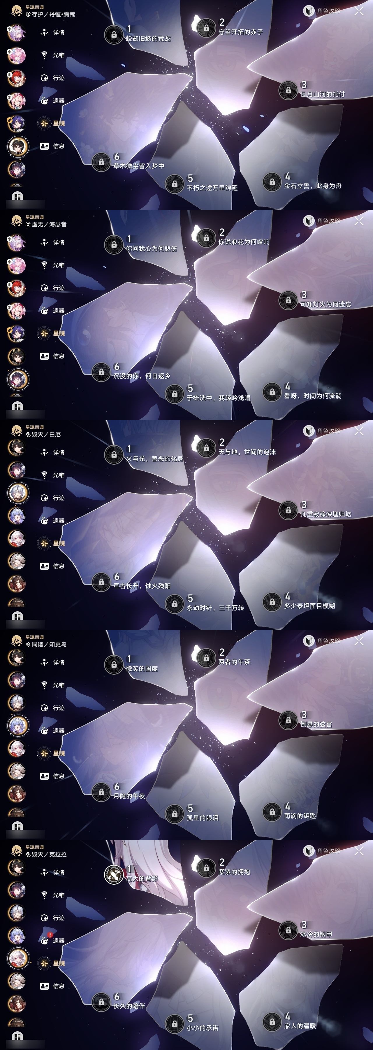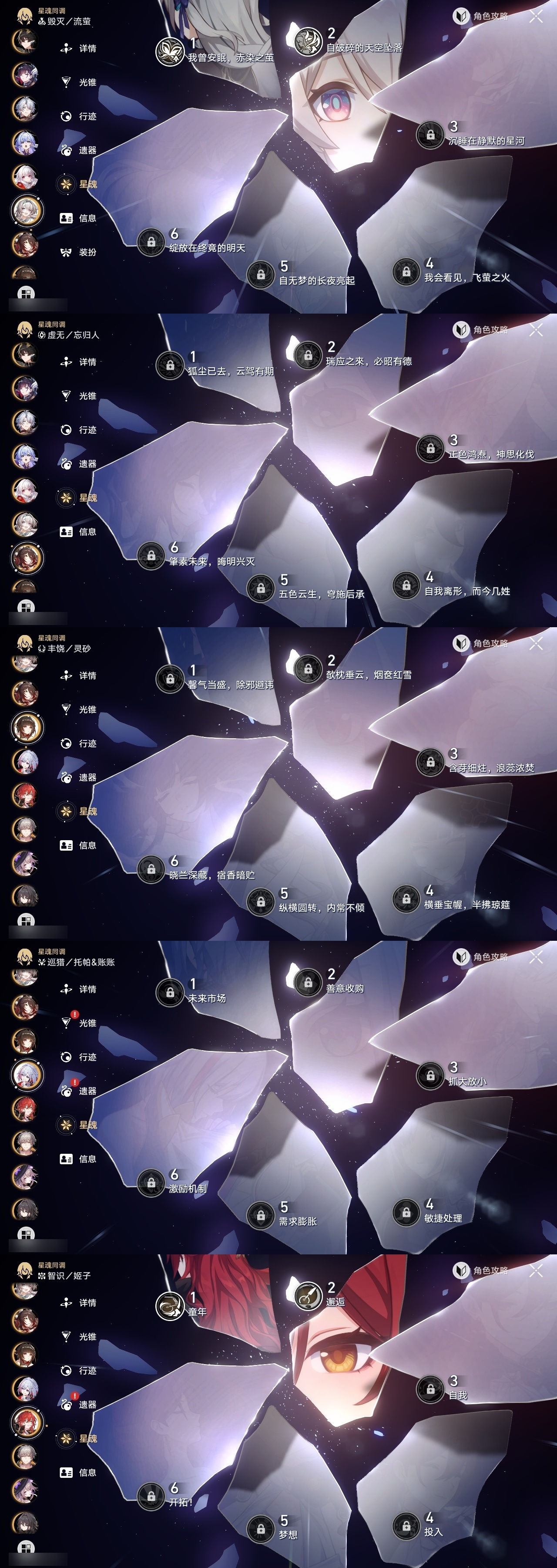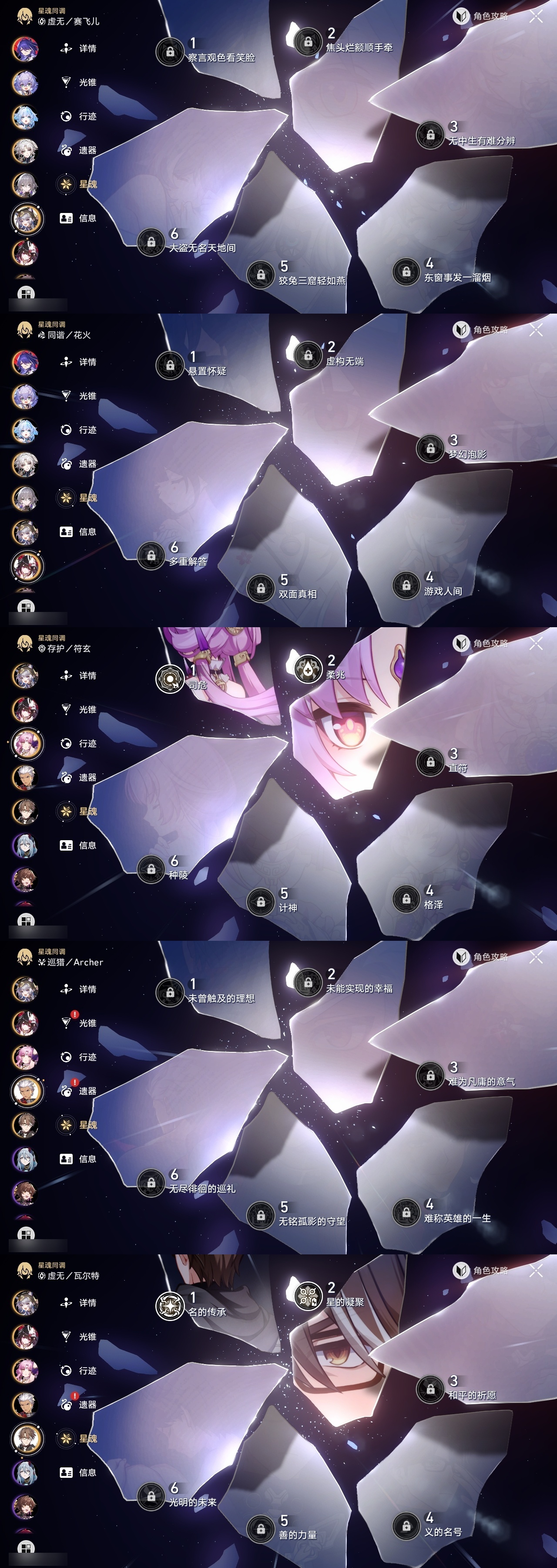 【崩坏·星穹铁道】【lyxq8929】冒险等级:70,男主,五星数量:47,五星角色:布洛妮娅 5命姬子 2命杰帕德 2命瓦尔特 2命符玄 2命遐蝶 2命黄泉 2命流萤 2命彦卿 1命克拉拉 1命缇宝 1命风堇 1命飞霄白露灵砂大黑塔忘归人镜流托帕账账真理医生花火知更鸟赛飞儿白厄archer海瑟音刻律德菈丹恒·腾荒昔涟__五星光锥:记一位星神的陨落 5精记忆永不落幕 5精如泥酣眠 2精星海巡航制胜的瞬间银河铁道之夜以世界之名无可取代的东西但战斗还未结束向着不可追问处长路终有归途让告别,更美一些镜中故我行于流逝的岸愿虹光永驻天空谎言在风中飘扬爱如此刻永恒梦应归于何处__四星角色:阿兰 6命娜塔莎 6命虎克 6命貊泽 6命黑塔 6命丹恒 6命艾丝妲 6命希露瓦 6命停云 6命素裳 6命三月七 6命青雀 6命佩拉 6命驭空 6命卢卡 6命玲可 6命桂乃芬 6命寒鸦 6命雪衣 6命米沙 6命加拉赫 6命桑博 3命