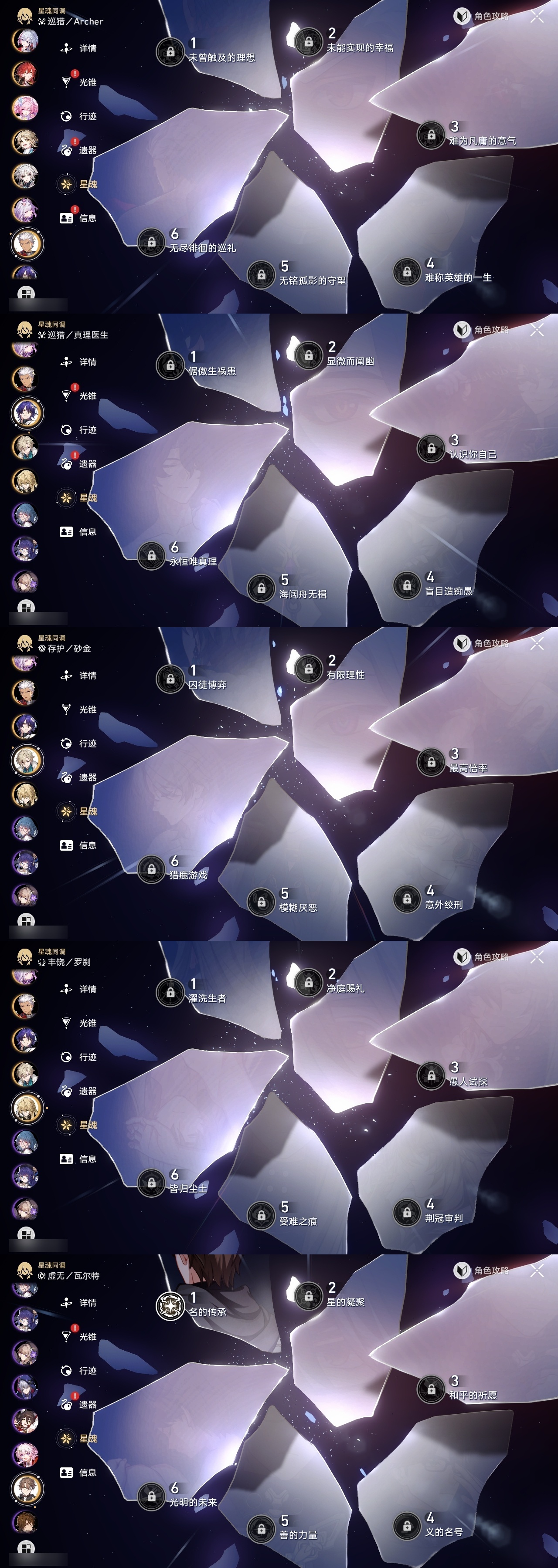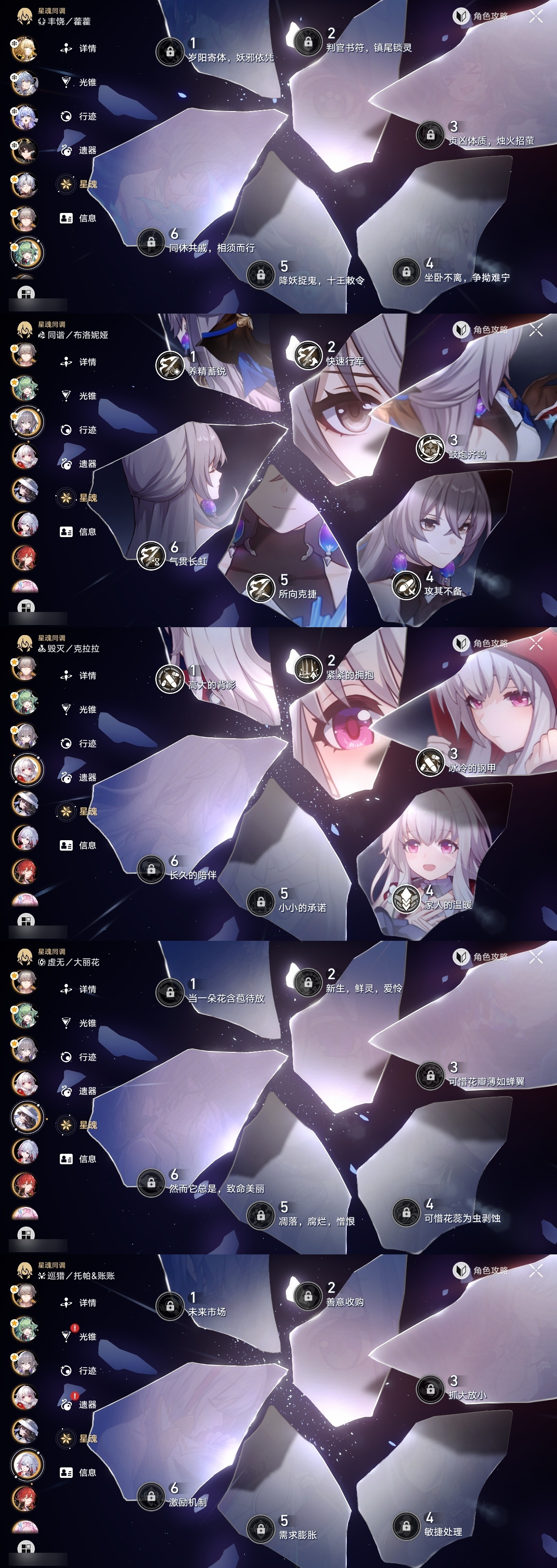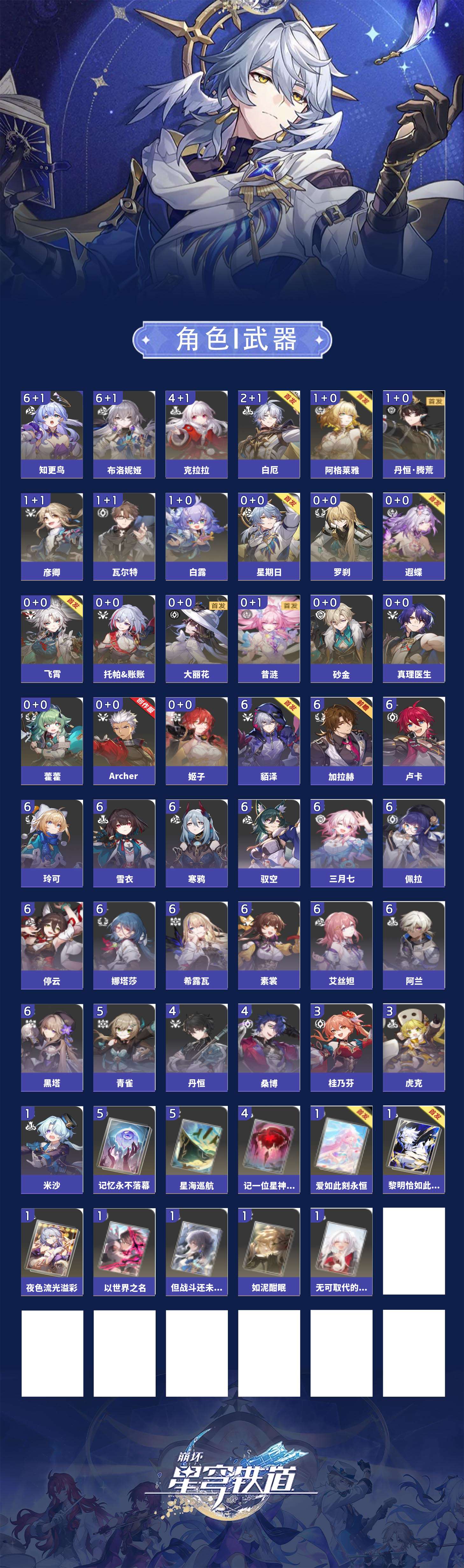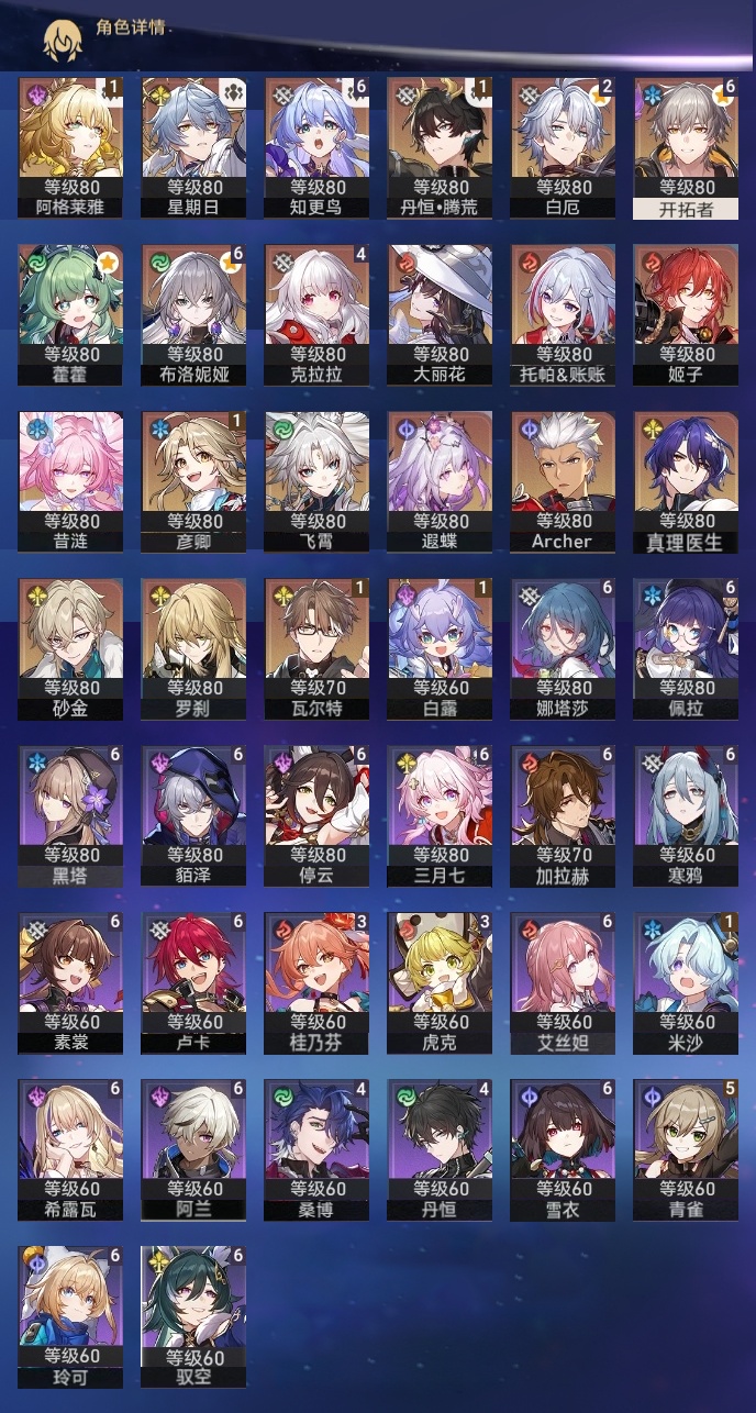 【崩坏·星穹铁道】【lyxq8979】冒险等级:70,男主,五星数量:32,五星角色:布洛妮娅 6命知更鸟 6命克拉拉 4命白厄 2命白露 1命彦卿 1命瓦尔特 1命阿格莱雅 1命丹恒·腾荒 1命飞霄姬子星期日罗刹遐蝶托帕账账藿藿真理医生砂金archer昔涟大丽花__五星光锥:星海巡航 5精记忆永不落幕 5精记一位星神的陨落 4精以世界之名无可取代的东西如泥酣眠但战斗还未结束不息的演算夜色流光溢彩黎明恰如此燃烧爱如此刻永恒__四星角色:阿兰 6命娜塔莎 6命貊泽 6命黑塔 6命艾丝妲 6命希露瓦 6命停云 6命素裳 6命三月七 6命佩拉 6命驭空 6命卢卡 6命玲可 6命寒鸦 6命雪衣 6命加拉赫 6命青雀 5命丹恒 4命桑博 4命虎克 3命桂乃芬 3命米沙 1命