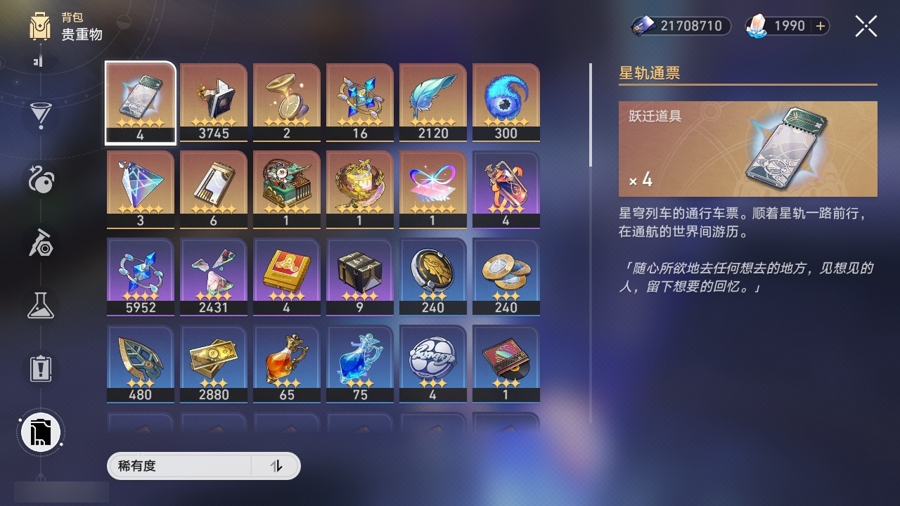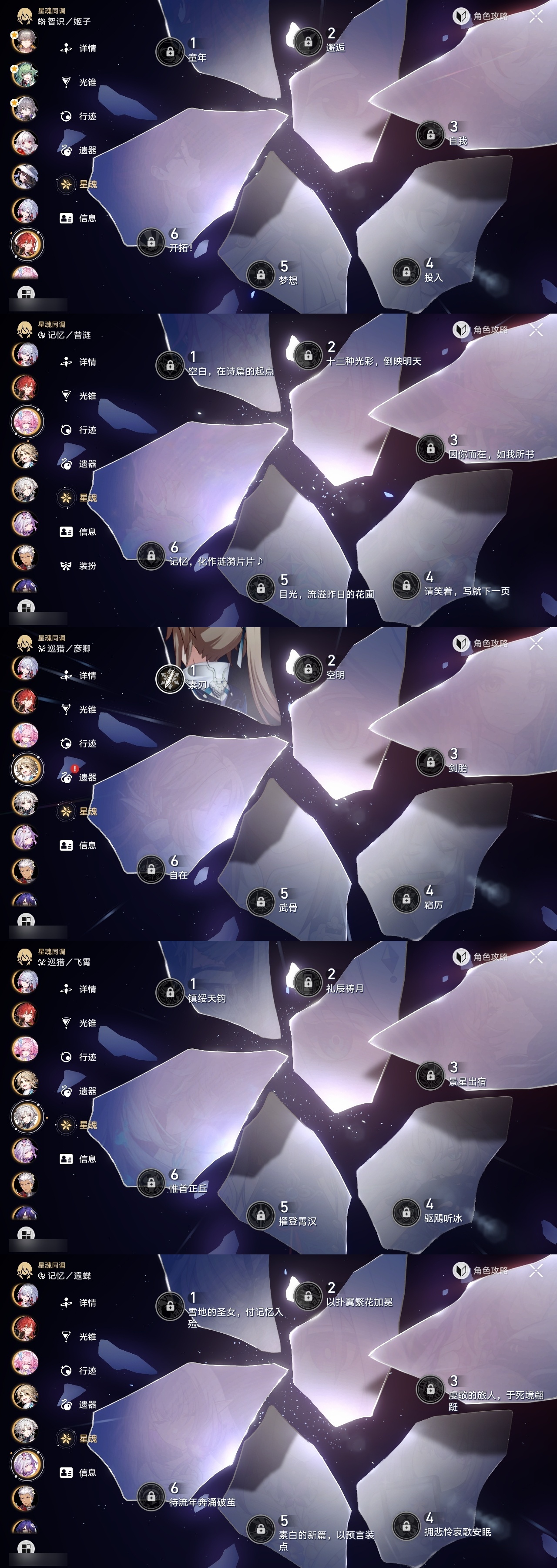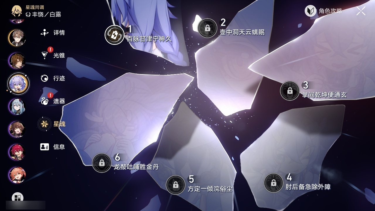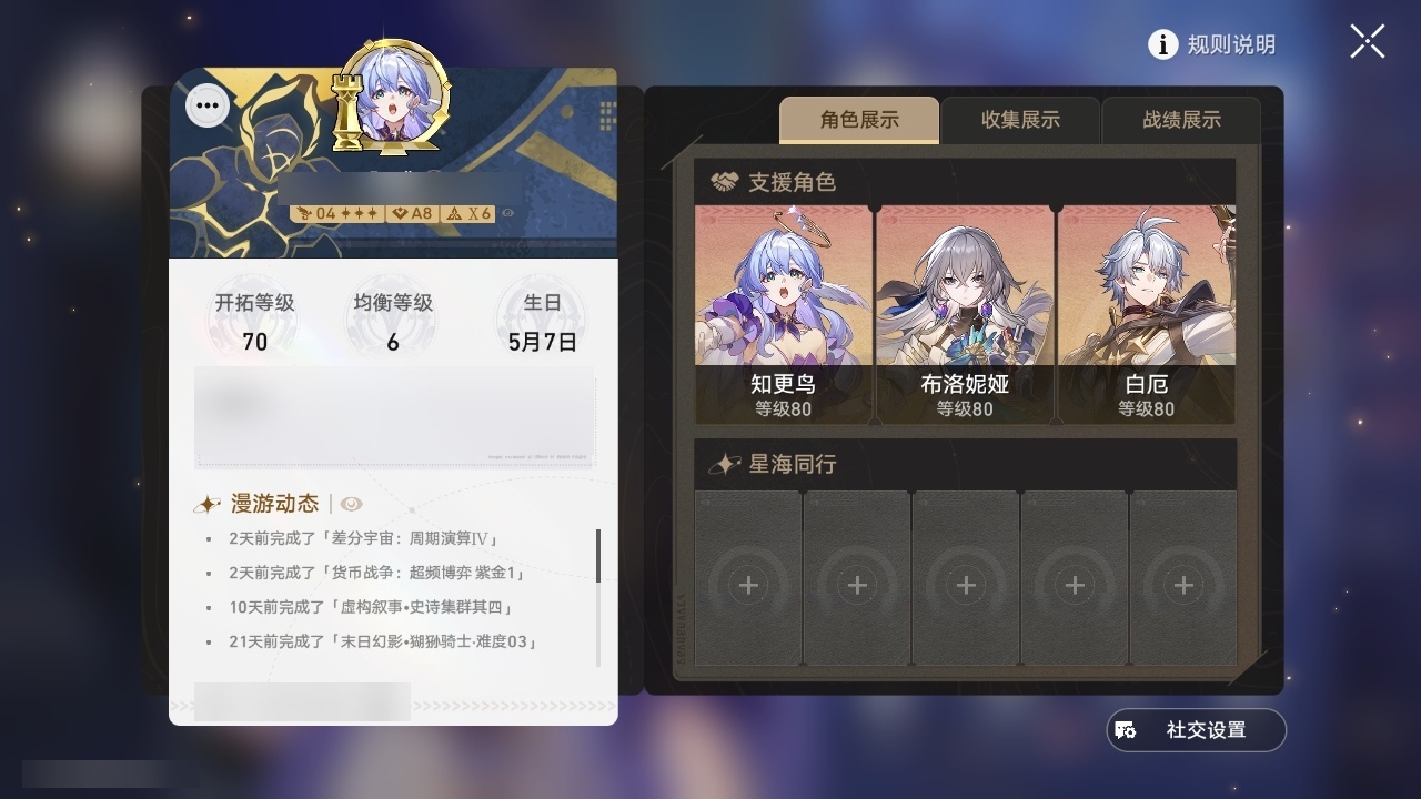 【崩坏·星穹铁道】【lyxq8979】冒险等级:70,男主,五星数量:32,五星角色:布洛妮娅 6命知更鸟 6命克拉拉 4命白厄 2命白露 1命彦卿 1命瓦尔特 1命阿格莱雅 1命丹恒·腾荒 1命飞霄姬子星期日罗刹遐蝶托帕账账藿藿真理医生砂金archer昔涟大丽花__五星光锥:星海巡航 5精记忆永不落幕 5精记一位星神的陨落 4精以世界之名无可取代的东西如泥酣眠但战斗还未结束不息的演算夜色流光溢彩黎明恰如此燃烧爱如此刻永恒__四星角色:阿兰 6命娜塔莎 6命貊泽 6命黑塔 6命艾丝妲 6命希露瓦 6命停云 6命素裳 6命三月七 6命佩拉 6命驭空 6命卢卡 6命玲可 6命寒鸦 6命雪衣 6命加拉赫 6命青雀 5命丹恒 4命桑博 4命虎克 3命桂乃芬 3命米沙 1命