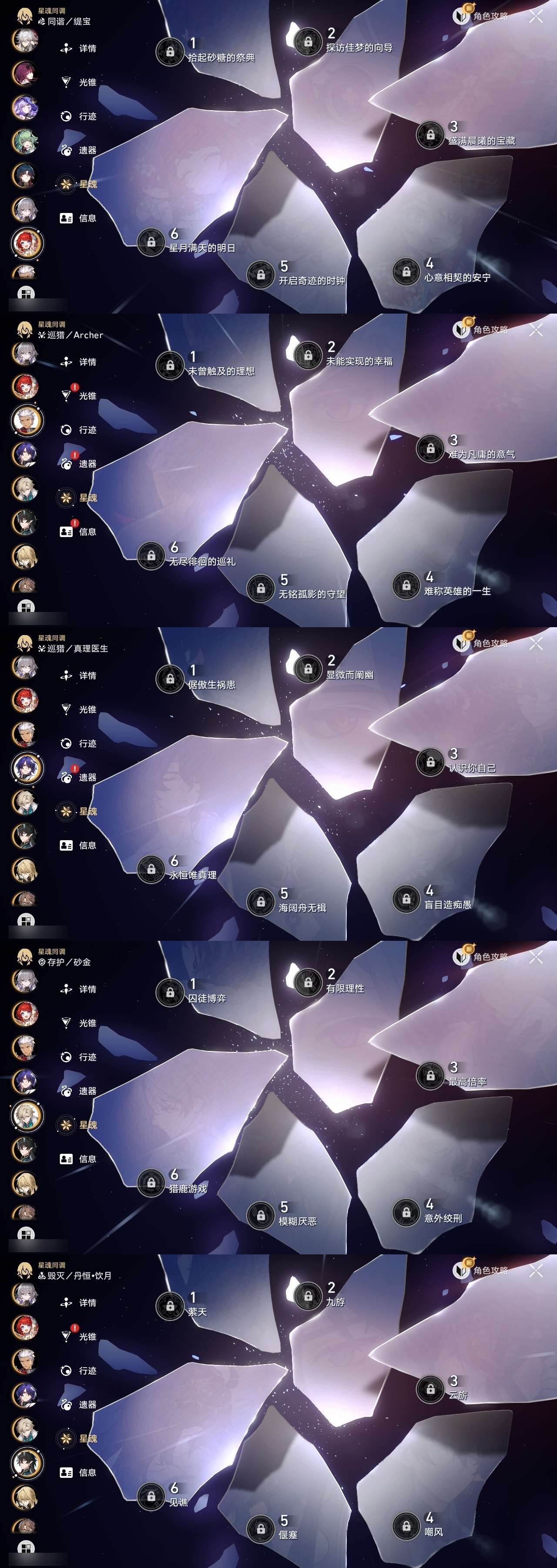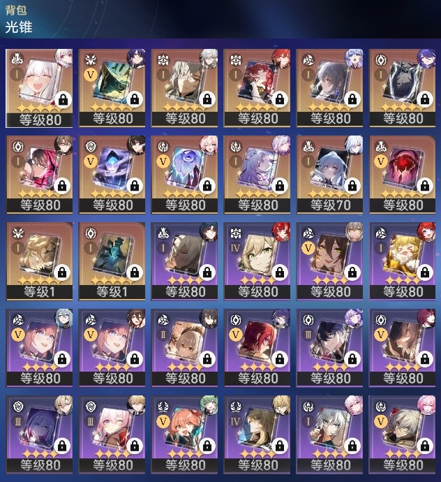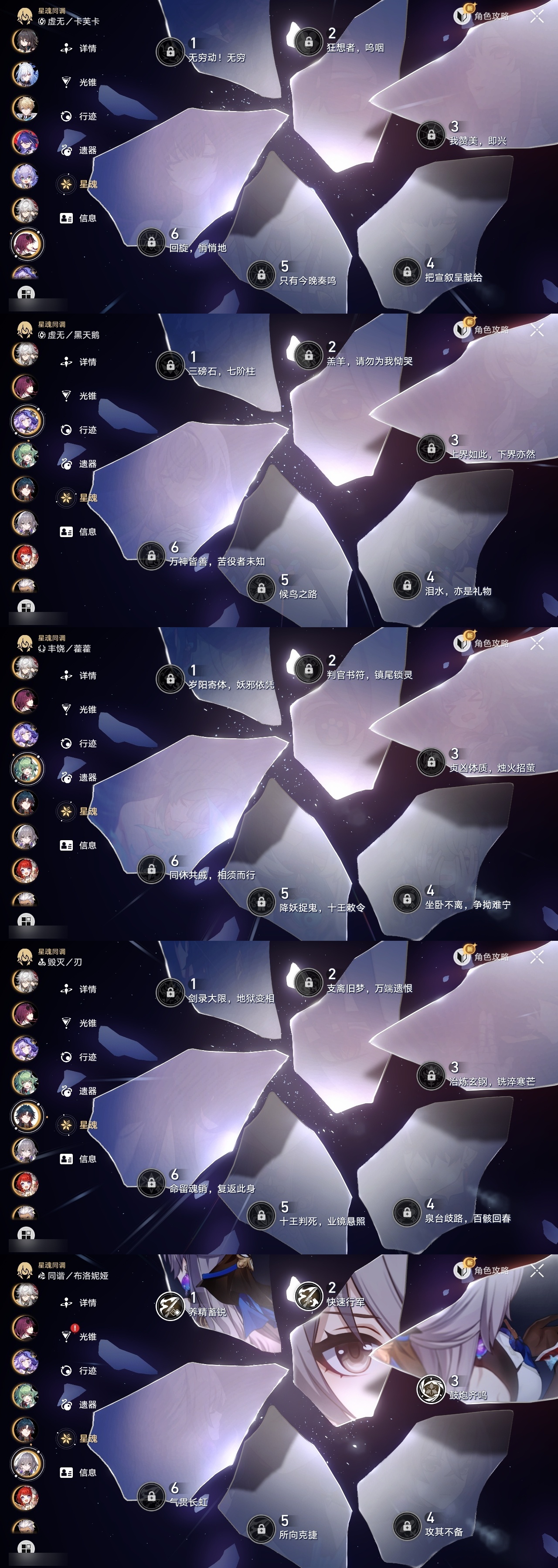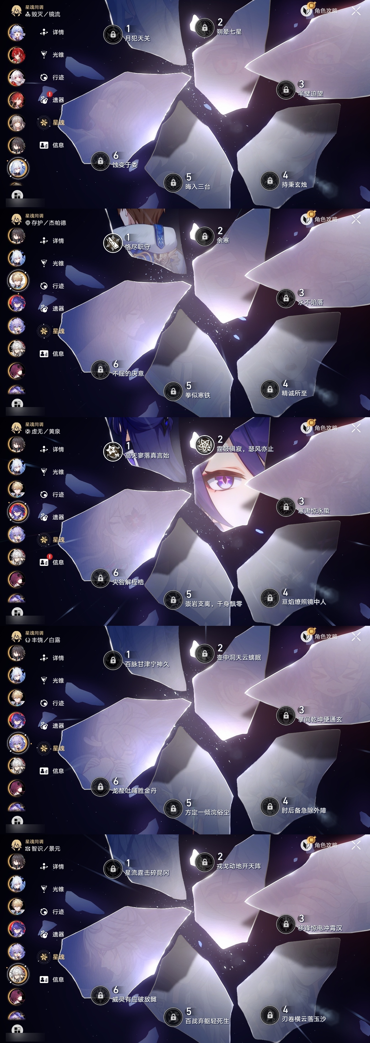【崩坏·星穹铁道】【lyxq9014】冒险等级:70,女主,五星数量:40,五星角色:布洛妮娅 3命瓦尔特 2命遐蝶 2命黄泉 2命姬子 1命杰帕德 1命克拉拉 1命罗刹 1命风堇 1命景元白露缇宝刃卡芙卡丹恒·饮月镜流藿藿银枝真理医生黑天鹅砂金知更鸟archer长夜月丹恒·腾荒昔涟__五星光锥:星海巡航 5精记忆的质料 5精记一位星神的陨落 5精记忆永不落幕 5精银河铁道之夜以世界之名无可取代的东西如泥酣眠但战斗还未结束拂晓之前孤独的疗愈让告别,更美一些此身为剑行于流逝的岸__四星角色:阿兰 6命娜塔莎 6命虎克 6命黑塔 6命丹恒 6命艾丝妲 6命希露瓦 6命停云 6命素裳 6命桑博 6命青雀 6命佩拉 6命驭空 6命卢卡 6命玲可 6命桂乃芬 6命寒鸦 6命雪衣 6命米沙 6命加拉赫 4命貊泽 3命三月七