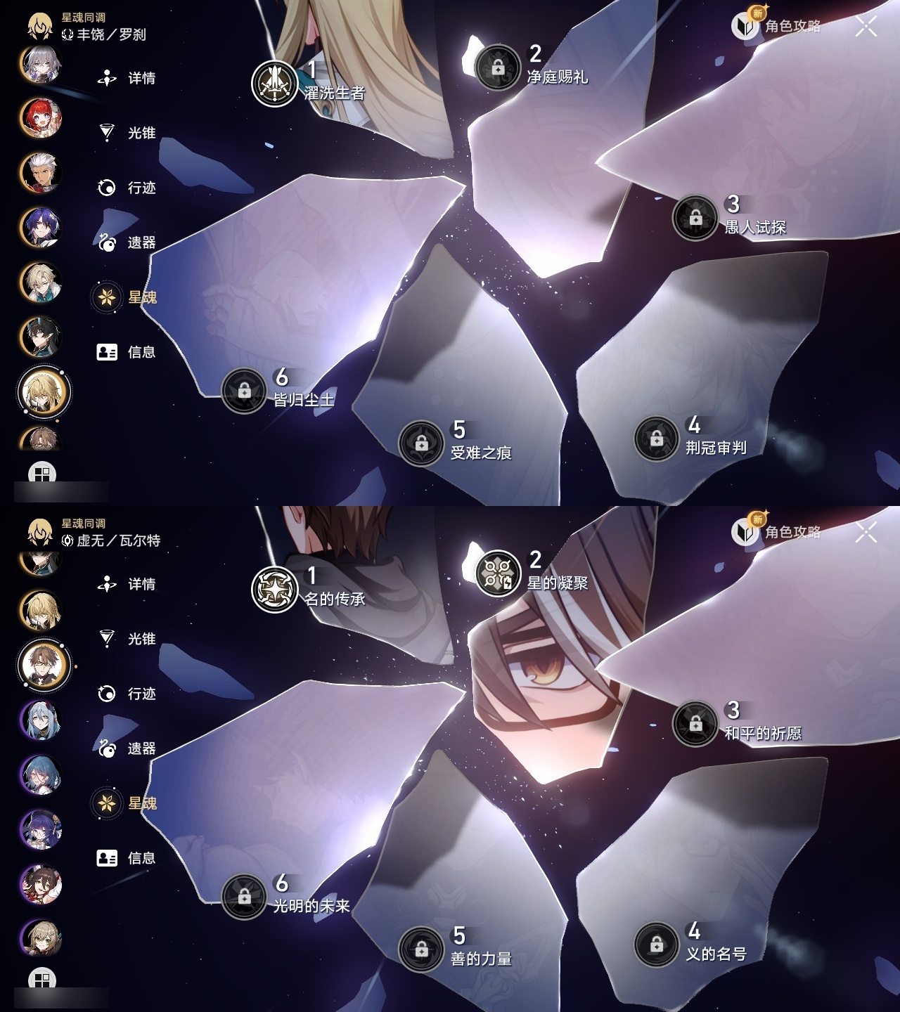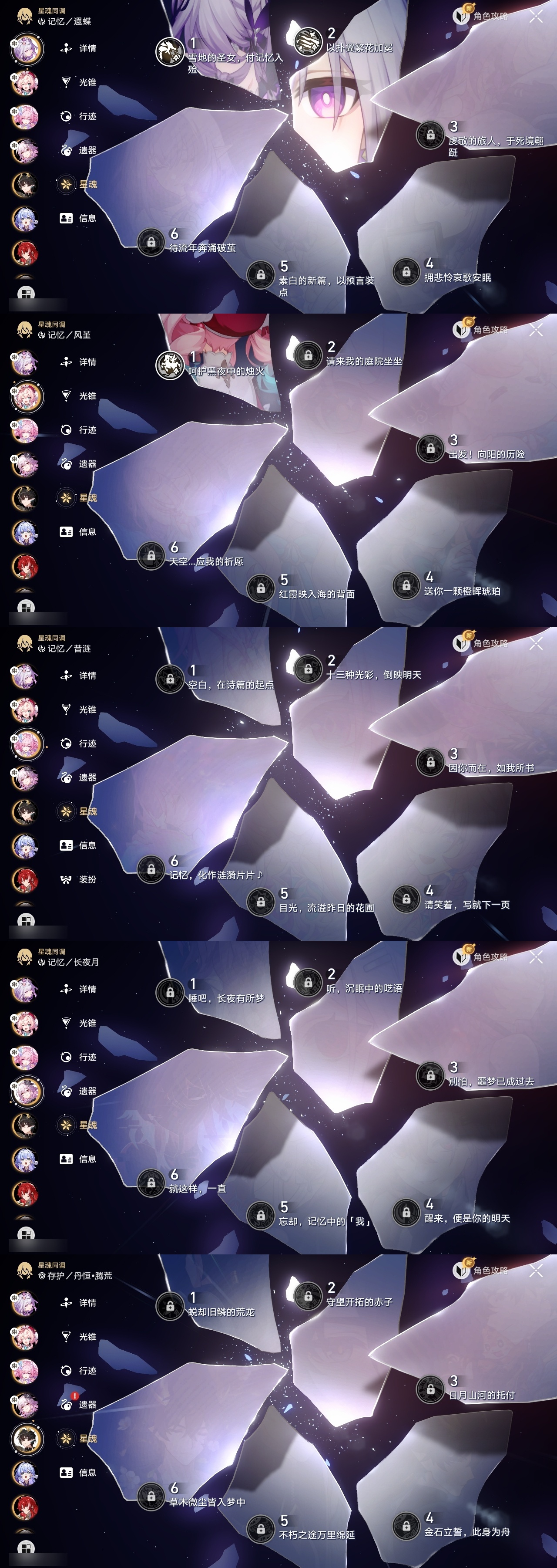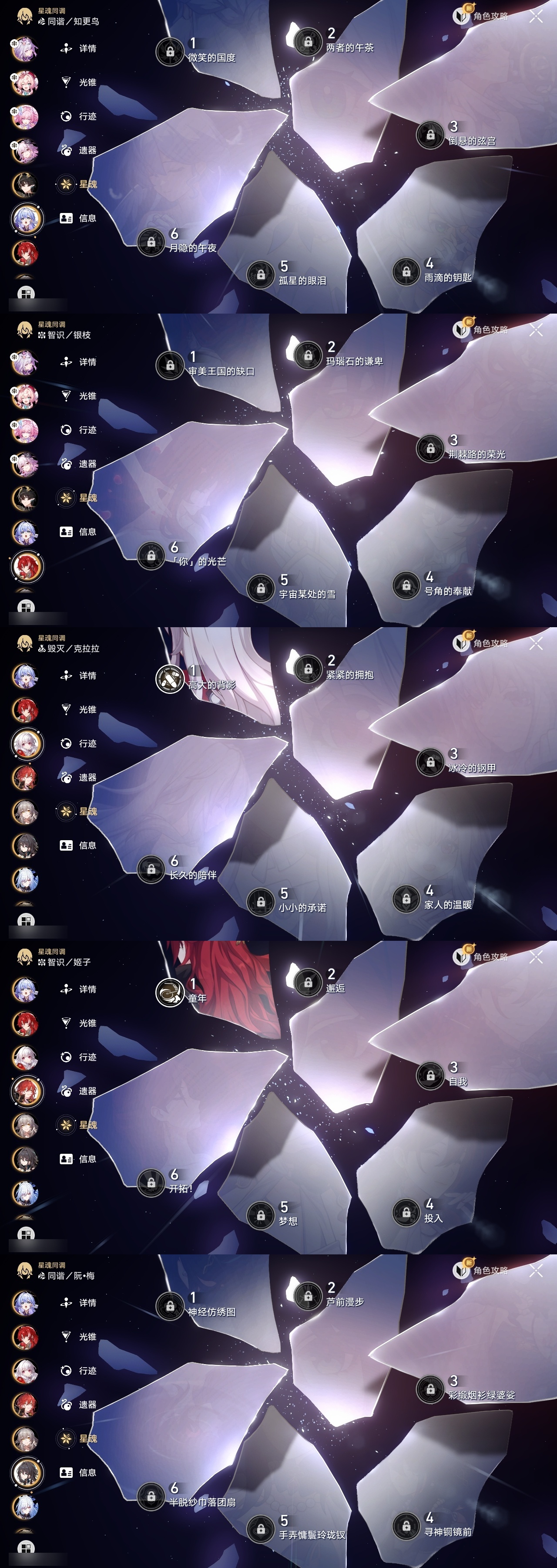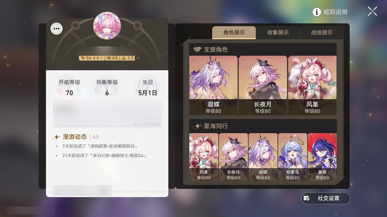 【崩坏·星穹铁道】【lyxq9014】冒险等级:70,女主,五星数量:40,五星角色:布洛妮娅 3命瓦尔特 2命遐蝶 2命黄泉 2命姬子 1命杰帕德 1命克拉拉 1命罗刹 1命风堇 1命景元白露缇宝刃卡芙卡丹恒·饮月镜流藿藿银枝真理医生黑天鹅砂金知更鸟archer长夜月丹恒·腾荒昔涟__五星光锥:星海巡航 5精记忆的质料 5精记一位星神的陨落 5精记忆永不落幕 5精银河铁道之夜以世界之名无可取代的东西如泥酣眠但战斗还未结束拂晓之前孤独的疗愈让告别,更美一些此身为剑行于流逝的岸__四星角色:阿兰 6命娜塔莎 6命虎克 6命黑塔 6命丹恒 6命艾丝妲 6命希露瓦 6命停云 6命素裳 6命桑博 6命青雀 6命佩拉 6命驭空 6命卢卡 6命玲可 6命桂乃芬 6命寒鸦 6命雪衣 6命米沙 6命加拉赫 4命貊泽 3命三月七