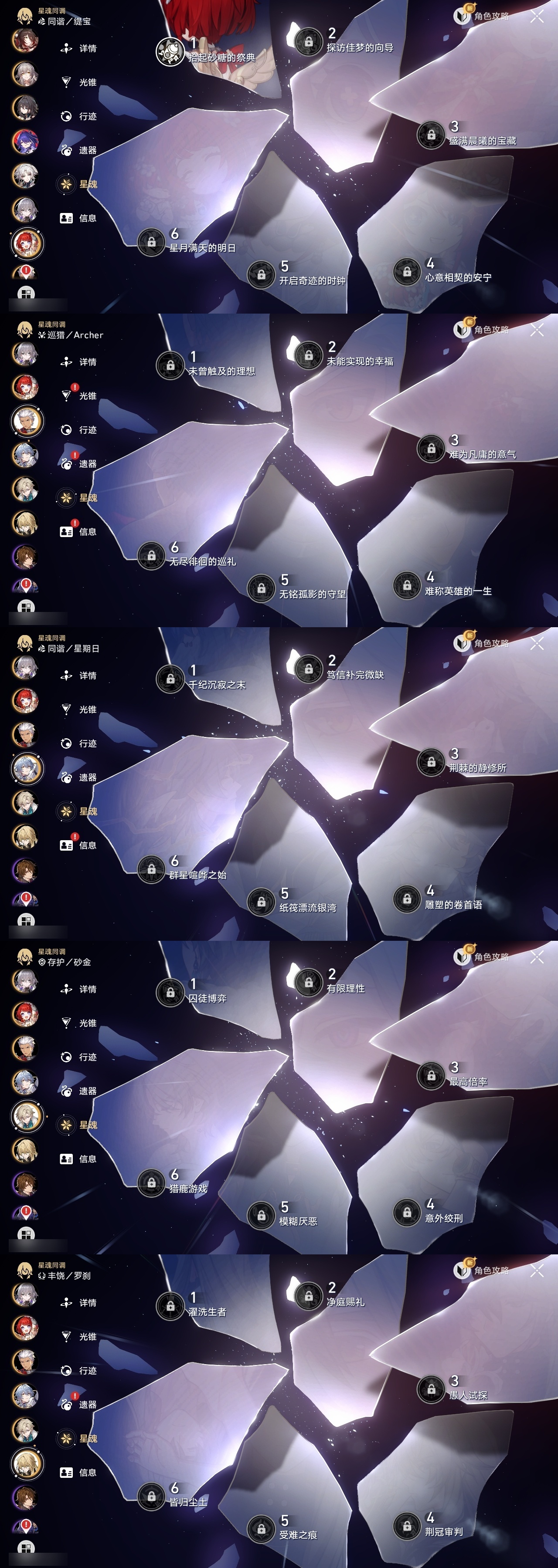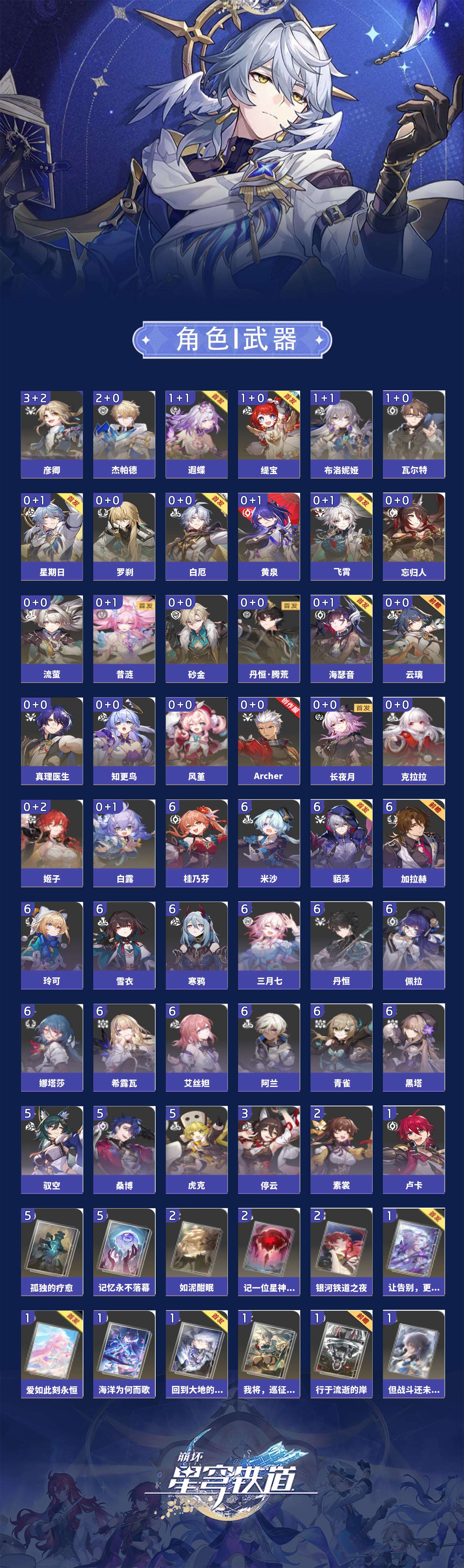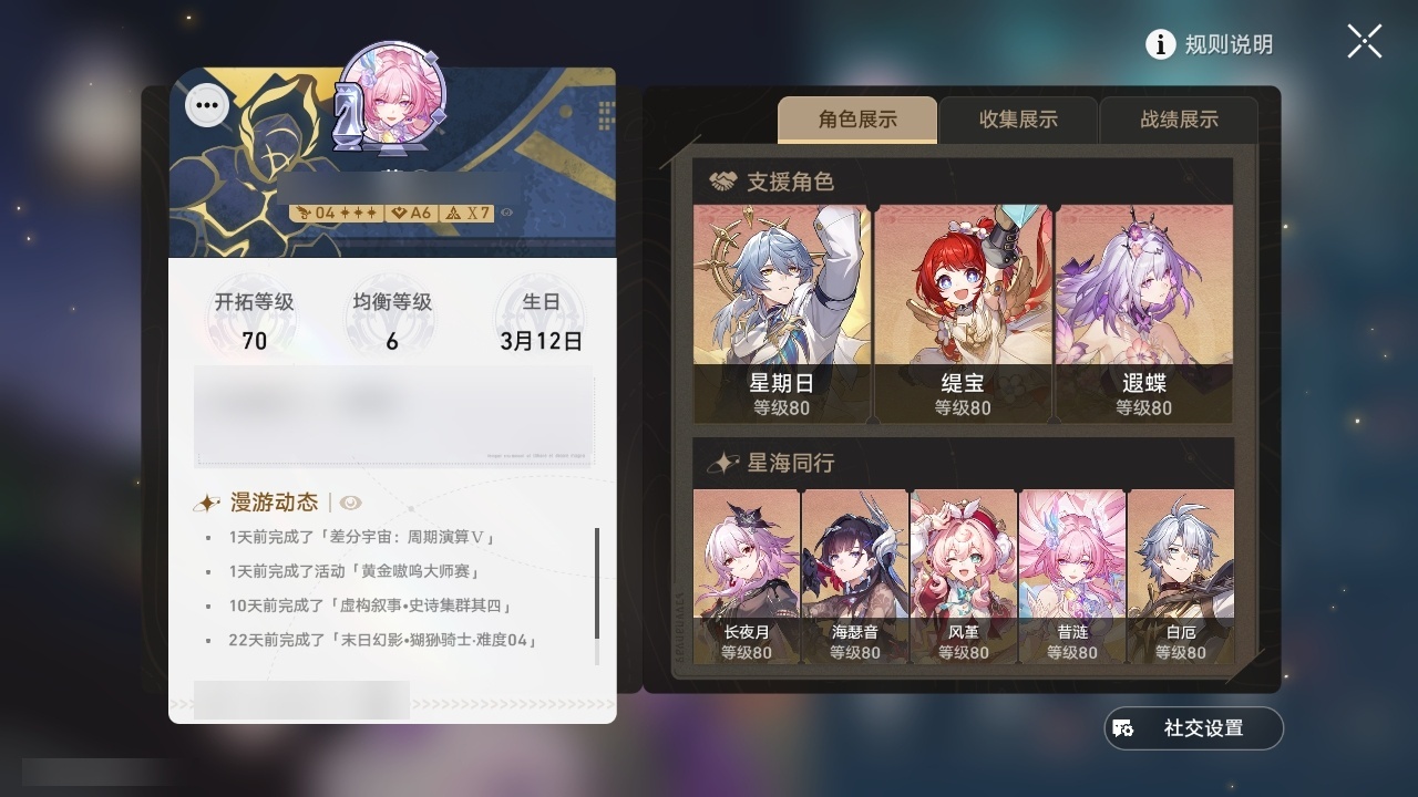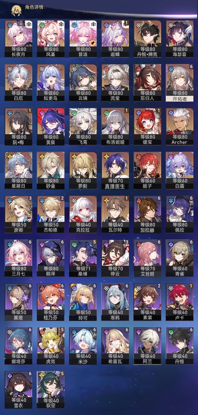 【崩坏·星穹铁道】【lyxq9057】冒险等级:70,女主,五星数量:40,五星角色:彦卿 3命杰帕德 2命布洛妮娅 1命瓦尔特 1命缇宝 1命遐蝶 1命云璃飞霄白露姬子克拉拉星期日忘归人罗刹真理医生黄泉风堇砂金知更鸟白厄archer海瑟音长夜月丹恒·腾荒昔涟流萤__五星光锥:孤独的疗愈 5精记忆永不落幕 5精记一位星神的陨落 2精银河铁道之夜 2精如泥酣眠 2精星海巡航时节不居但战斗还未结束我将,巡征追猎回到大地的飞行让告别,更美一些行于流逝的岸海洋为何而歌爱如此刻永恒__四星角色:阿兰 6命娜塔莎 6命貊泽 6命黑塔 6命丹恒 6命艾丝妲 6命希露瓦 6命三月七 6命青雀 6命佩拉 6命玲可 6命桂乃芬 6命寒鸦 6命雪衣 6命米沙 6命加拉赫 6命虎克 5命桑博 5命驭空 5命停云 3命素裳 2命卢卡 1命