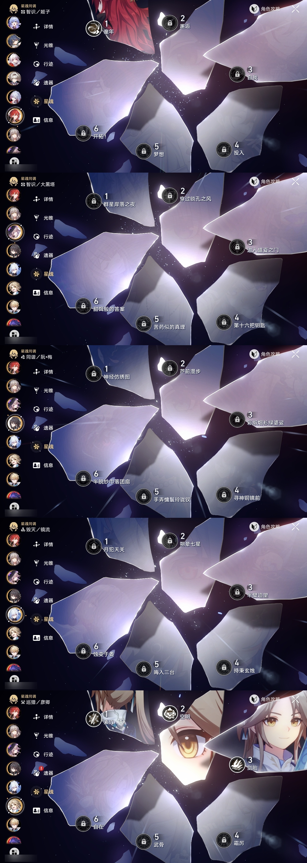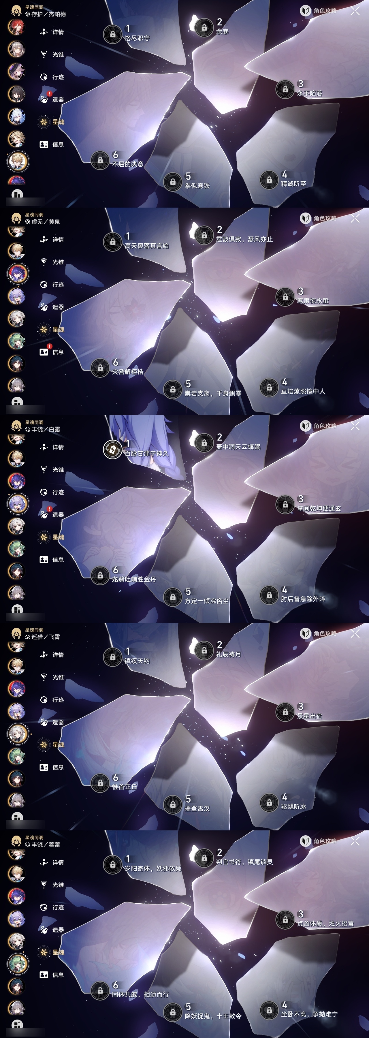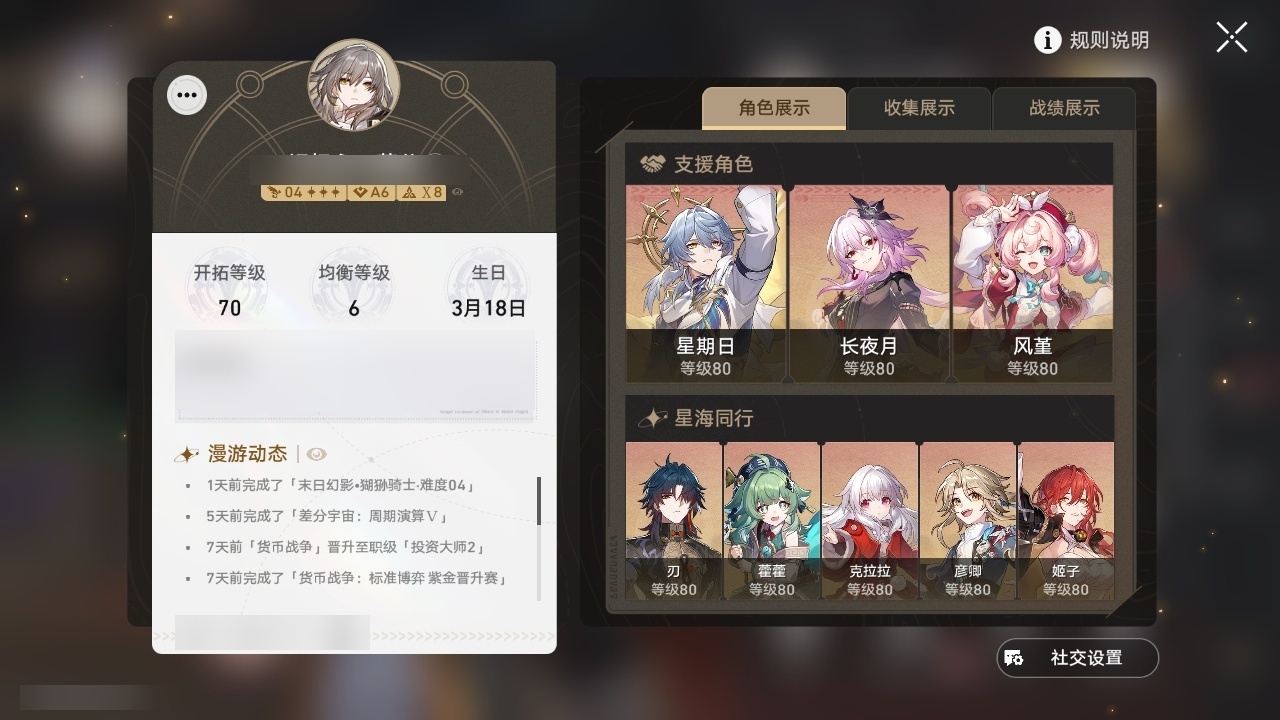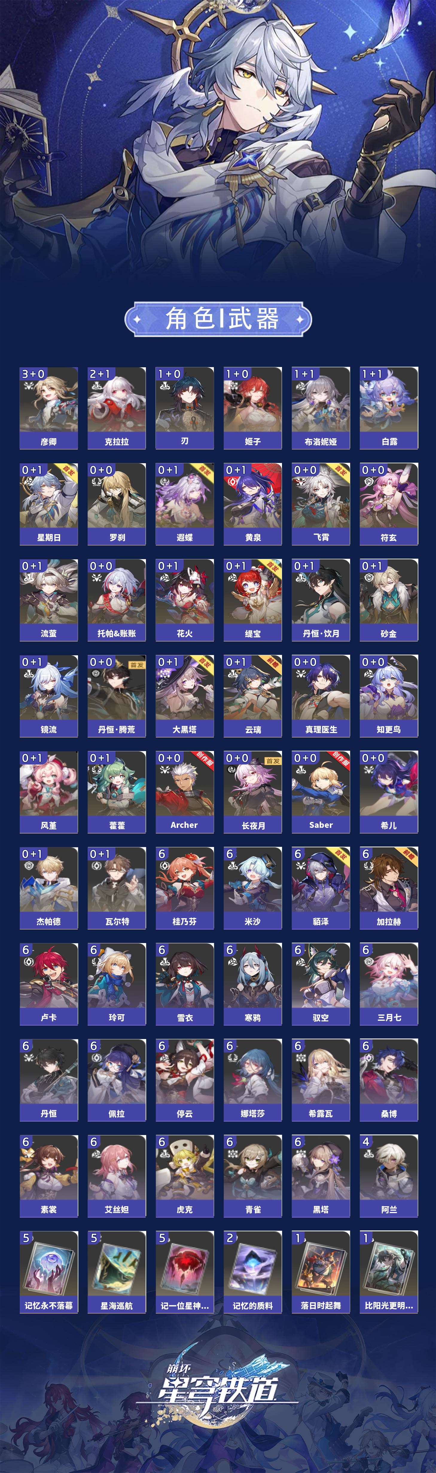 【崩坏·星穹铁道】【lyxq9048】冒险等级:70,女主,五星数量:60,五星角色:彦卿 3命克拉拉 2命白露 1命布洛妮娅 1命姬子 1命刃 1命云璃飞霄希儿杰帕德瓦尔特星期日大黑塔罗刹缇宝丹恒·饮月遐蝶符玄镜流托帕账账藿藿真理医生花火黄泉风堇砂金知更鸟saberarcher长夜月丹恒·腾荒流萤__五星光锥:星海巡航 5精记一位星神的陨落 5精不息的演算 5精记忆永不落幕 5精记忆的质料 2精落日时起舞制胜的瞬间以世界之名以世界之名无可取代的东西时节不居但战斗还未结束但战斗还未结束但战斗还未结束回到大地的飞行向着不可追问处如果时间是一朵花孤独的疗愈比阳光更明亮的让告别,更美一些此身为剑惊魂夜镜中故我游戏尘寰行于流逝的岸愿虹光永驻天空命运从未公平梦应归于何处__四星角色:娜塔莎 6命虎克 6命貊泽 6命黑塔 6命丹恒 6命艾丝妲 6命希露瓦 6命停云 6命素裳 6命桑博 6命三月七 6命青雀 6命佩拉 6命驭空 6命卢卡 6命玲可 6命桂乃芬 6命寒鸦 6命雪衣 6命米沙 6命加拉赫 6命阿兰 4命
