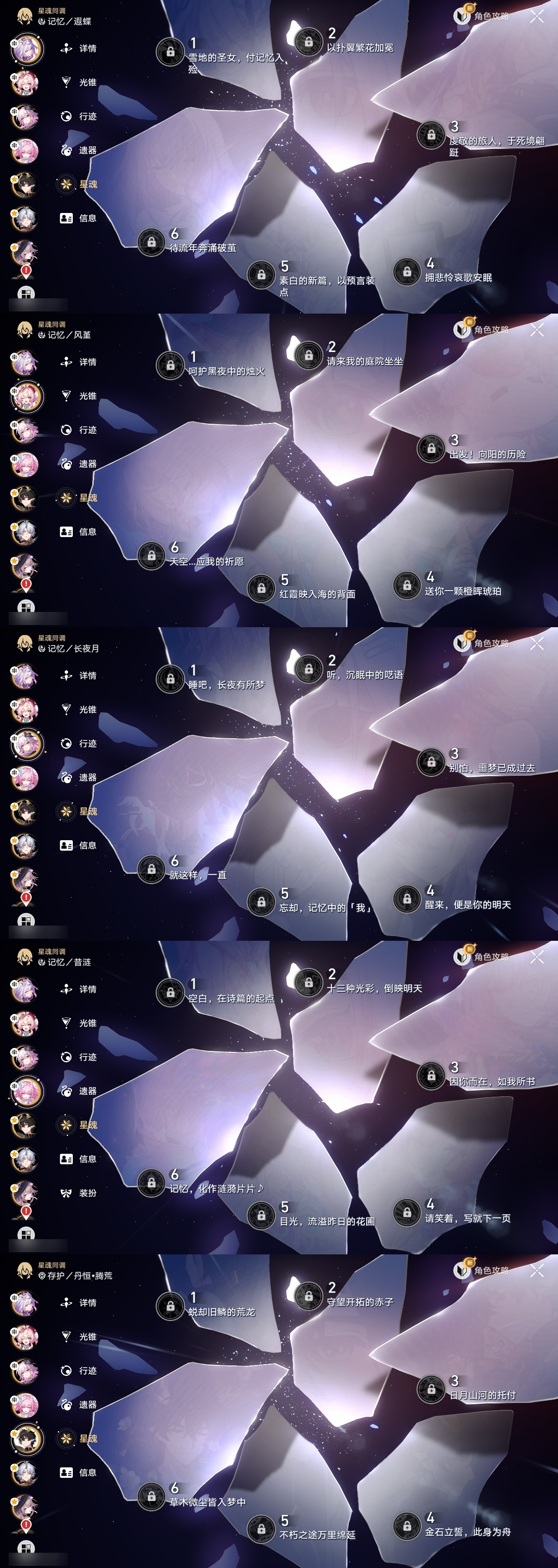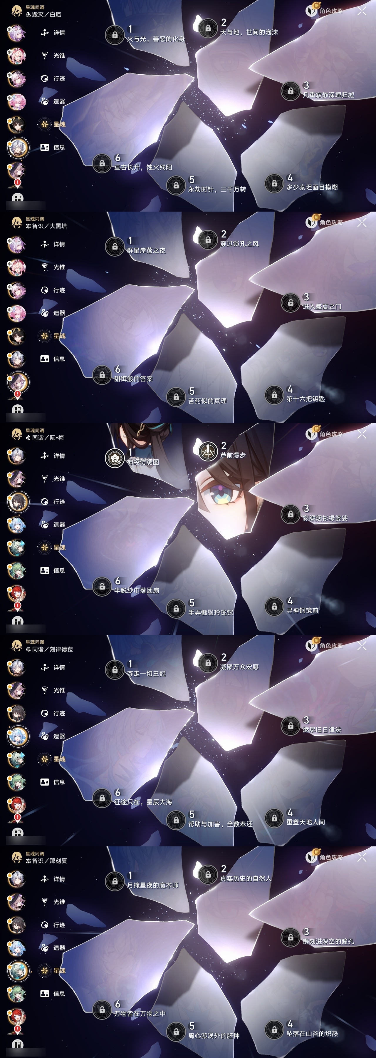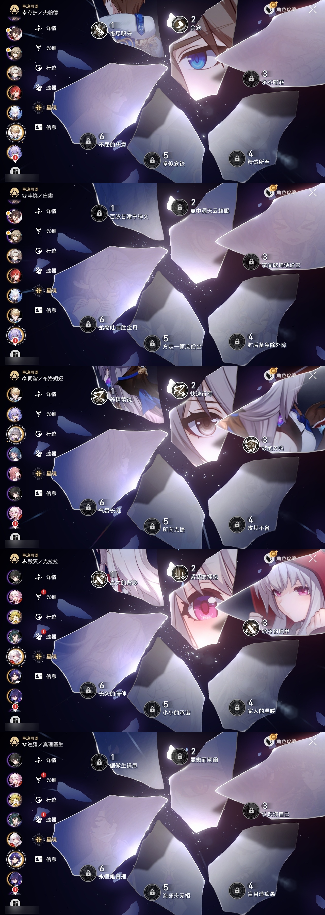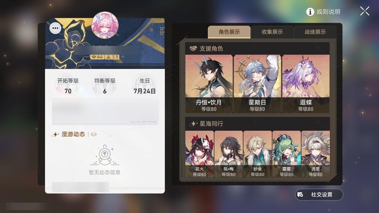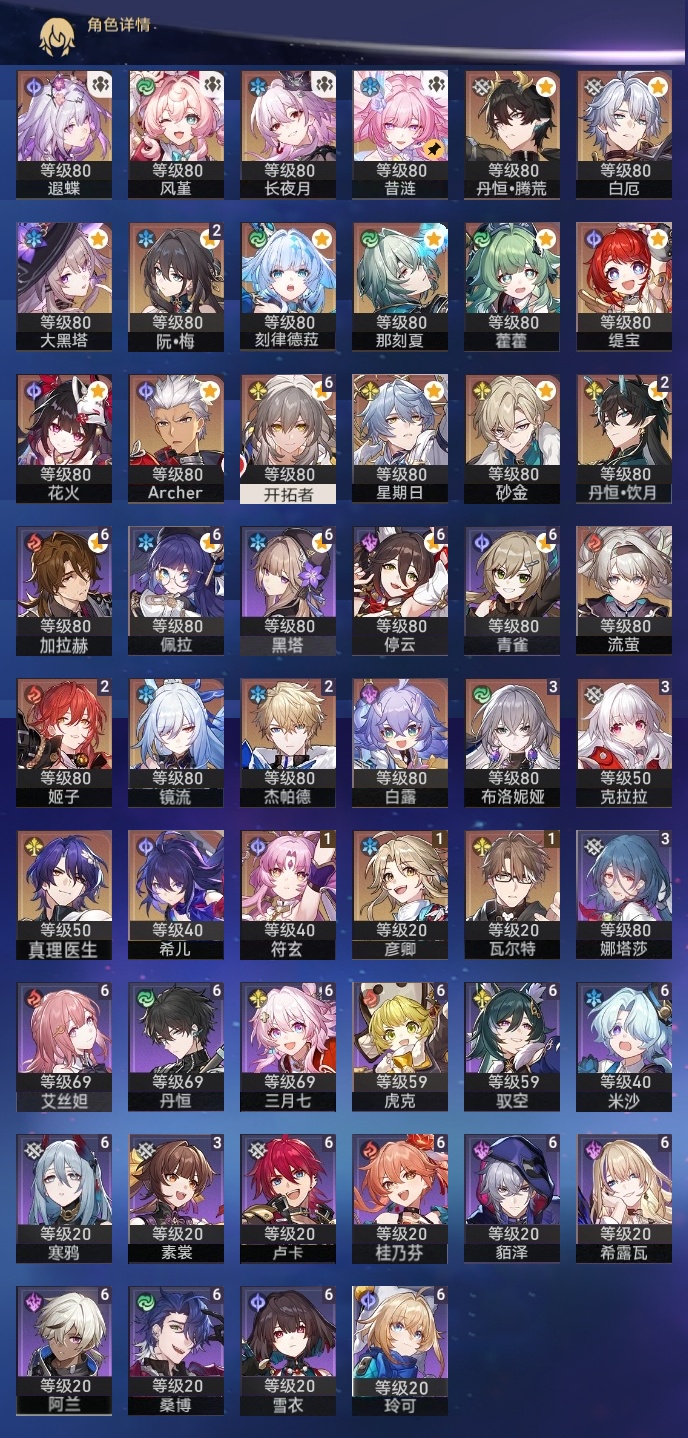 【崩坏·星穹铁道】【lyxq9072】冒险等级:70,女主,五星数量:47,五星角色:布洛妮娅 3命克拉拉 3命姬子 2命杰帕德 2命丹恒·饮月 2命彦卿 1命瓦尔特 1命符玄 1命希儿白露星期日大黑塔缇宝遐蝶镜流藿藿真理医生花火那刻夏风堇砂金白厄archer刻律德菈长夜月丹恒·腾荒昔涟流萤__五星光锥:星海巡航 5精记忆的质料 5精记一位星神的陨落 5精不息的演算 5精孤独的疗愈 5精记忆永不落幕 5精银河铁道之夜以世界之名无可取代的东西无可取代的东西时节不居时节不居回到大地的飞行比阳光更明亮的此身为剑镜中故我黎明恰如此燃烧理想燃烧的地狱纵然山河万程__四星角色:阿兰 6命虎克 6命貊泽 6命黑塔 6命丹恒 6命艾丝妲 6命希露瓦 6命停云 6命桑博 6命三月七 6命青雀 6命佩拉 6命驭空 6命卢卡 6命玲可 6命桂乃芬 6命寒鸦 6命雪衣 6命米沙 6命加拉赫 6命娜塔莎 3命素裳 3命