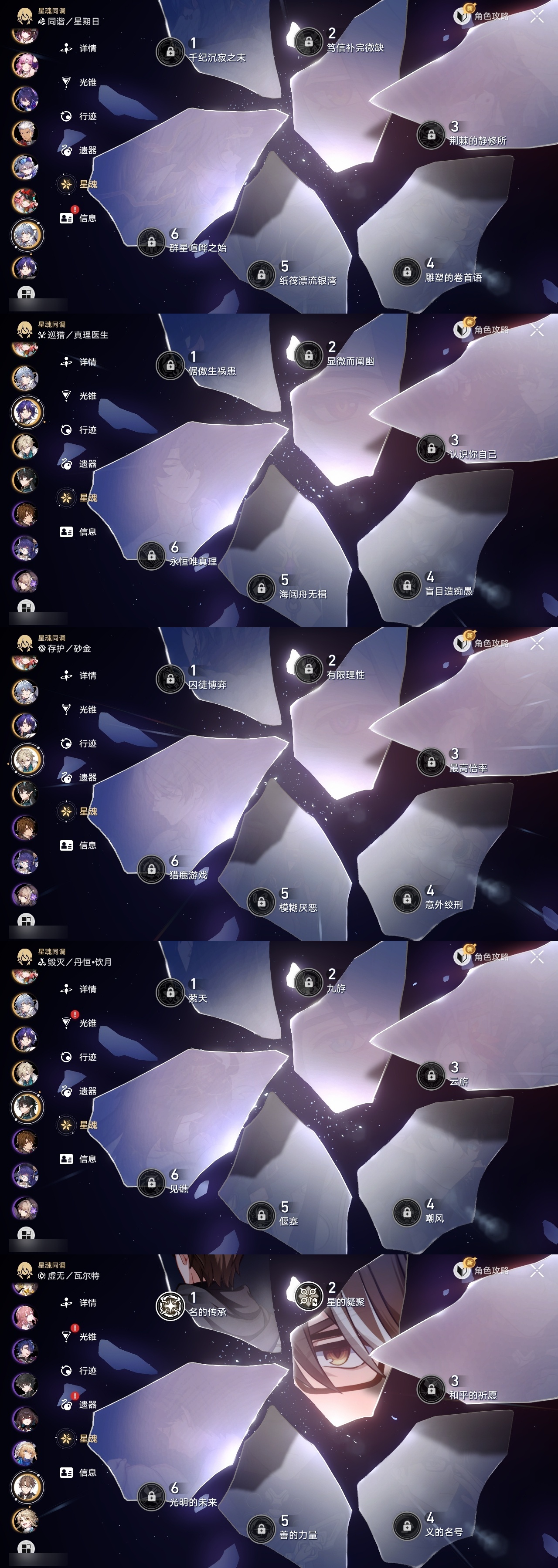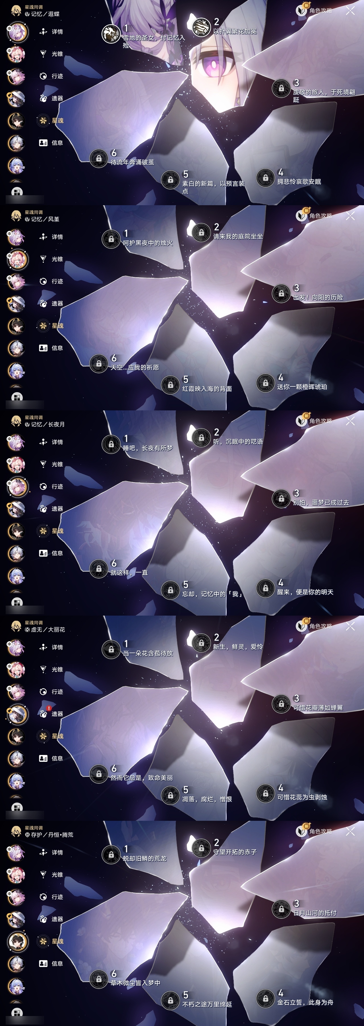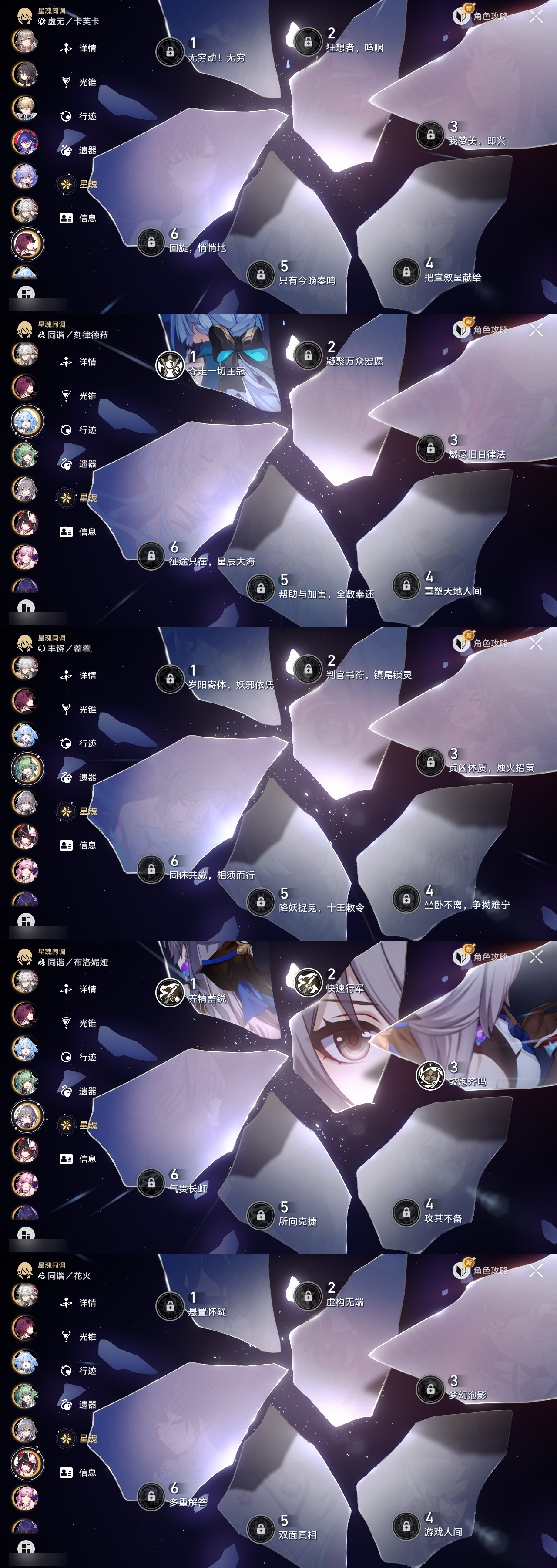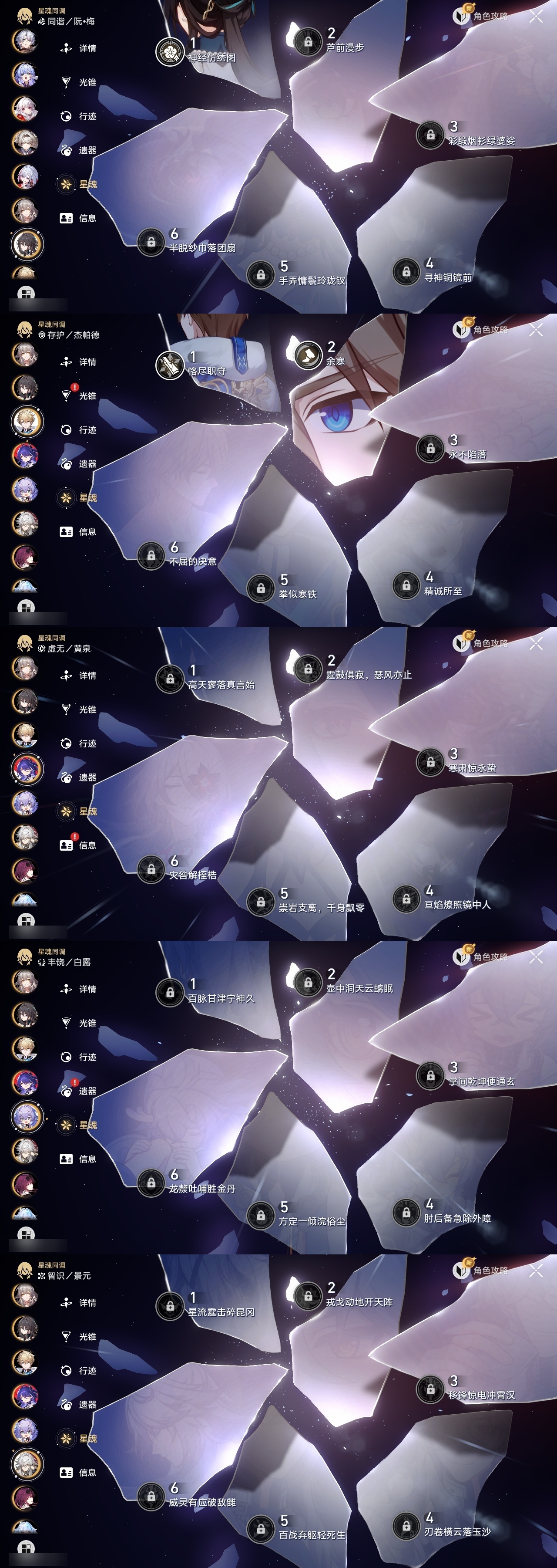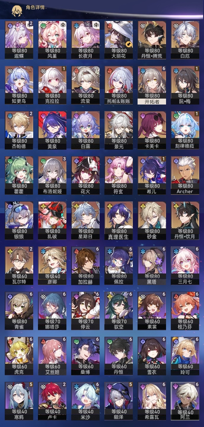 【崩坏·星穹铁道】【lyxq9145】冒险等级:70,女主,五星数量:50,五星角色:布洛妮娅 3命杰帕德 2命瓦尔特 2命遐蝶 2命希儿 1命彦卿 1命克拉拉 1命刻律德菈 1命银狼景元白露乱破星期日卡芙卡丹恒·饮月符玄托帕账账藿藿真理医生花火黄泉风堇砂金知更鸟白厄archer长夜月丹恒·腾荒大丽花流萤__五星光锥:星海巡航 5精记忆的质料 5精记一位星神的陨落 5精不息的演算 5精记忆永不落幕 5精无可取代的东西 4精孤独的疗愈 4精时节不居如泥酣眠如泥酣眠但战斗还未结束于夜色中只需等待比阳光更明亮的让告别,更美一些烦恼着,幸福着纯粹思维的洗礼行于流逝的岸愿虹光永驻天空梦应归于何处__四星角色:阿兰 6命娜塔莎 6命虎克 6命黑塔 6命丹恒 6命艾丝妲 6命希露瓦 6命停云 6命素裳 6命桑博 6命三月七 6命青雀 6命佩拉 6命驭空 6命玲可 6命桂乃芬 6命雪衣 6命米沙 6命加拉赫 6命貊泽 5命寒鸦 5命卢卡 2命