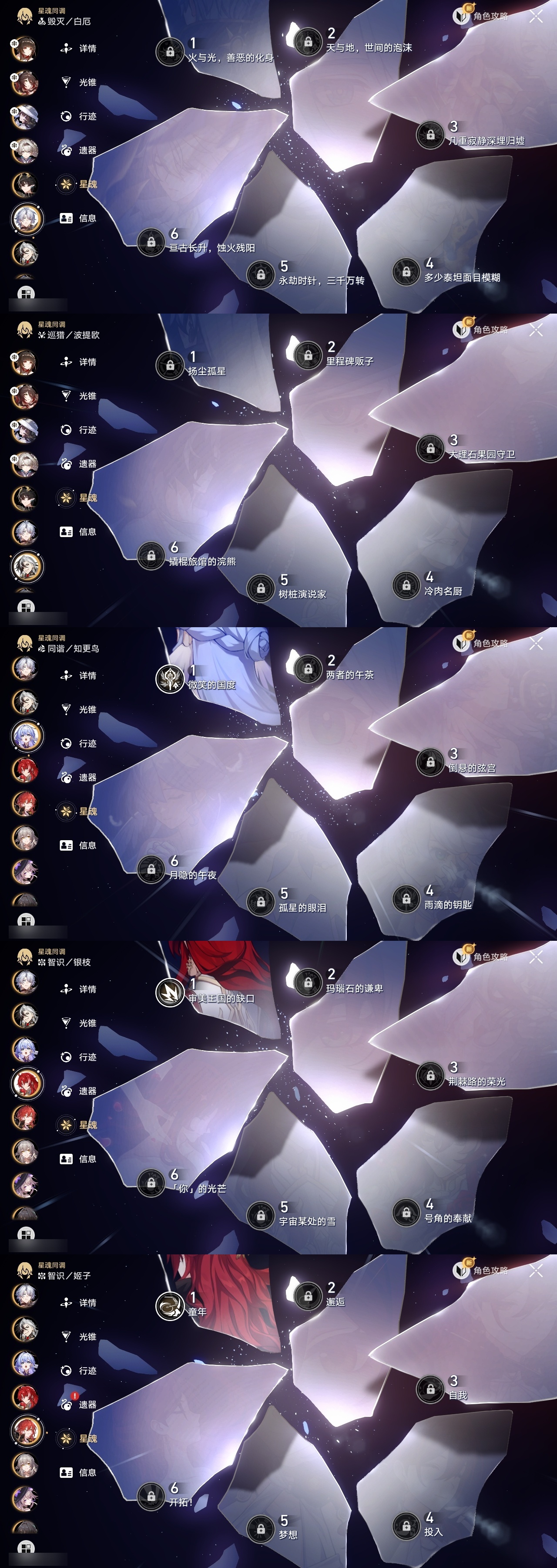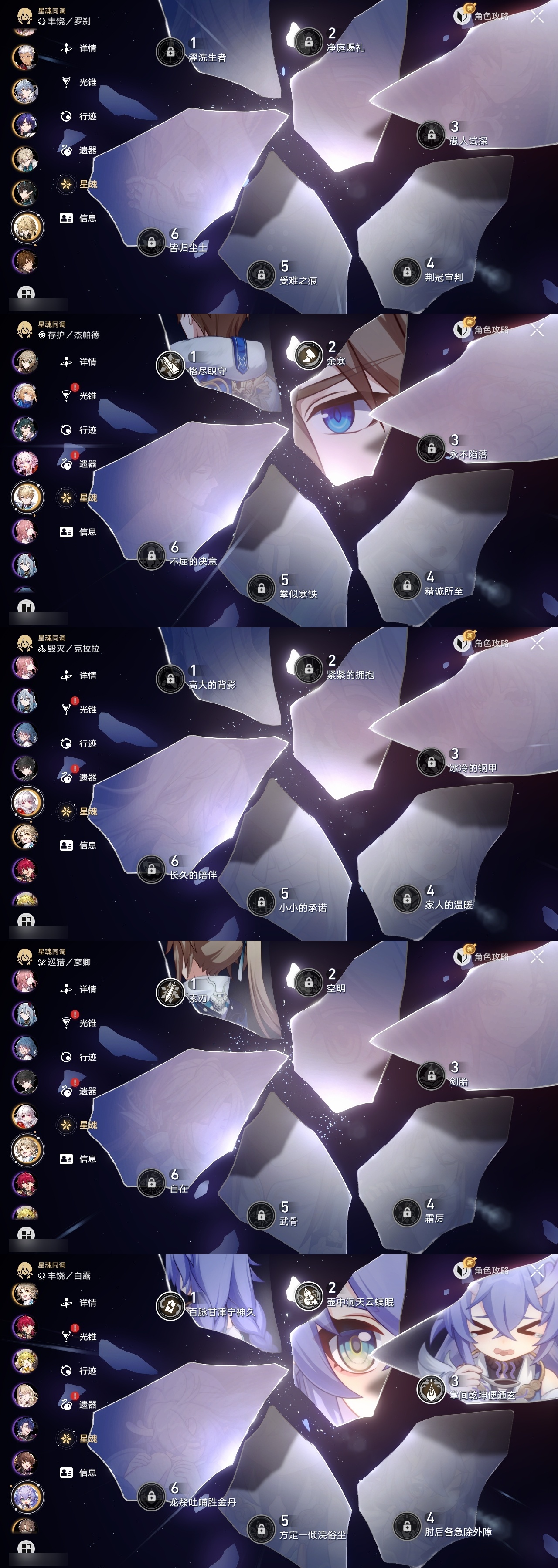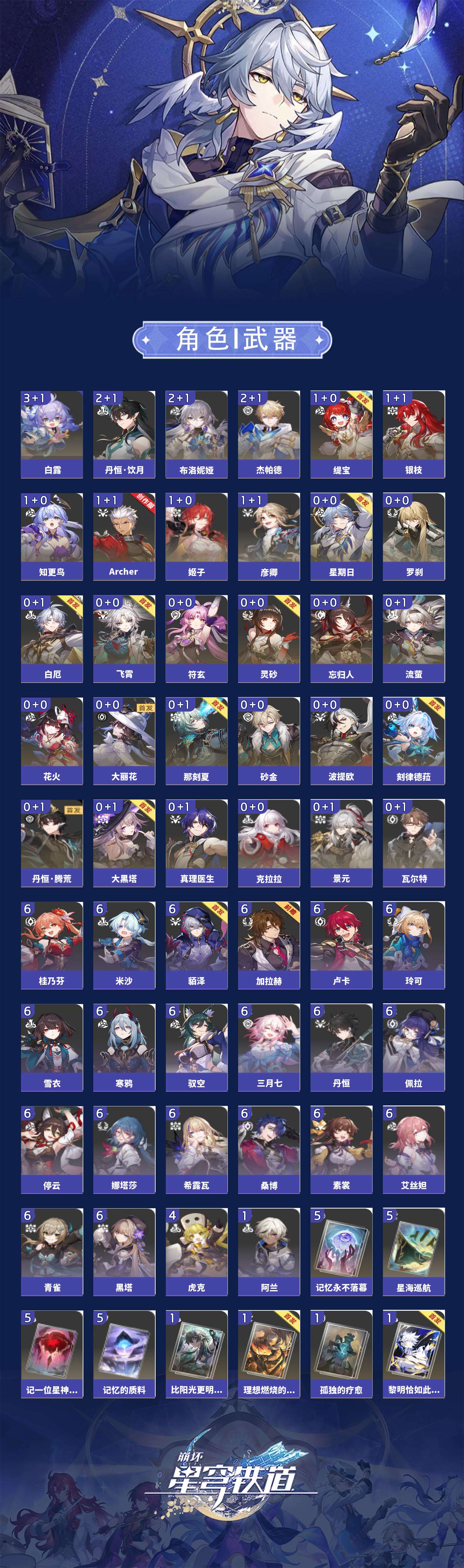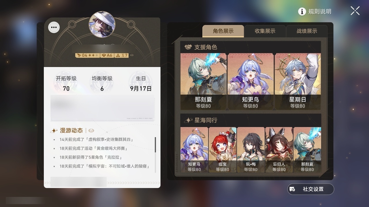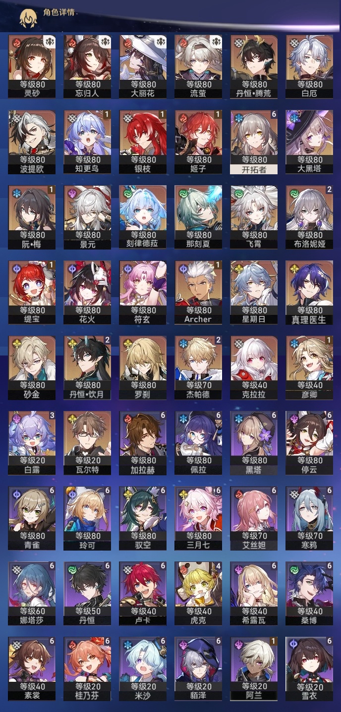 【崩坏·星穹铁道】【lyxq9111】冒险等级:70,女主,五星数量:53,五星角色:白露 3命布洛妮娅 2命杰帕德 2命丹恒·饮月 2命姬子 1命彦卿 1命缇宝 1命银枝 1命知更鸟 1命archer 1命飞霄景元灵砂瓦尔特克拉拉星期日大黑塔忘归人罗刹符玄真理医生花火那刻夏砂金白厄刻律德菈丹恒·腾荒大丽花波提欧流萤__五星光锥:星海巡航 5精记忆的质料 5精记一位星神的陨落 5精不息的演算 5精记忆永不落幕 5精制胜的瞬间以世界之名时节不居如泥酣眠但战斗还未结束但战斗还未结束但战斗还未结束拂晓之前向着不可追问处孤独的疗愈比阳光更明亮的片刻,留在眼底纯粹思维的洗礼生命当付之一炬黎明恰如此燃烧理想燃烧的地狱纵然山河万程梦应归于何处__四星角色:娜塔莎 6命貊泽 6命黑塔 6命丹恒 6命艾丝妲 6命希露瓦 6命停云 6命素裳 6命桑博 6命三月七 6命青雀 6命佩拉 6命驭空 6命卢卡 6命玲可 6命桂乃芬 6命寒鸦 6命雪衣 6命米沙 6命加拉赫 6命虎克 4命阿兰 1命