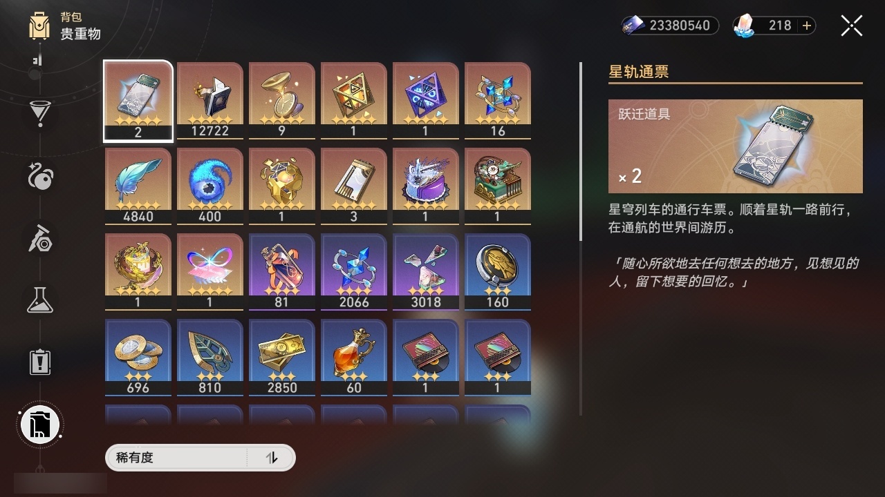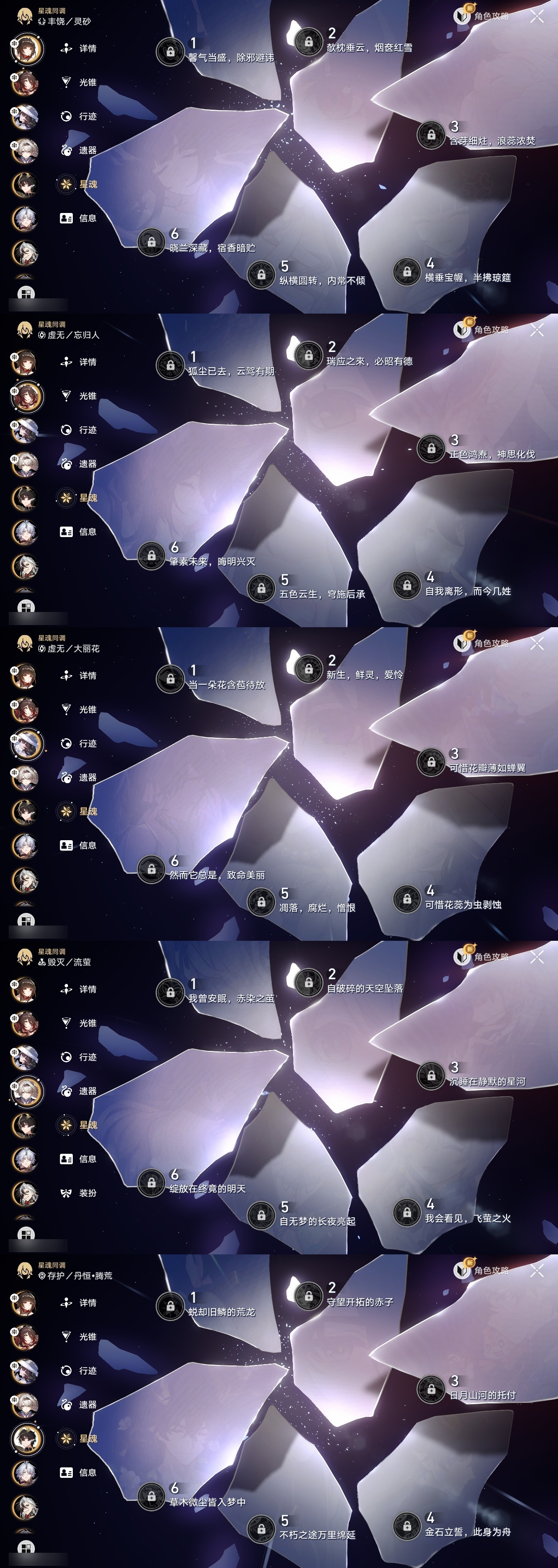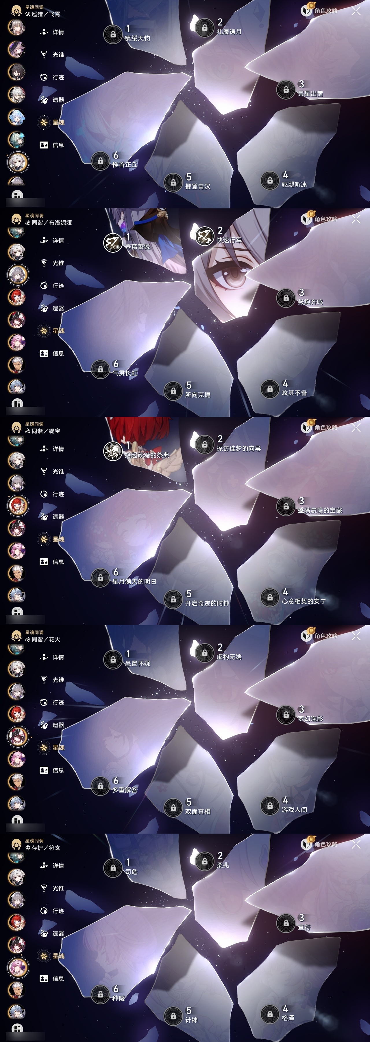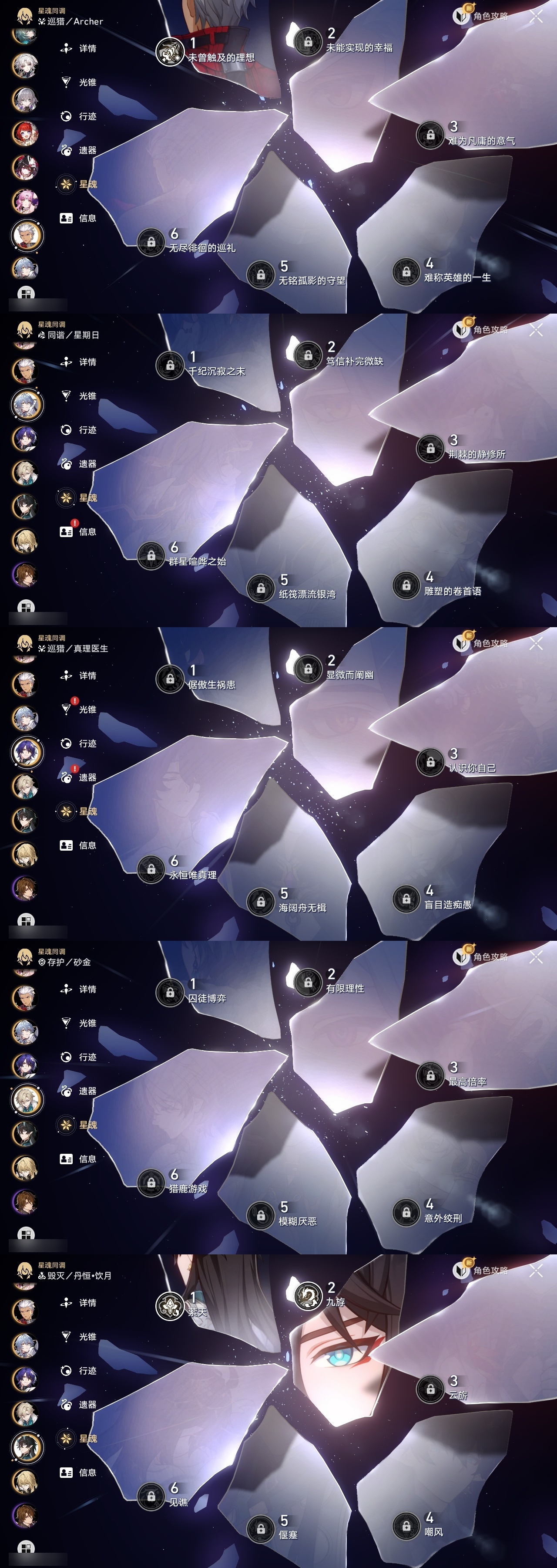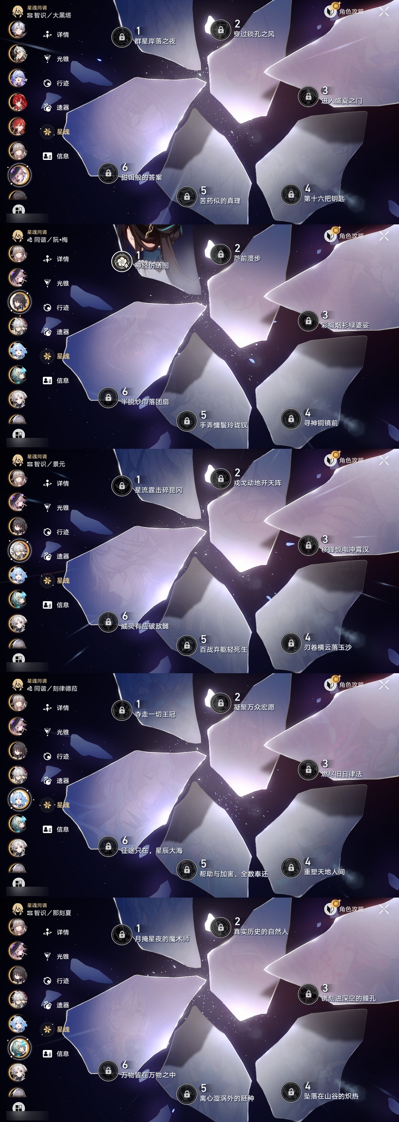 【崩坏·星穹铁道】【lyxq9111】冒险等级:70,女主,五星数量:53,五星角色:白露 3命布洛妮娅 2命杰帕德 2命丹恒·饮月 2命姬子 1命彦卿 1命缇宝 1命银枝 1命知更鸟 1命archer 1命飞霄景元灵砂瓦尔特克拉拉星期日大黑塔忘归人罗刹符玄真理医生花火那刻夏砂金白厄刻律德菈丹恒·腾荒大丽花波提欧流萤__五星光锥:星海巡航 5精记忆的质料 5精记一位星神的陨落 5精不息的演算 5精记忆永不落幕 5精制胜的瞬间以世界之名时节不居如泥酣眠但战斗还未结束但战斗还未结束但战斗还未结束拂晓之前向着不可追问处孤独的疗愈比阳光更明亮的片刻,留在眼底纯粹思维的洗礼生命当付之一炬黎明恰如此燃烧理想燃烧的地狱纵然山河万程梦应归于何处__四星角色:娜塔莎 6命貊泽 6命黑塔 6命丹恒 6命艾丝妲 6命希露瓦 6命停云 6命素裳 6命桑博 6命三月七 6命青雀 6命佩拉 6命驭空 6命卢卡 6命玲可 6命桂乃芬 6命寒鸦 6命雪衣 6命米沙 6命加拉赫 6命虎克 4命阿兰 1命