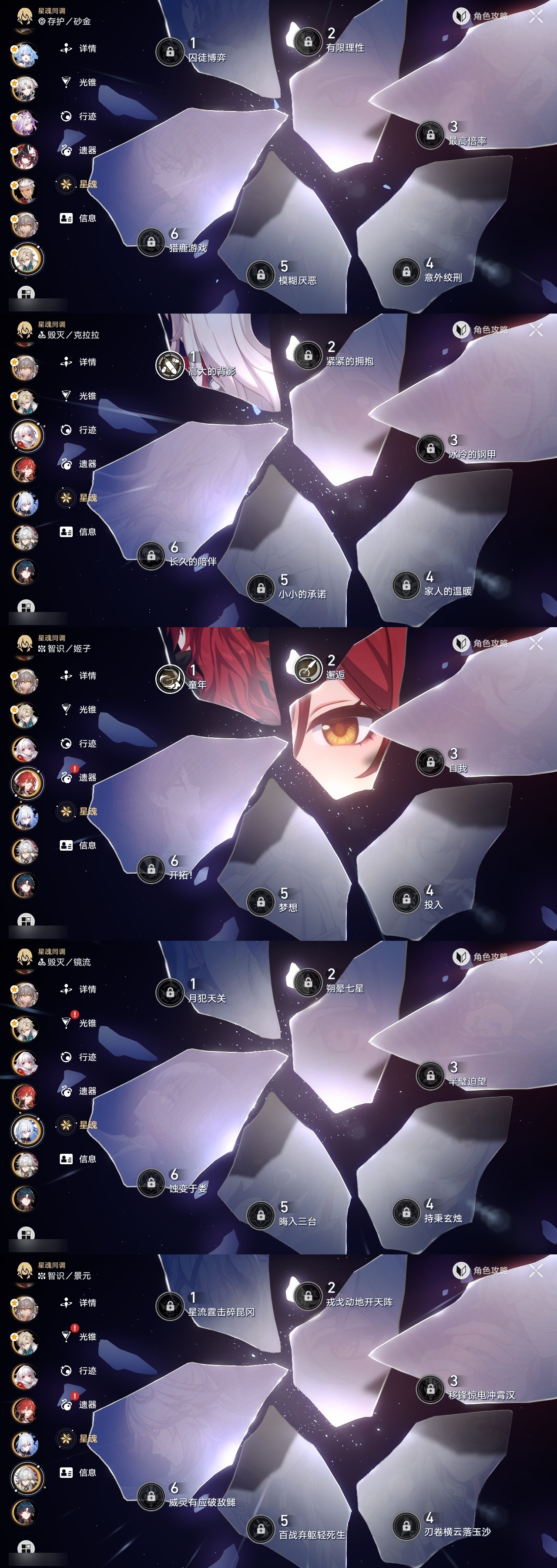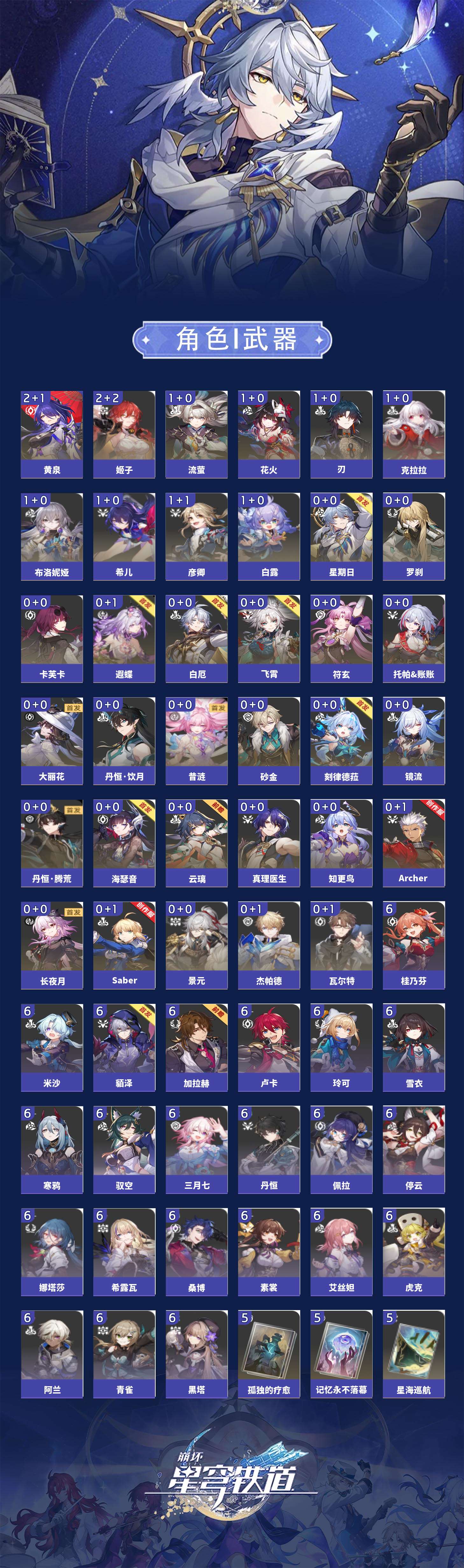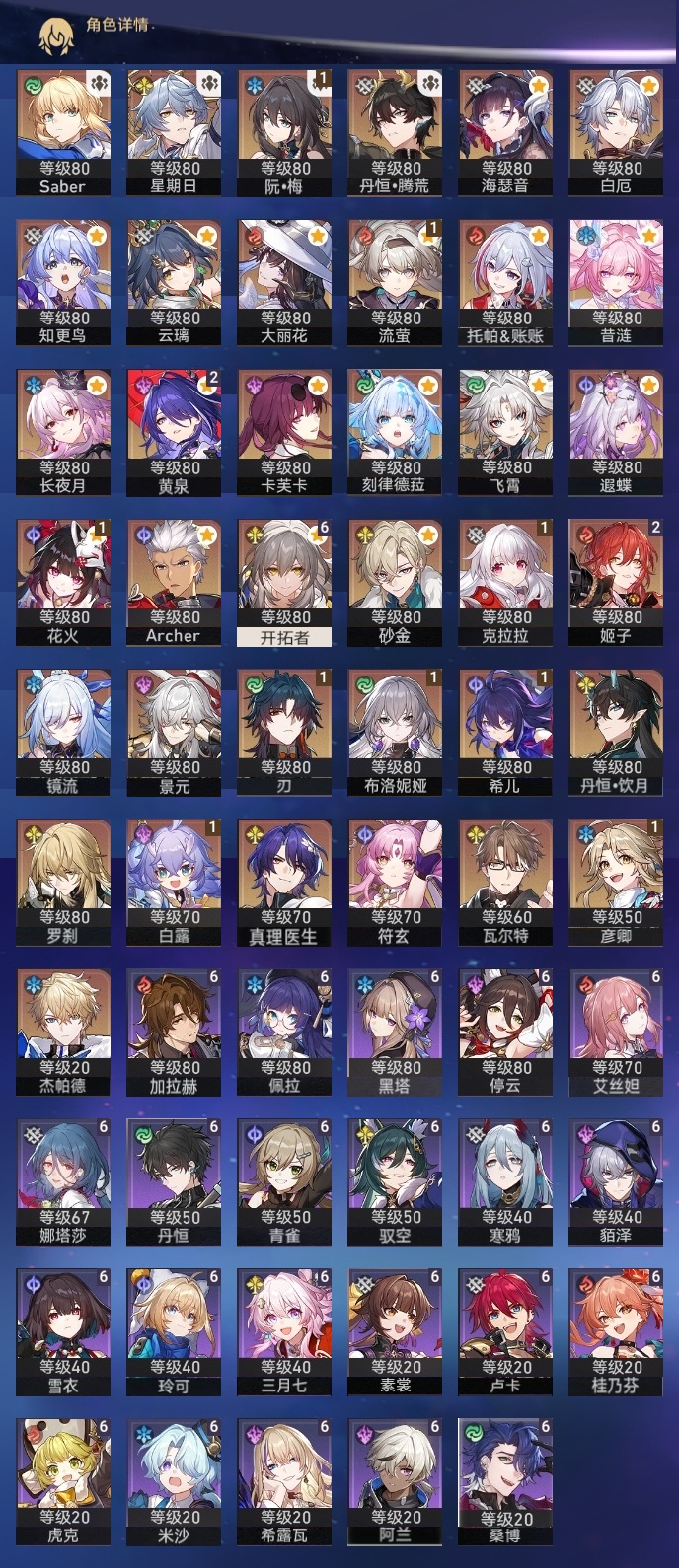 【崩坏·星穹铁道】【lyxq9168】冒险等级:70,女主,五星数量:49,五星角色:姬子 2命黄泉 2命希儿 1命白露 1命布洛妮娅 1命彦卿 1命克拉拉 1命刃 1命花火 1命流萤 1命云璃飞霄景元杰帕德瓦尔特星期日罗刹卡芙卡丹恒·饮月遐蝶符玄镜流托帕账账真理医生砂金知更鸟白厄saberarcher海瑟音刻律德菈长夜月丹恒·腾荒昔涟大丽花__五星光锥:星海巡航 5精记忆的质料 5精记一位星神的陨落 5精不息的演算 5精孤独的疗愈 5精记忆永不落幕 5精银河铁道之夜 2精制胜的瞬间以世界之名如泥酣眠让告别,更美一些行于流逝的岸理想燃烧的地狱没有回报的加冕__四星角色:阿兰 6命娜塔莎 6命虎克 6命貊泽 6命黑塔 6命丹恒 6命艾丝妲 6命希露瓦 6命停云 6命素裳 6命桑博 6命三月七 6命青雀 6命佩拉 6命驭空 6命卢卡 6命玲可 6命桂乃芬 6命寒鸦 6命雪衣 6命米沙 6命加拉赫 6命