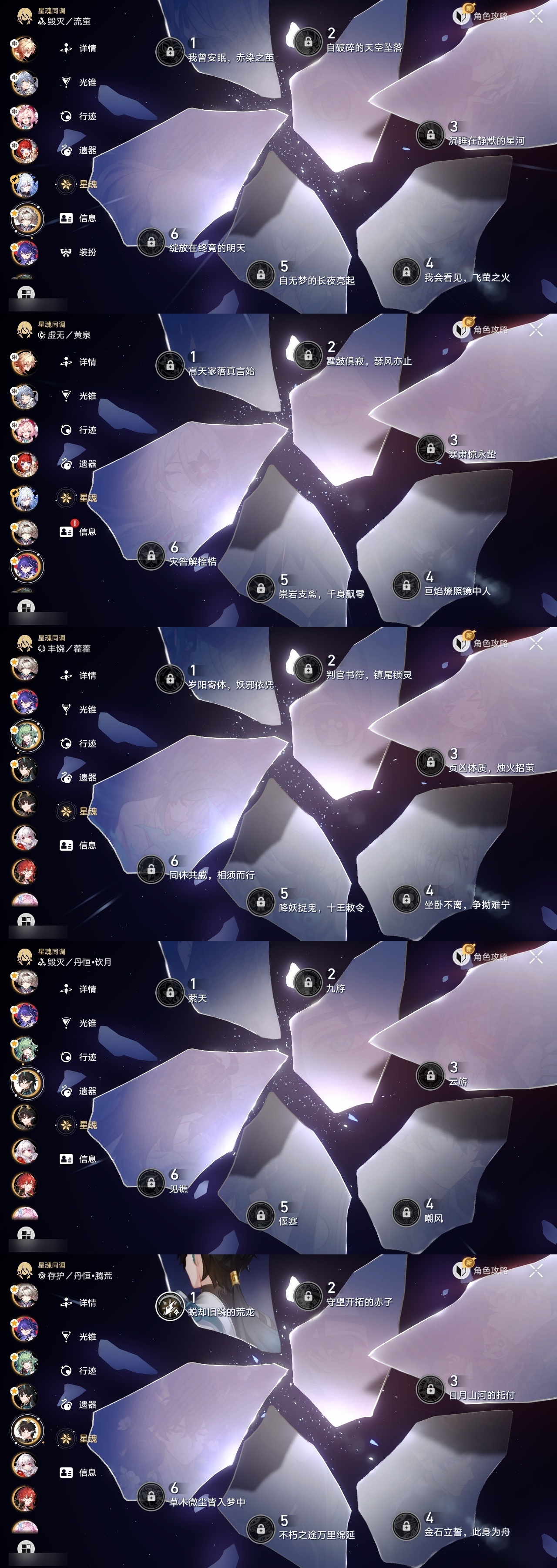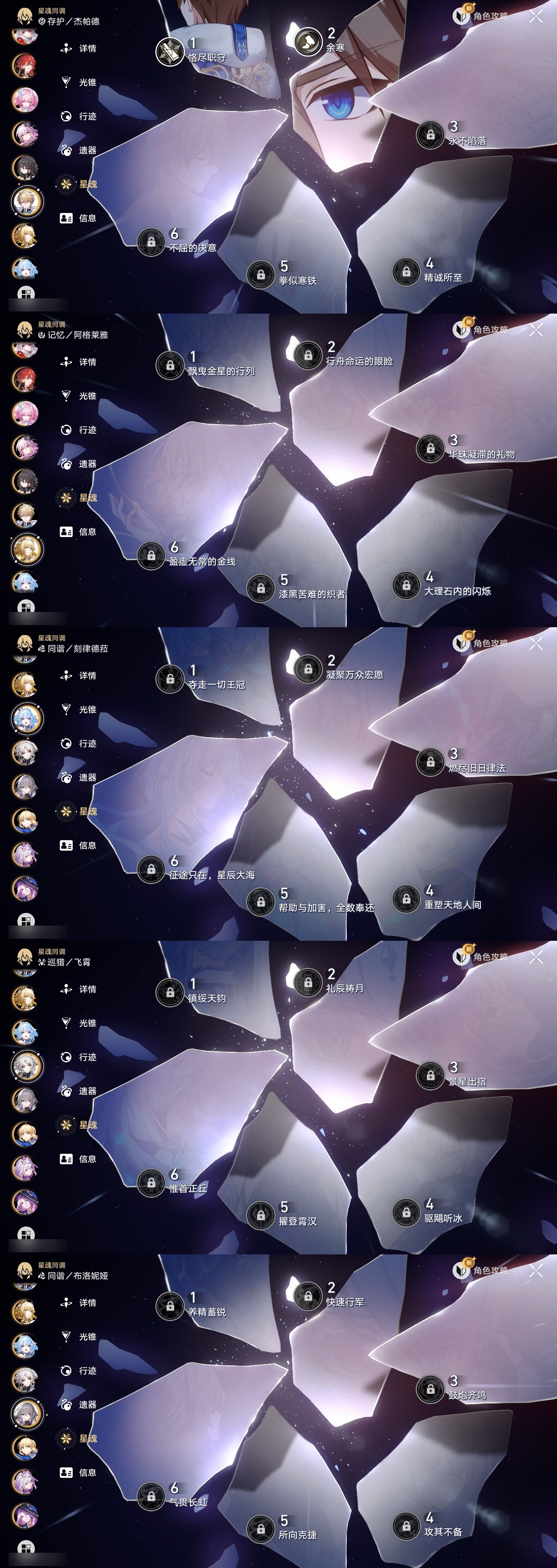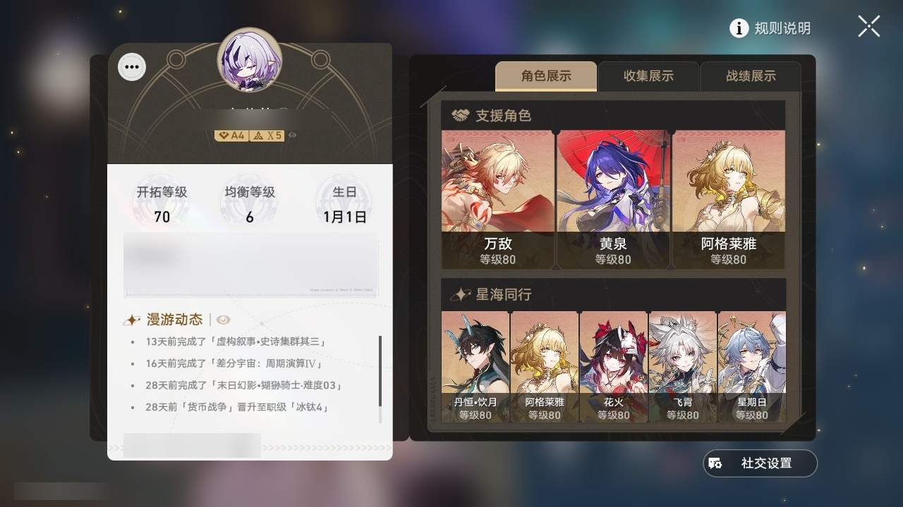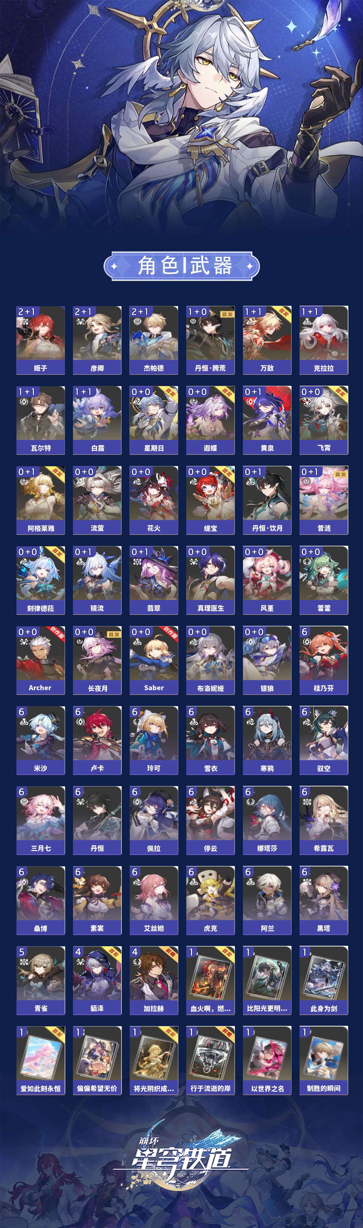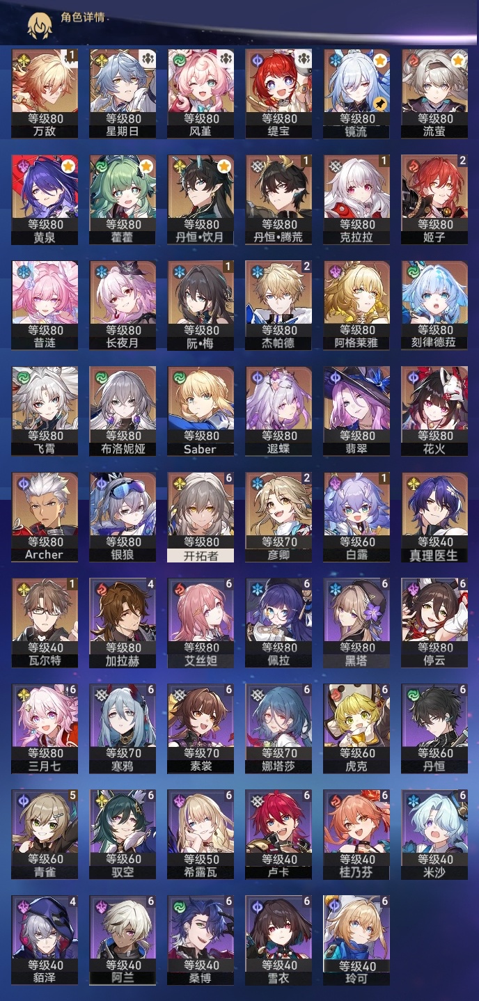 【崩坏·星穹铁道】【lyxq9142】冒险等级:70,女主,五星数量:42,五星角色:姬子 2命杰帕德 2命彦卿 2命白露 1命瓦尔特 1命克拉拉 1命万敌 1命丹恒·腾荒 1命飞霄银狼布洛妮娅星期日阿格莱雅缇宝丹恒·饮月遐蝶镜流藿藿真理医生花火黄泉风堇saberarcher刻律德菈长夜月昔涟流萤翡翠__五星光锥:制胜的瞬间银河铁道之夜以世界之名无可取代的东西时节不居如泥酣眠将光阴织成黄金血火啊,燃烧前路比阳光更明亮的此身为剑行于流逝的岸爱如此刻永恒偏偏希望无价__四星角色:阿兰 6命娜塔莎 6命虎克 6命黑塔 6命丹恒 6命艾丝妲 6命希露瓦 6命停云 6命素裳 6命桑博 6命三月七 6命佩拉 6命驭空 6命卢卡 6命玲可 6命桂乃芬 6命寒鸦 6命雪衣 6命米沙 6命青雀 5命貊泽 4命加拉赫 4命