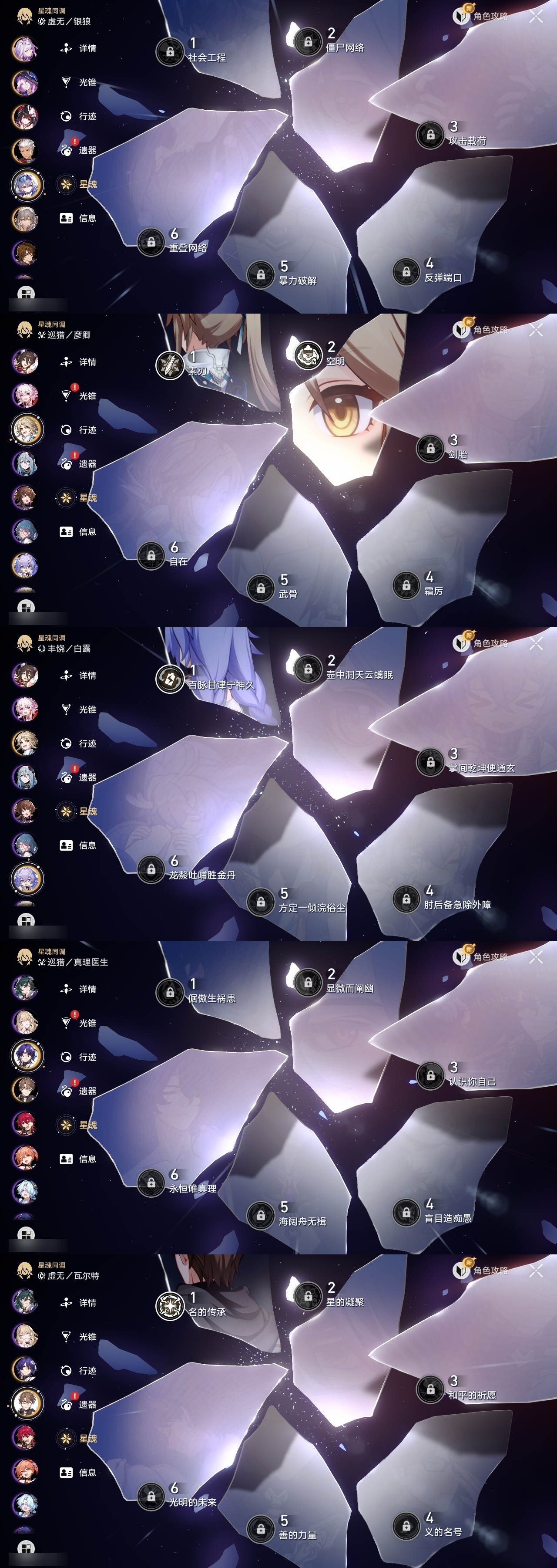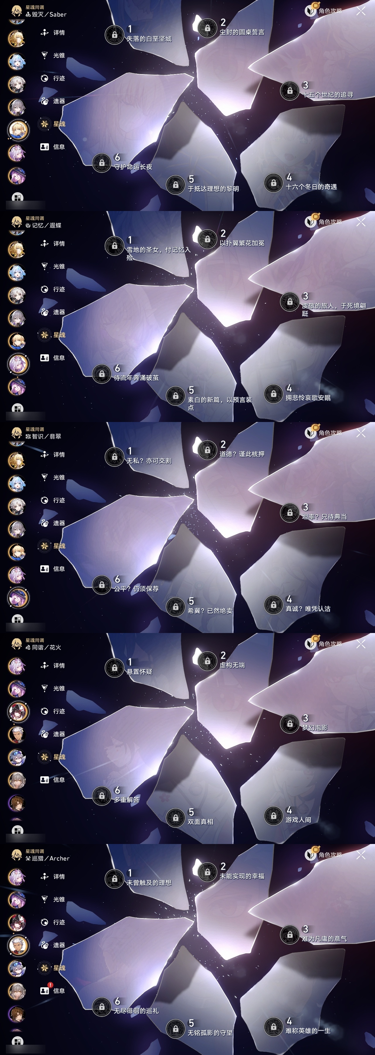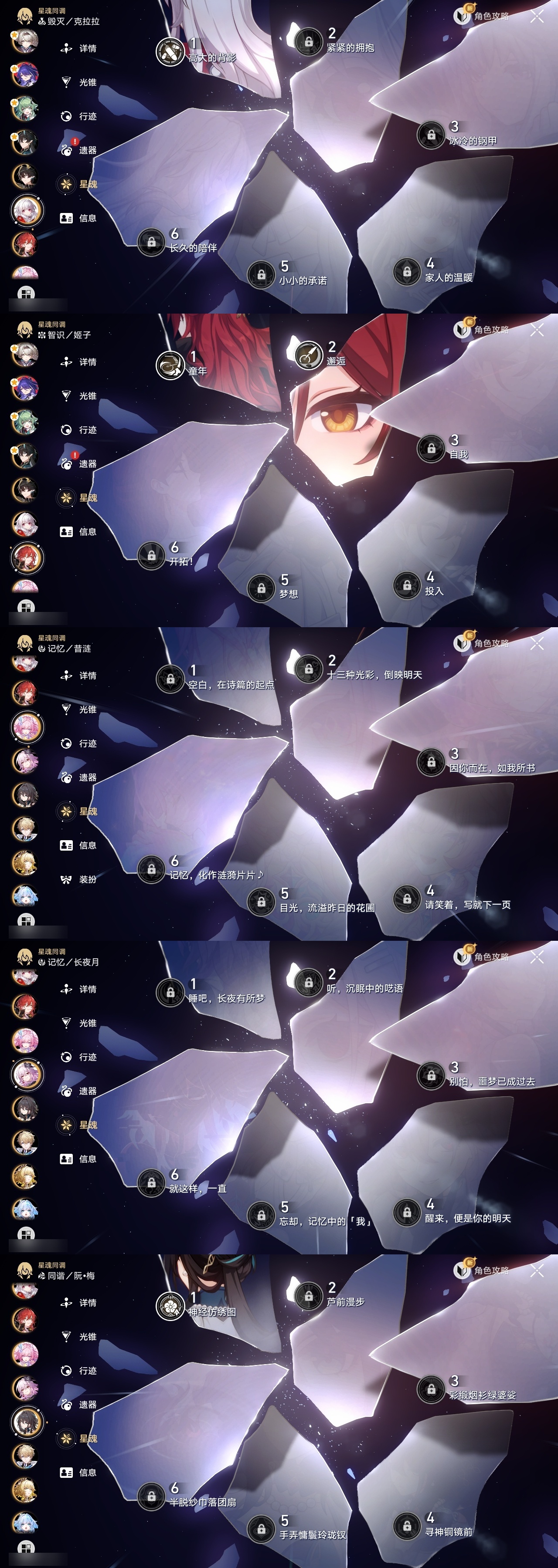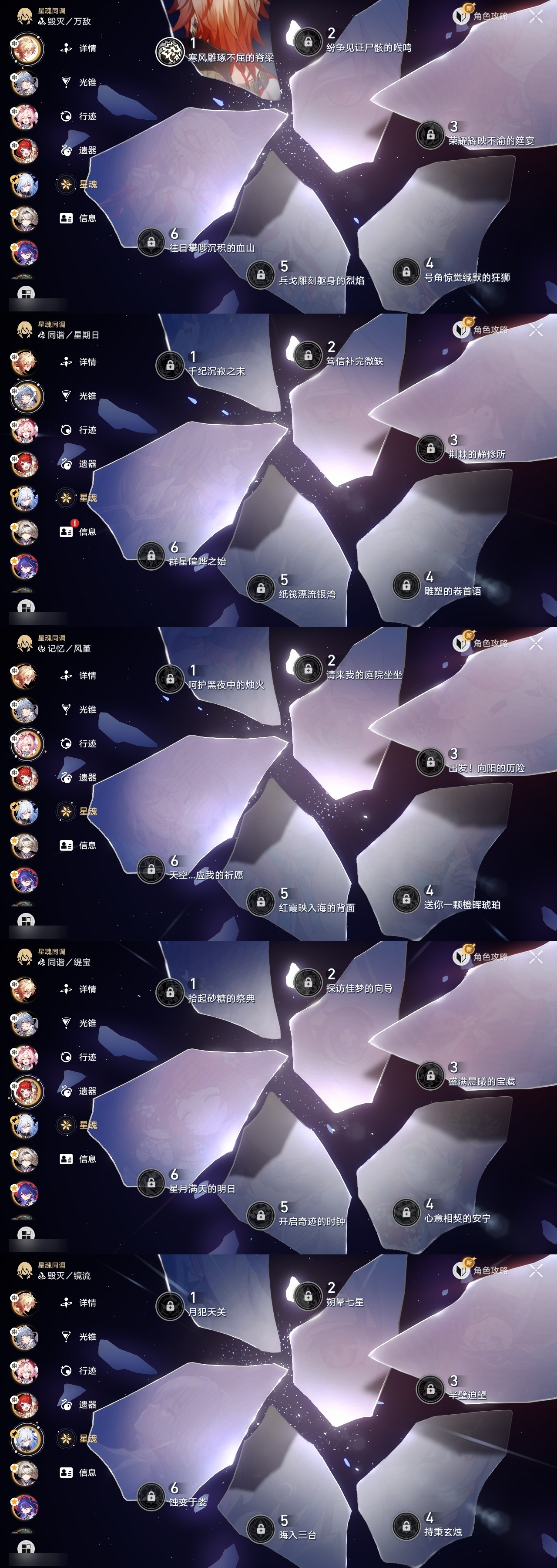 【崩坏·星穹铁道】【lyxq9142】冒险等级:70,女主,五星数量:42,五星角色:姬子 2命杰帕德 2命彦卿 2命白露 1命瓦尔特 1命克拉拉 1命万敌 1命丹恒·腾荒 1命飞霄银狼布洛妮娅星期日阿格莱雅缇宝丹恒·饮月遐蝶镜流藿藿真理医生花火黄泉风堇saberarcher刻律德菈长夜月昔涟流萤翡翠__五星光锥:制胜的瞬间银河铁道之夜以世界之名无可取代的东西时节不居如泥酣眠将光阴织成黄金血火啊,燃烧前路比阳光更明亮的此身为剑行于流逝的岸爱如此刻永恒偏偏希望无价__四星角色:阿兰 6命娜塔莎 6命虎克 6命黑塔 6命丹恒 6命艾丝妲 6命希露瓦 6命停云 6命素裳 6命桑博 6命三月七 6命佩拉 6命驭空 6命卢卡 6命玲可 6命桂乃芬 6命寒鸦 6命雪衣 6命米沙 6命青雀 5命貊泽 4命加拉赫 4命