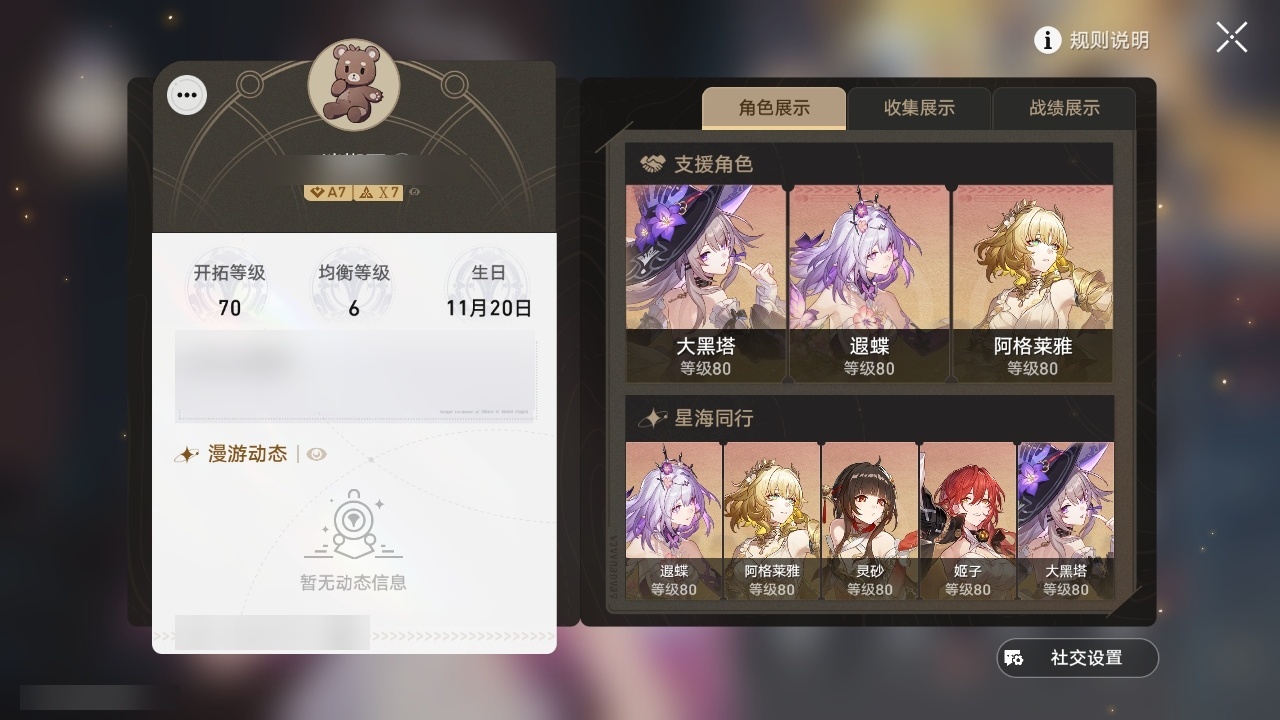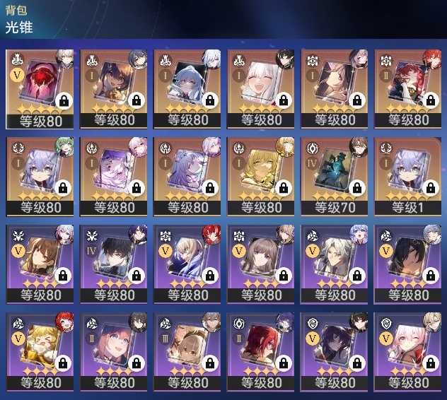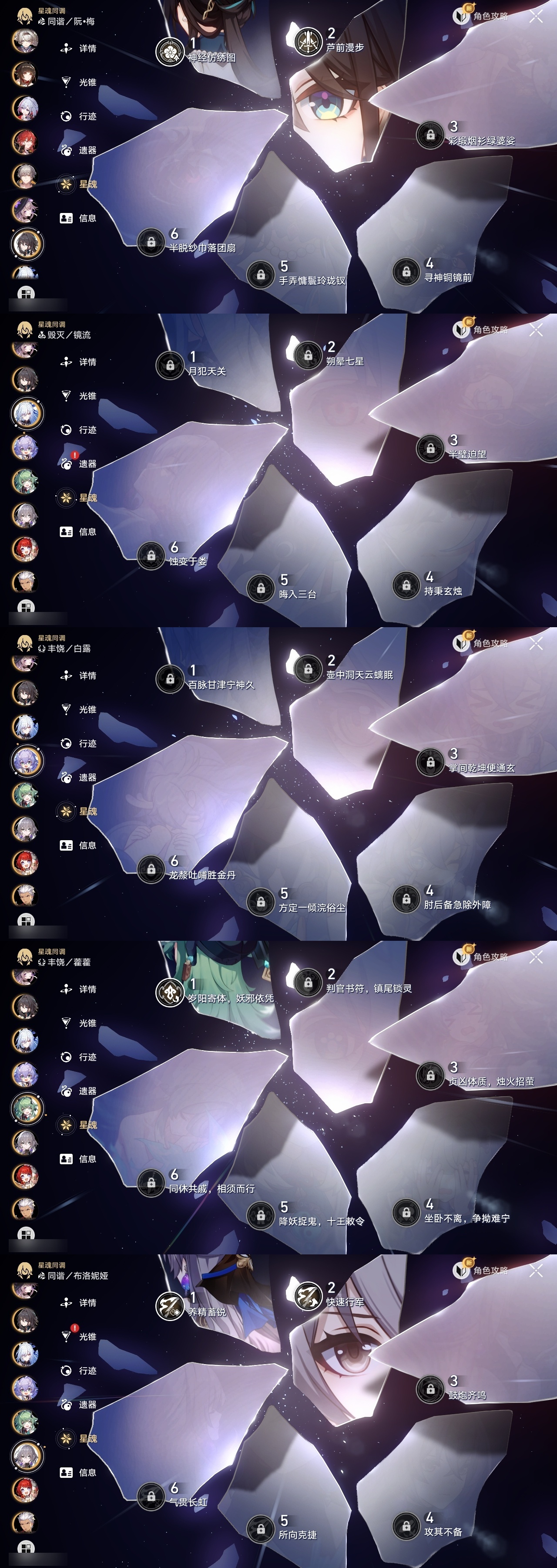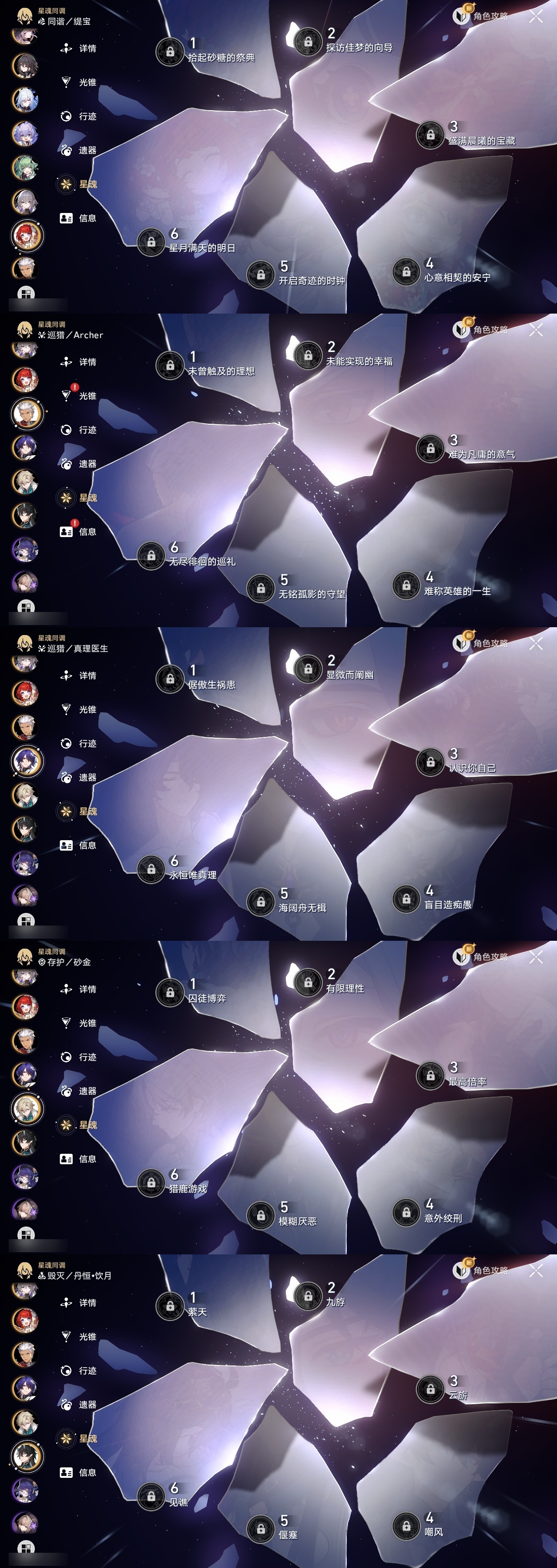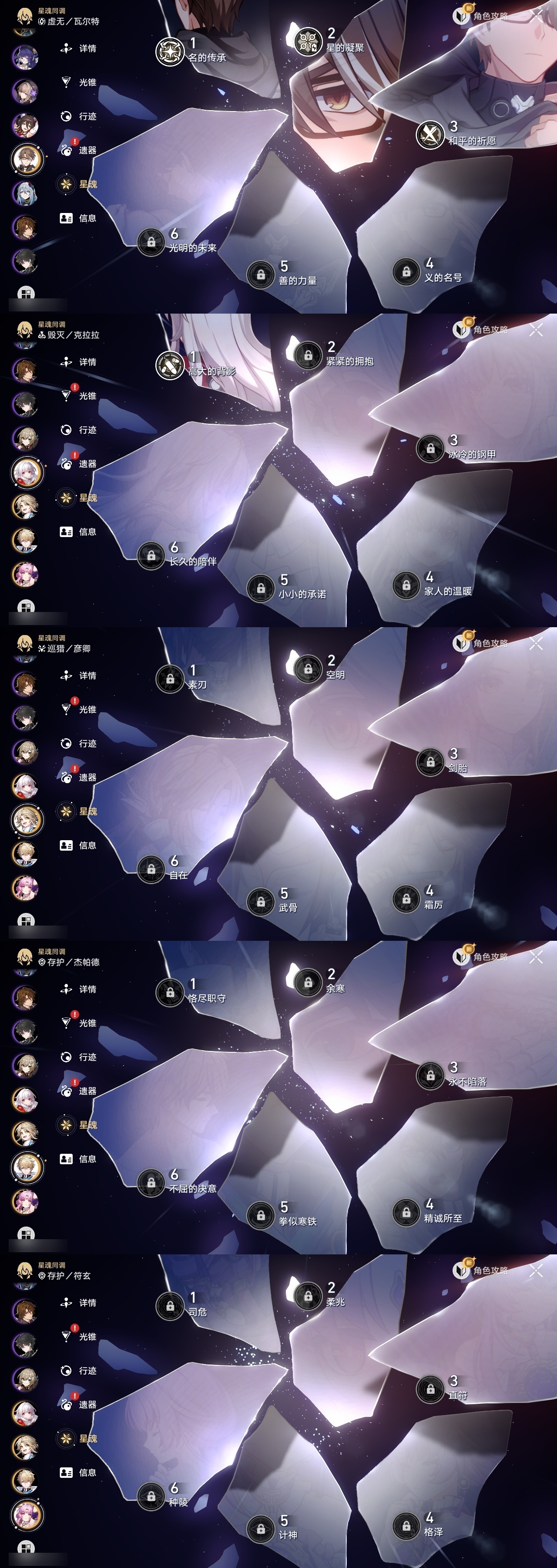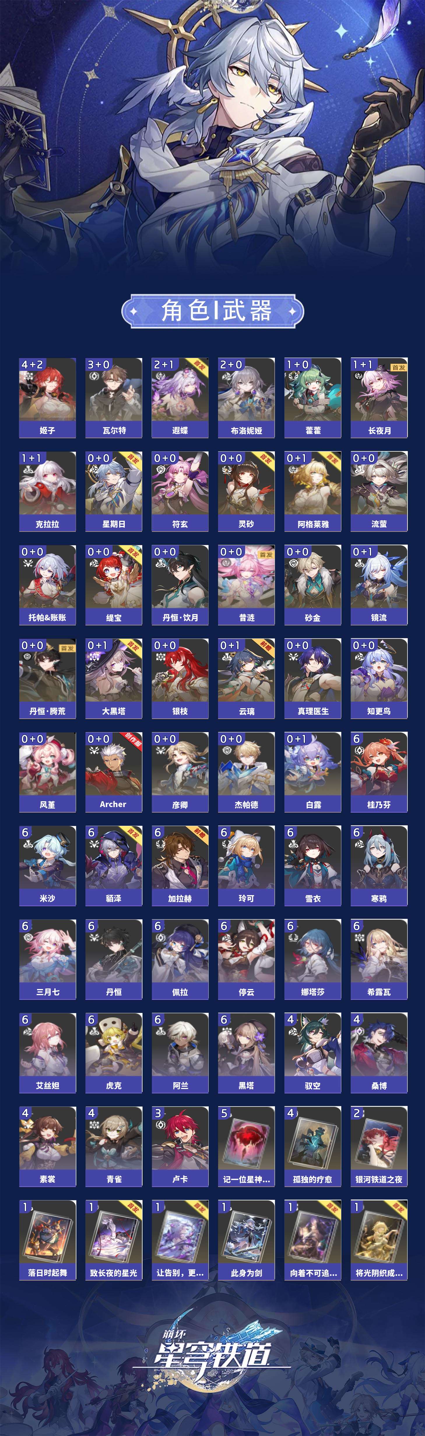 【崩坏·星穹铁道】【lyxq9151】冒险等级:70,男主,五星数量:41,五星角色:姬子 4命瓦尔特 3命布洛妮娅 2命遐蝶 2命克拉拉 1命藿藿 1命长夜月 1命云璃白露灵砂杰帕德彦卿星期日大黑塔阿格莱雅缇宝丹恒·饮月符玄镜流托帕账账银枝真理医生风堇砂金知更鸟archer丹恒·腾荒昔涟流萤__五星光锥:记一位星神的陨落 5精孤独的疗愈 4精银河铁道之夜 2精落日时起舞无可取代的东西时节不居时节不居向着不可追问处将光阴织成黄金让告别,更美一些此身为剑致长夜的星光__四星角色:阿兰 6命娜塔莎 6命虎克 6命貊泽 6命黑塔 6命丹恒 6命艾丝妲 6命希露瓦 6命停云 6命三月七 6命佩拉 6命玲可 6命桂乃芬 6命寒鸦 6命雪衣 6命米沙 6命加拉赫 6命素裳 4命桑博 4命青雀 4命驭空 4命卢卡 3命