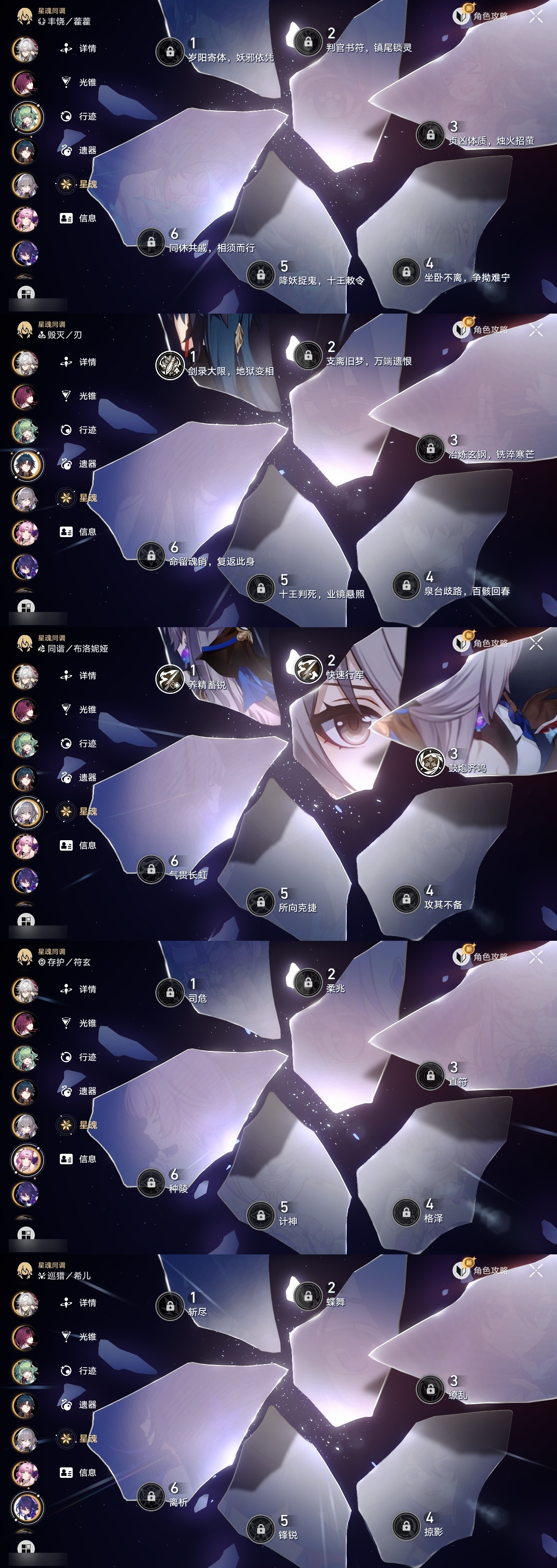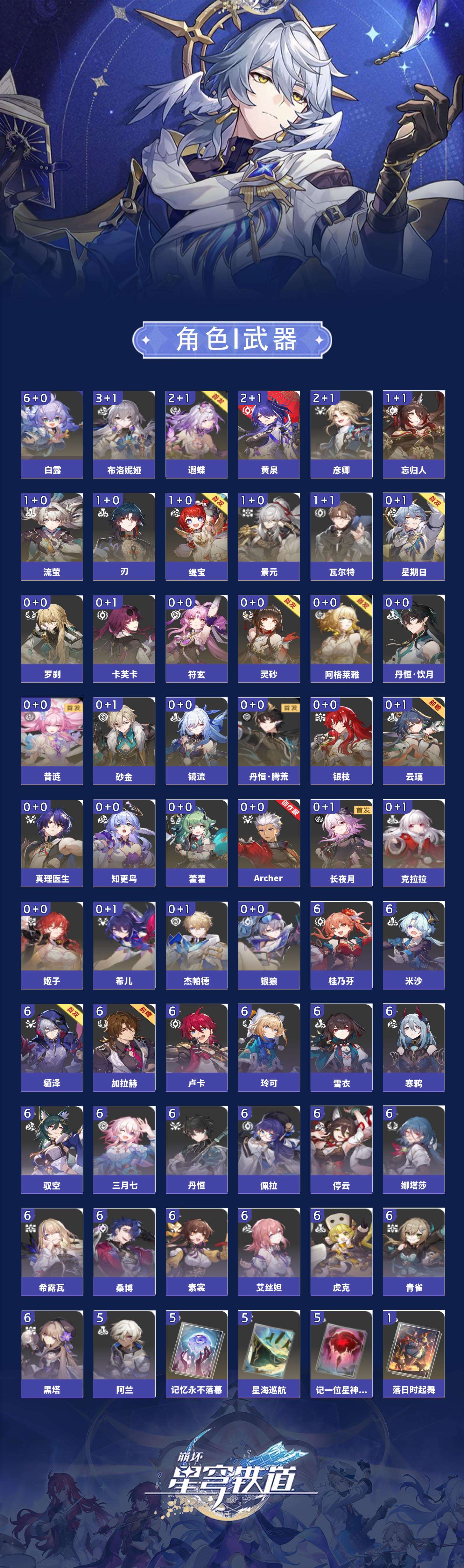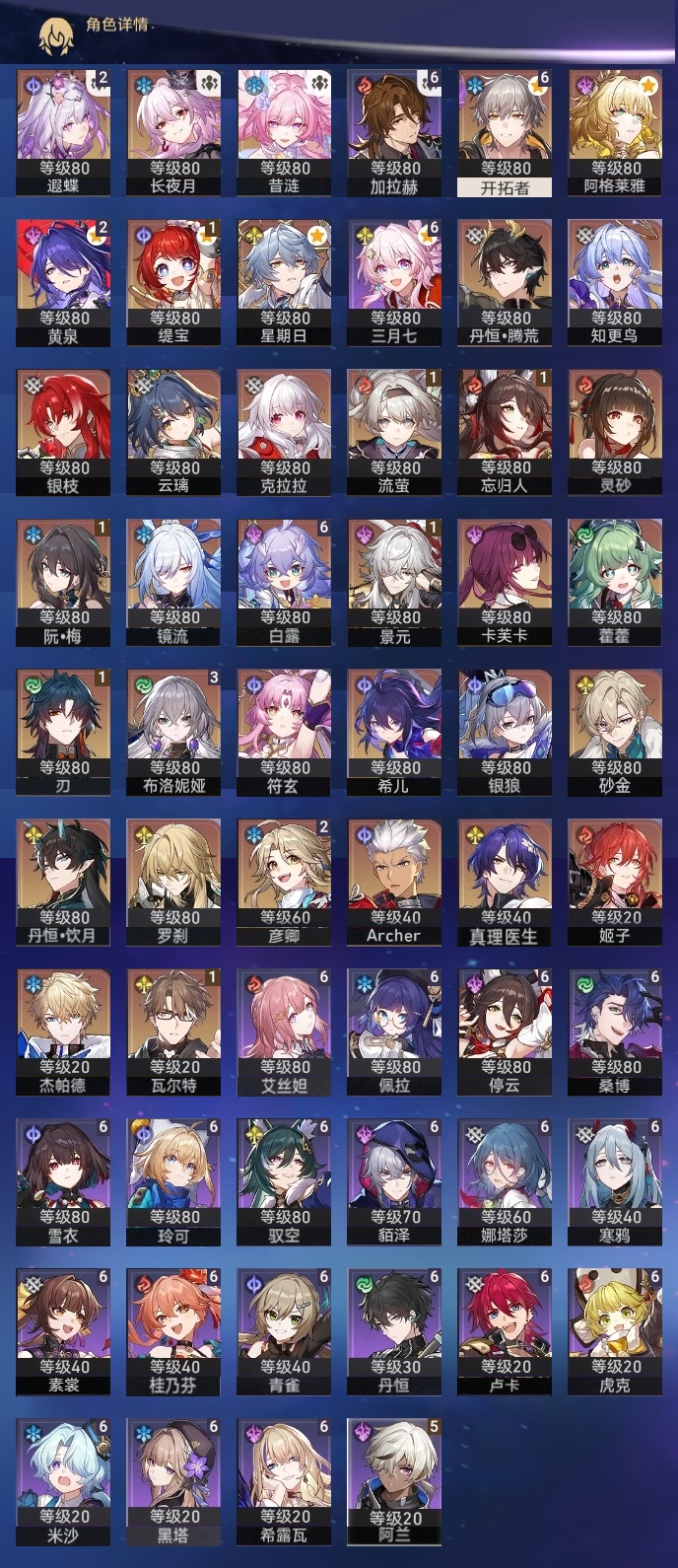 【崩坏·星穹铁道】【lyxq9176】冒险等级:70,男主,五星数量:56,五星角色:白露 6命布洛妮娅 3命彦卿 2命遐蝶 2命黄泉 2命景元 1命瓦尔特 1命忘归人 1命缇宝 1命刃 1命流萤 1命云璃银狼希儿姬子灵砂杰帕德克拉拉星期日罗刹阿格莱雅卡芙卡丹恒·饮月符玄镜流藿藿银枝真理医生砂金知更鸟archer长夜月丹恒·腾荒昔涟__五星光锥:星海巡航 5精记一位星神的陨落 5精记忆永不落幕 5精落日时起舞记忆的质料制胜的瞬间以世界之名无可取代的东西无可取代的东西如泥酣眠如泥酣眠但战斗还未结束于夜色中不息的演算回到大地的飞行长路终有归途孤独的疗愈只需等待让告别,更美一些行于流逝的岸命运从未公平致长夜的星光__四星角色:娜塔莎 6命虎克 6命貊泽 6命黑塔 6命丹恒 6命艾丝妲 6命希露瓦 6命停云 6命素裳 6命桑博 6命三月七 6命青雀 6命佩拉 6命驭空 6命卢卡 6命玲可 6命桂乃芬 6命寒鸦 6命雪衣 6命米沙 6命加拉赫 6命阿兰 5命
