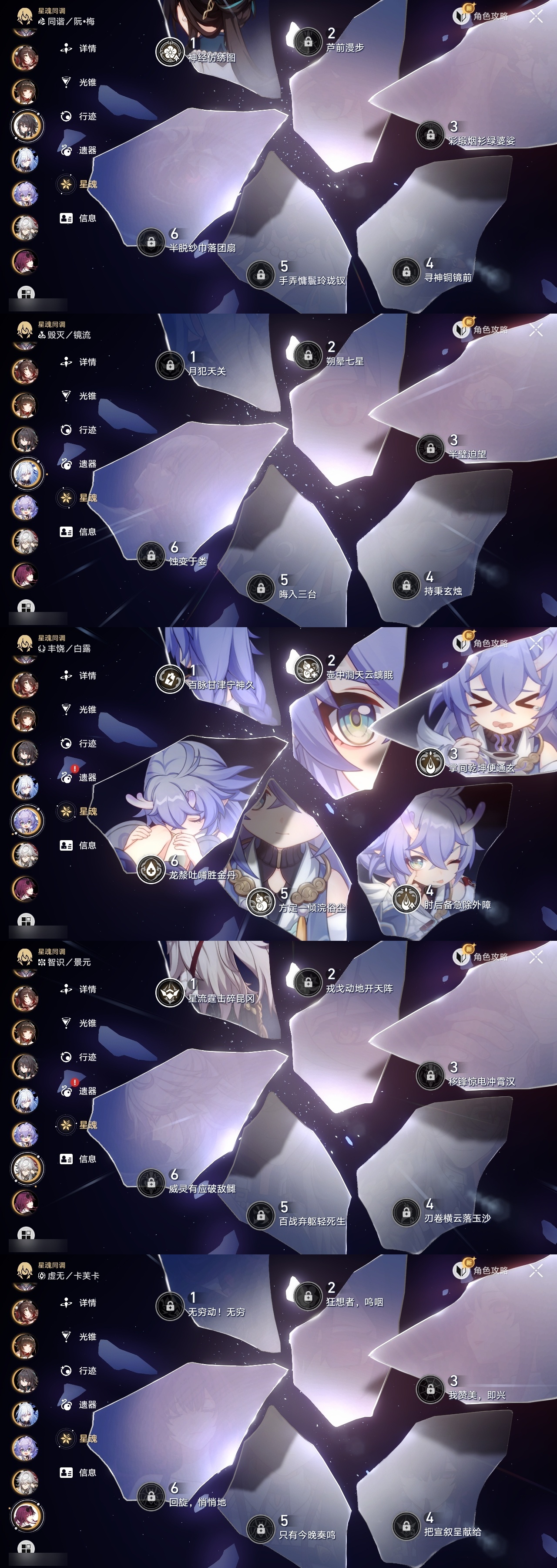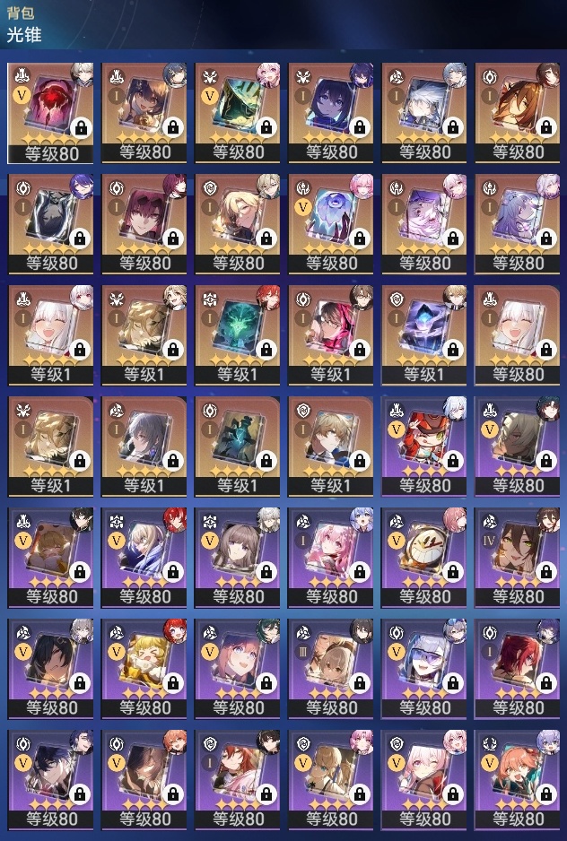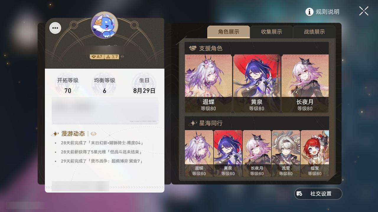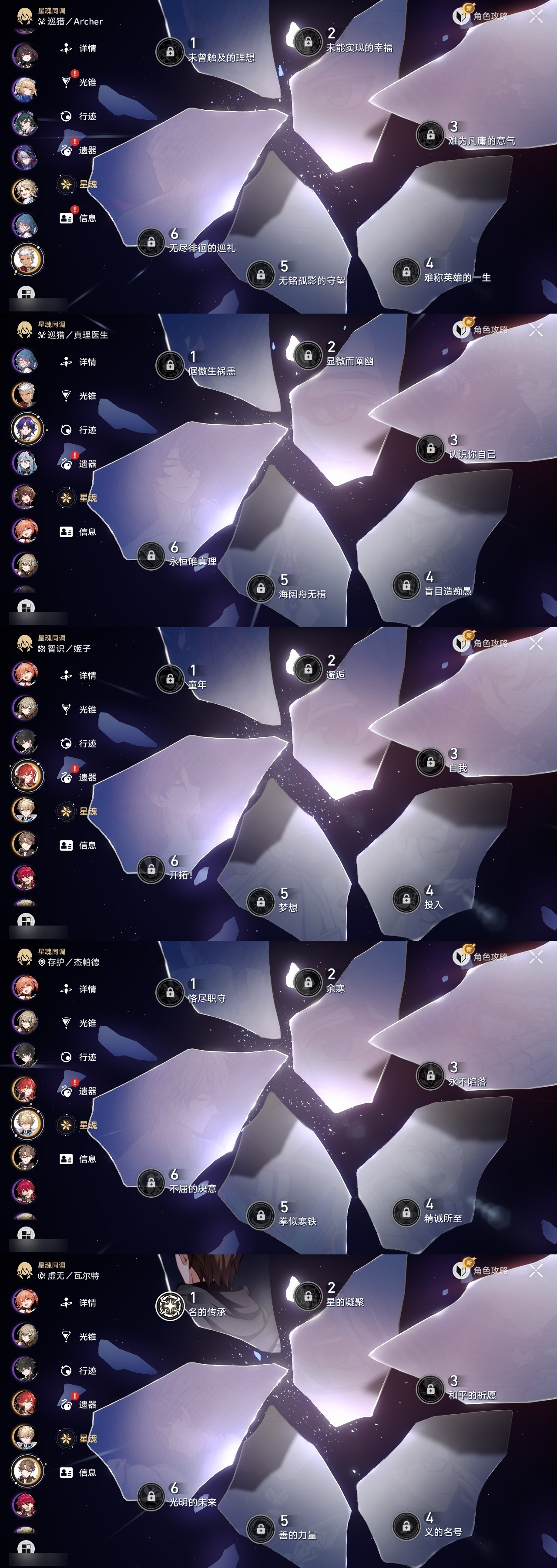 【崩坏·星穹铁道】【lyxq9176】冒险等级:70,男主,五星数量:56,五星角色:白露 6命布洛妮娅 3命彦卿 2命遐蝶 2命黄泉 2命景元 1命瓦尔特 1命忘归人 1命缇宝 1命刃 1命流萤 1命云璃银狼希儿姬子灵砂杰帕德克拉拉星期日罗刹阿格莱雅卡芙卡丹恒·饮月符玄镜流藿藿银枝真理医生砂金知更鸟archer长夜月丹恒·腾荒昔涟__五星光锥:星海巡航 5精记一位星神的陨落 5精记忆永不落幕 5精落日时起舞记忆的质料制胜的瞬间以世界之名无可取代的东西无可取代的东西如泥酣眠如泥酣眠但战斗还未结束于夜色中不息的演算回到大地的飞行长路终有归途孤独的疗愈只需等待让告别,更美一些行于流逝的岸命运从未公平致长夜的星光__四星角色:娜塔莎 6命虎克 6命貊泽 6命黑塔 6命丹恒 6命艾丝妲 6命希露瓦 6命停云 6命素裳 6命桑博 6命三月七 6命青雀 6命佩拉 6命驭空 6命卢卡 6命玲可 6命桂乃芬 6命寒鸦 6命雪衣 6命米沙 6命加拉赫 6命阿兰 5命