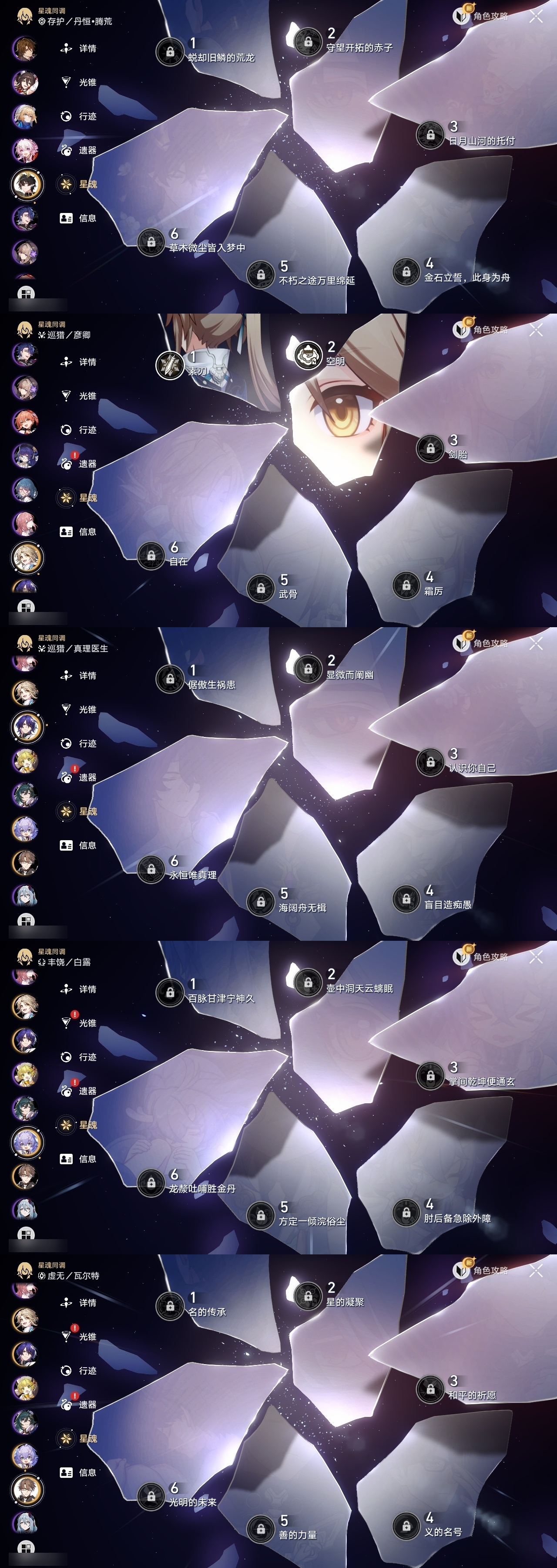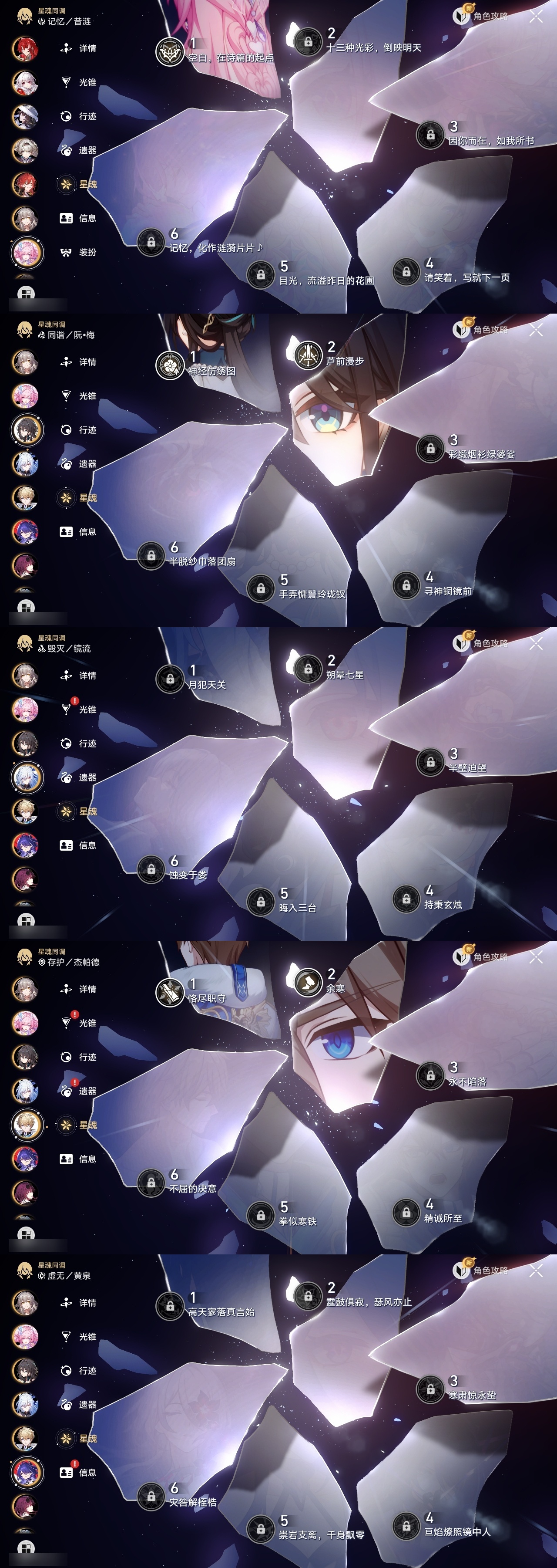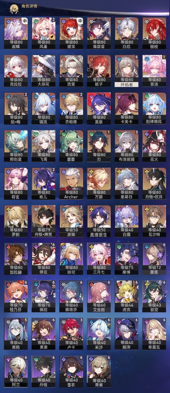 【崩坏·星穹铁道】【lyxq9182】冒险等级:70,女主,五星数量:46,五星角色:布洛妮娅 3命希儿 2命杰帕德 2命彦卿 2命风堇 2命刃 1命昔涟 1命飞霄白露姬子瓦尔特克拉拉星期日罗刹缇宝万敌卡芙卡丹恒·饮月遐蝶符玄镜流藿藿银枝真理医生花火那刻夏黄泉白厄archer海瑟音刻律德菈丹恒·腾荒大丽花流萤__五星光锥:星海巡航 5精记一位星神的陨落 5精记忆永不落幕 5精无可取代的东西 3精制胜的瞬间 2精银河铁道之夜如果时间是一朵花让告别,更美一些镜中故我生命当付之一炬黎明恰如此燃烧理想燃烧的地狱__四星角色:阿兰 6命娜塔莎 6命虎克 6命貊泽 6命黑塔 6命丹恒 6命艾丝妲 6命希露瓦 6命停云 6命素裳 6命桑博 6命三月七 6命青雀 6命佩拉 6命驭空 6命玲可 6命桂乃芬 6命雪衣 6命米沙 6命加拉赫 6命寒鸦 5命卢卡 3命