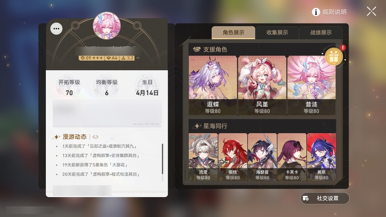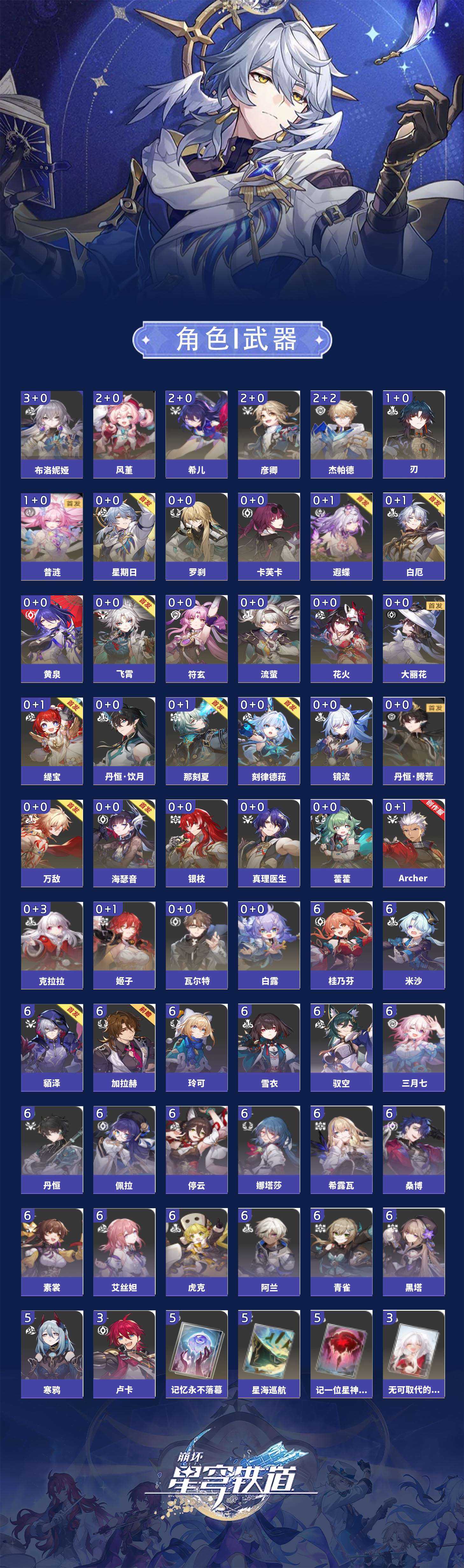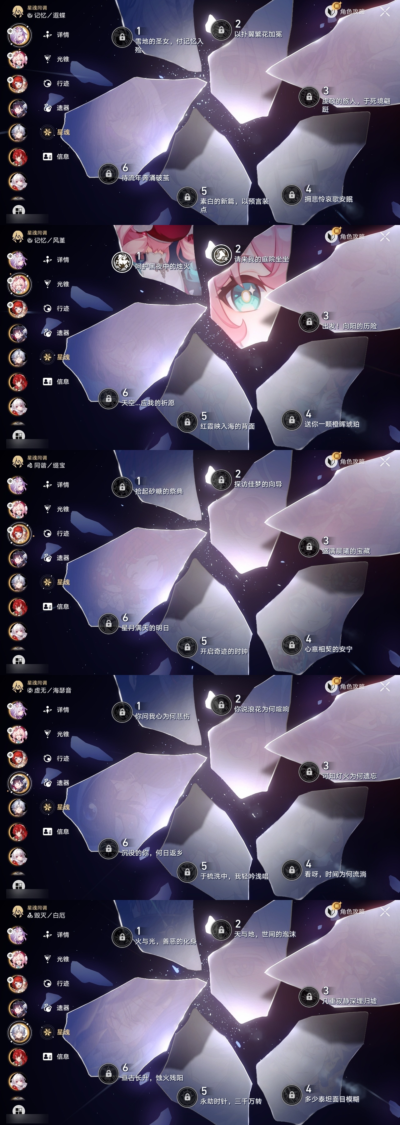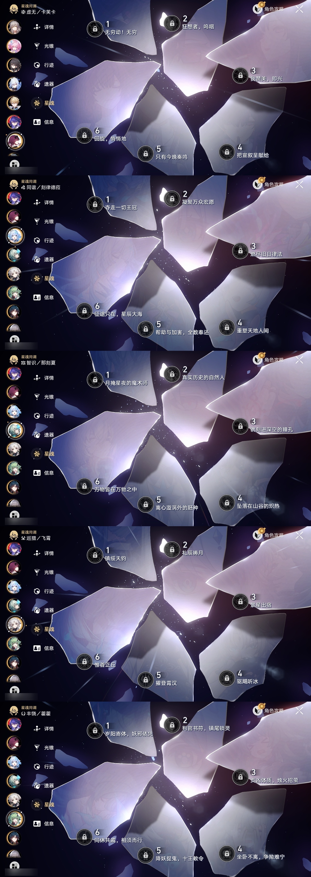 【崩坏·星穹铁道】【lyxq9182】冒险等级:70,女主,五星数量:46,五星角色:布洛妮娅 3命希儿 2命杰帕德 2命彦卿 2命风堇 2命刃 1命昔涟 1命飞霄白露姬子瓦尔特克拉拉星期日罗刹缇宝万敌卡芙卡丹恒·饮月遐蝶符玄镜流藿藿银枝真理医生花火那刻夏黄泉白厄archer海瑟音刻律德菈丹恒·腾荒大丽花流萤__五星光锥:星海巡航 5精记一位星神的陨落 5精记忆永不落幕 5精无可取代的东西 3精制胜的瞬间 2精银河铁道之夜如果时间是一朵花让告别,更美一些镜中故我生命当付之一炬黎明恰如此燃烧理想燃烧的地狱__四星角色:阿兰 6命娜塔莎 6命虎克 6命貊泽 6命黑塔 6命丹恒 6命艾丝妲 6命希露瓦 6命停云 6命素裳 6命桑博 6命三月七 6命青雀 6命佩拉 6命驭空 6命玲可 6命桂乃芬 6命雪衣 6命米沙 6命加拉赫 6命寒鸦 5命卢卡 3命
