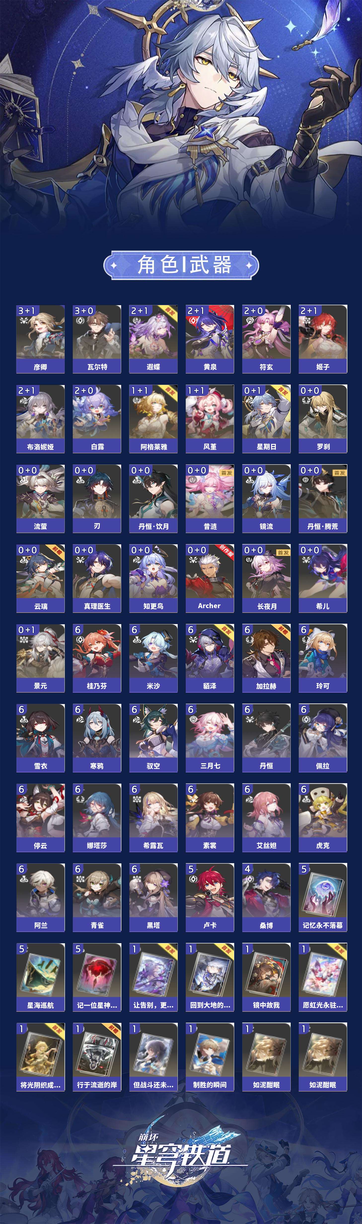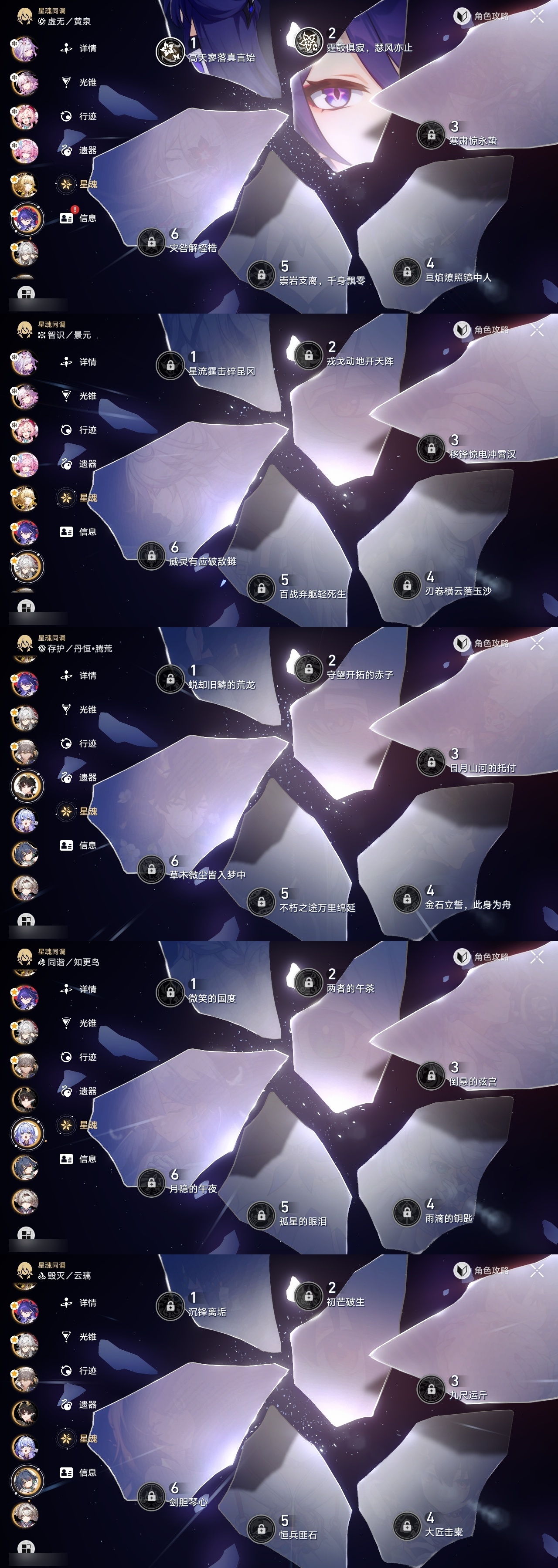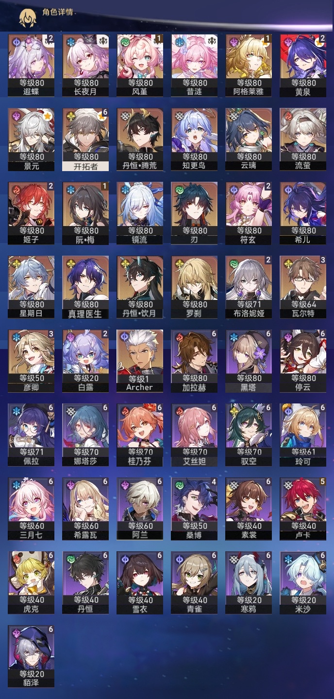 【崩坏·星穹铁道】【lyxq9188】冒险等级:70,男主,五星数量:41,五星角色:彦卿 3命瓦尔特 3命白露 2命布洛妮娅 2命姬子 2命符玄 2命遐蝶 2命黄泉 2命阿格莱雅 1命风堇 1命云璃景元希儿星期日罗刹刃丹恒·饮月镜流真理医生知更鸟archer长夜月丹恒·腾荒昔涟流萤__五星光锥:星海巡航 5精记一位星神的陨落 5精记忆永不落幕 5精制胜的瞬间银河铁道之夜无可取代的东西如泥酣眠如泥酣眠但战斗还未结束拂晓之前回到大地的飞行将光阴织成黄金让告别,更美一些镜中故我行于流逝的岸愿虹光永驻天空__四星角色:阿兰 6命娜塔莎 6命虎克 6命貊泽 6命黑塔 6命丹恒 6命艾丝妲 6命希露瓦 6命停云 6命素裳 6命三月七 6命青雀 6命佩拉 6命驭空 6命玲可 6命桂乃芬 6命寒鸦 6命雪衣 6命米沙 6命加拉赫 6命卢卡 5命桑博 4命