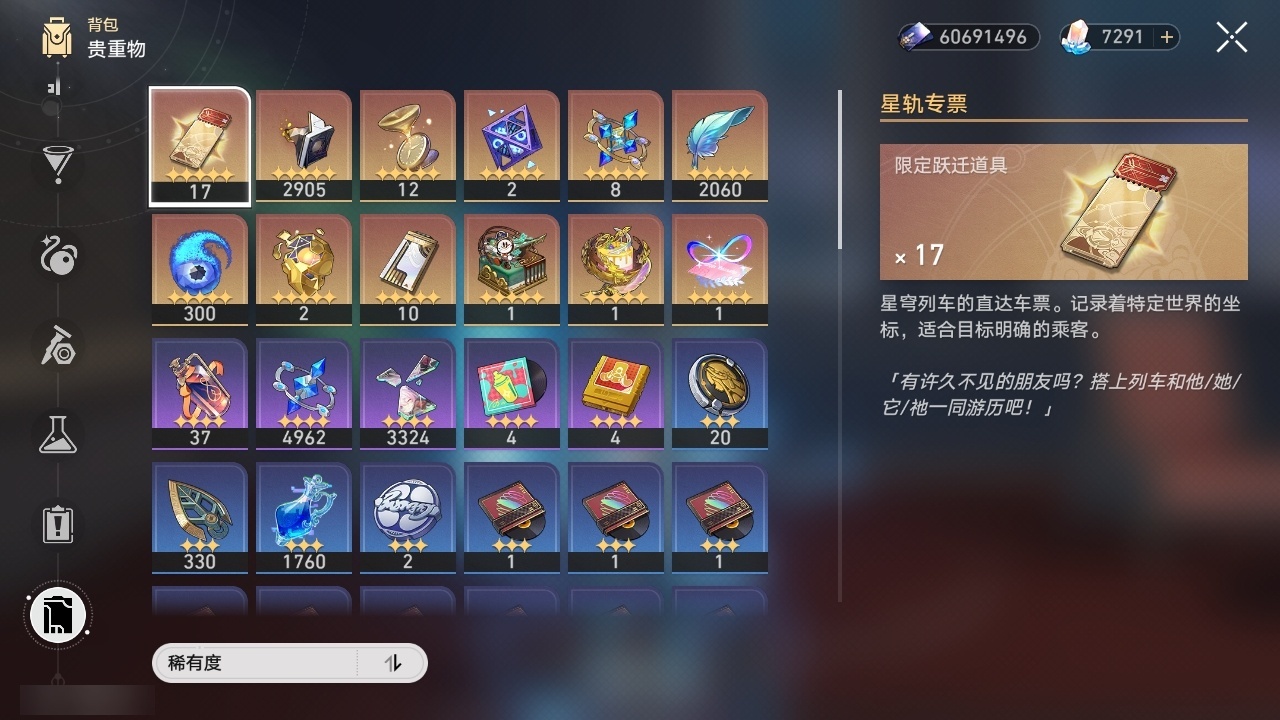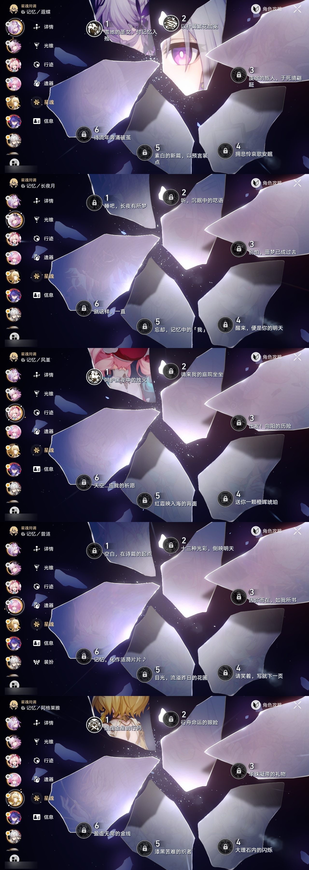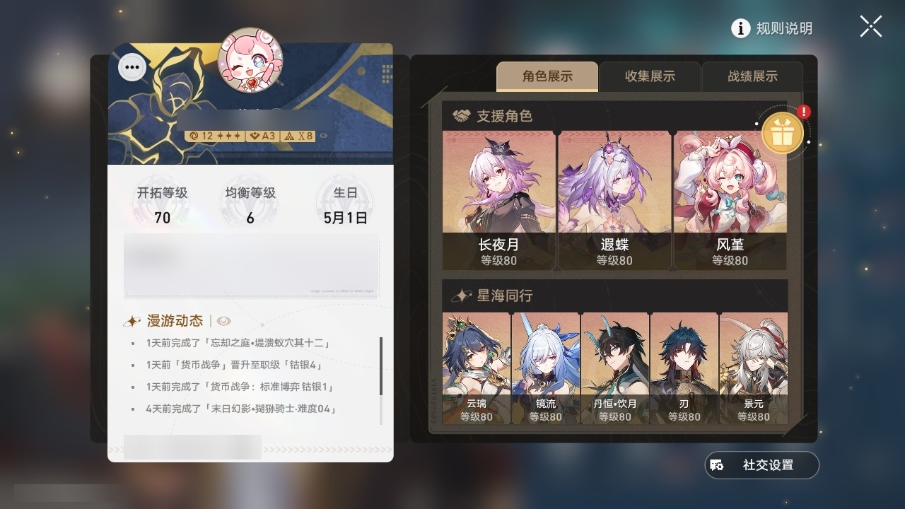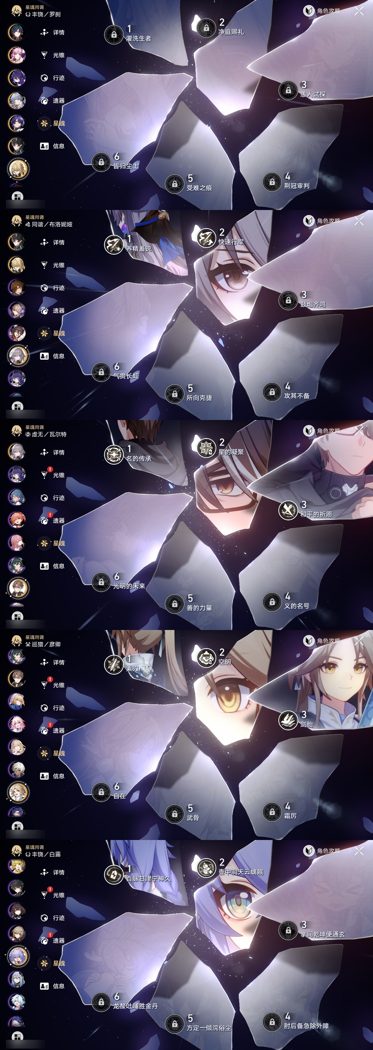 【崩坏·星穹铁道】【lyxq9188】冒险等级:70,男主,五星数量:41,五星角色:彦卿 3命瓦尔特 3命白露 2命布洛妮娅 2命姬子 2命符玄 2命遐蝶 2命黄泉 2命阿格莱雅 1命风堇 1命云璃景元希儿星期日罗刹刃丹恒·饮月镜流真理医生知更鸟archer长夜月丹恒·腾荒昔涟流萤__五星光锥:星海巡航 5精记一位星神的陨落 5精记忆永不落幕 5精制胜的瞬间银河铁道之夜无可取代的东西如泥酣眠如泥酣眠但战斗还未结束拂晓之前回到大地的飞行将光阴织成黄金让告别,更美一些镜中故我行于流逝的岸愿虹光永驻天空__四星角色:阿兰 6命娜塔莎 6命虎克 6命貊泽 6命黑塔 6命丹恒 6命艾丝妲 6命希露瓦 6命停云 6命素裳 6命三月七 6命青雀 6命佩拉 6命驭空 6命玲可 6命桂乃芬 6命寒鸦 6命雪衣 6命米沙 6命加拉赫 6命卢卡 5命桑博 4命