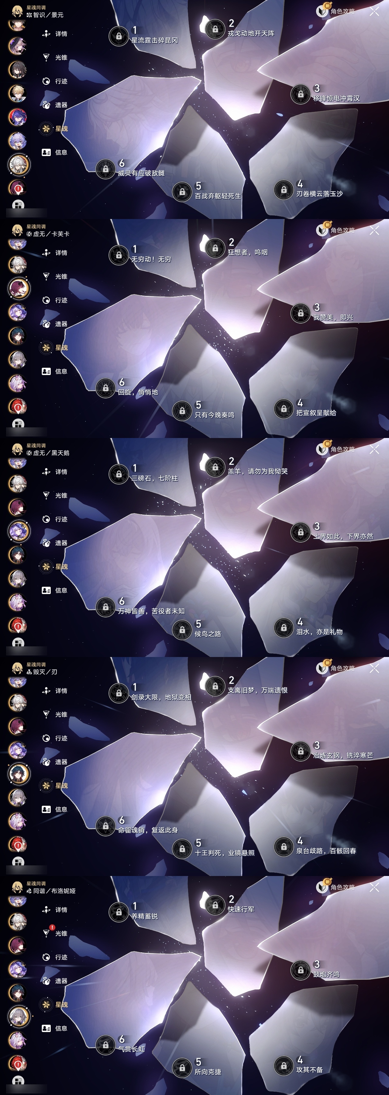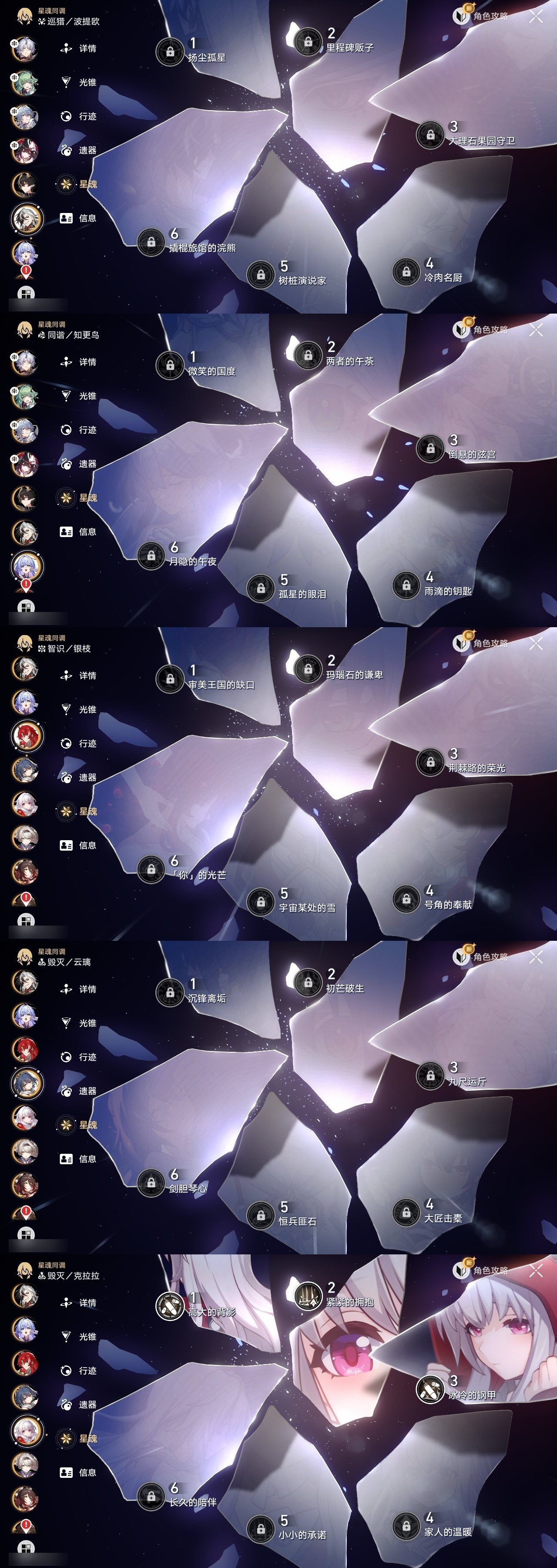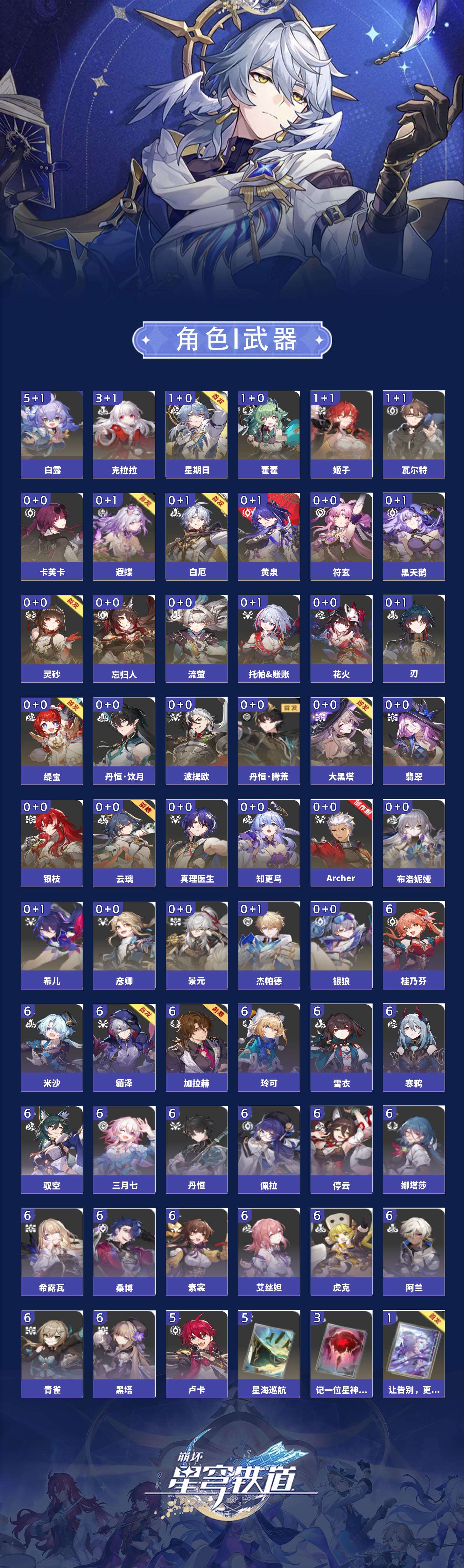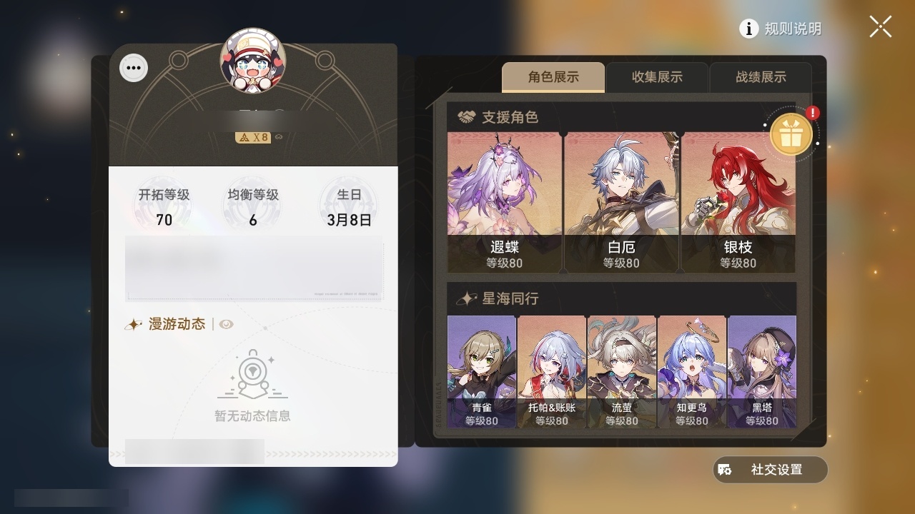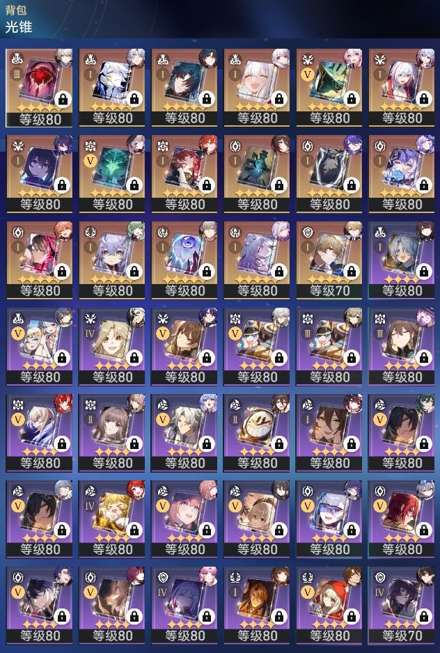 【崩坏·星穹铁道】【lyxq9210】冒险等级:70,男主,五星数量:52,五星角色:白露 5命克拉拉 3命姬子 1命瓦尔特 1命星期日 1命藿藿 1命云璃银狼景元希儿布洛妮娅灵砂杰帕德彦卿大黑塔忘归人缇宝刃卡芙卡丹恒·饮月遐蝶符玄托帕账账银枝真理医生黑天鹅花火黄泉知更鸟白厄archer丹恒·腾荒波提欧流萤翡翠__五星光锥:星海巡航 5精不息的演算 5精记一位星神的陨落 3精制胜的瞬间银河铁道之夜以世界之名无可取代的东西时节不居于夜色中到不了的彼岸孤独的疗愈让告别,更美一些烦恼着,幸福着重塑时光之忆行于流逝的岸记忆永不落幕黎明恰如此燃烧__四星角色:阿兰 6命娜塔莎 6命虎克 6命貊泽 6命黑塔 6命丹恒 6命艾丝妲 6命希露瓦 6命停云 6命素裳 6命桑博 6命三月七 6命青雀 6命佩拉 6命驭空 6命玲可 6命桂乃芬 6命寒鸦 6命雪衣 6命米沙 6命加拉赫 6命卢卡 5命