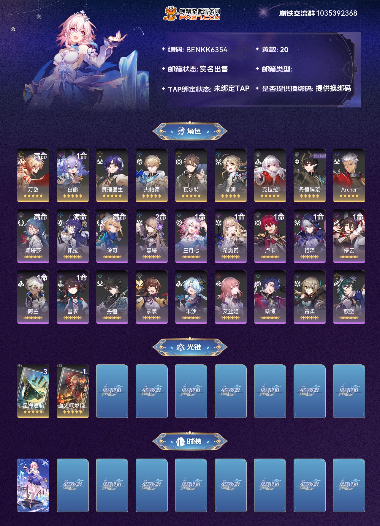 【崩坏·星穹铁道】【lyxq9156】冒险等级:62,女主,五星数量:11,绑定情况:邮箱__五星角色:万敌 6命|白露 1命|真理医生|杰帕德|瓦尔特|彦卿|克拉拉|丹恒·腾荒|archer__五星光锥:星海巡航 3精|血火啊,燃烧前路,【邮箱已实名】还有340多抽