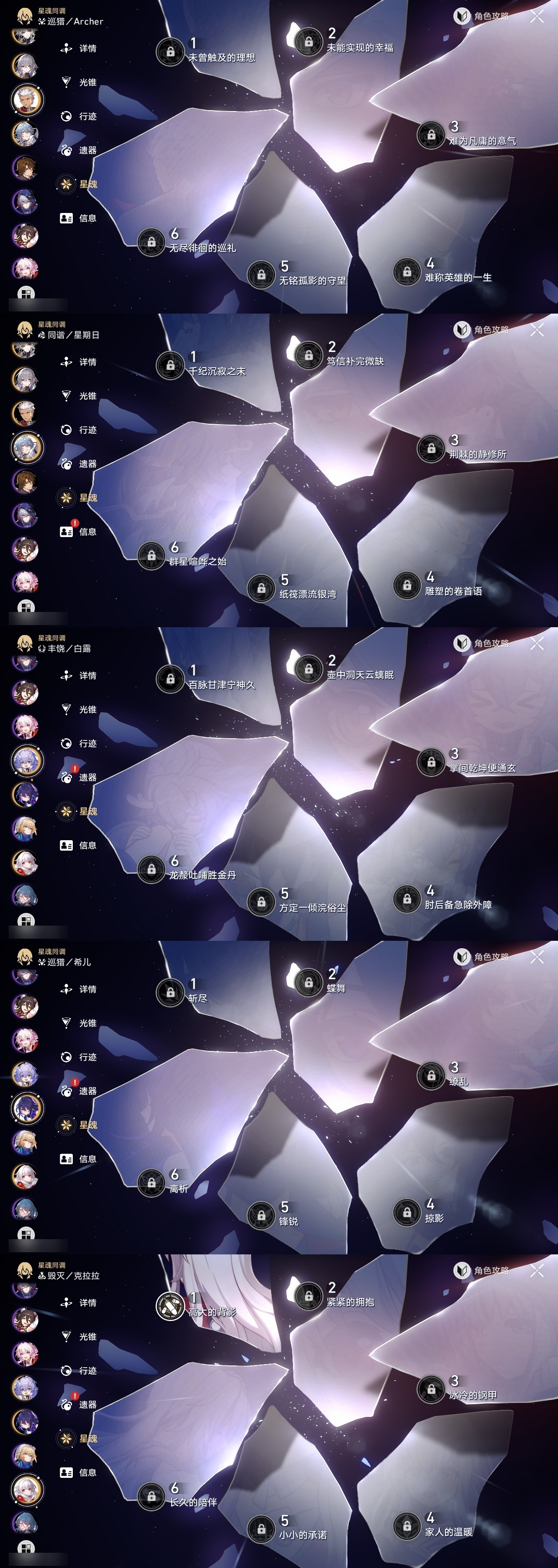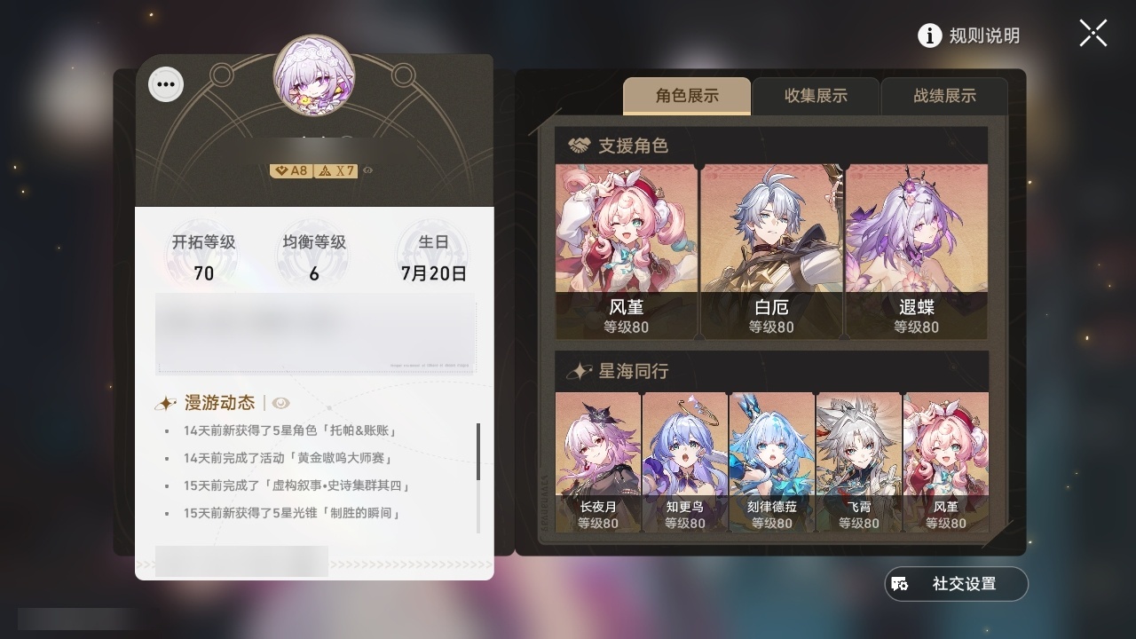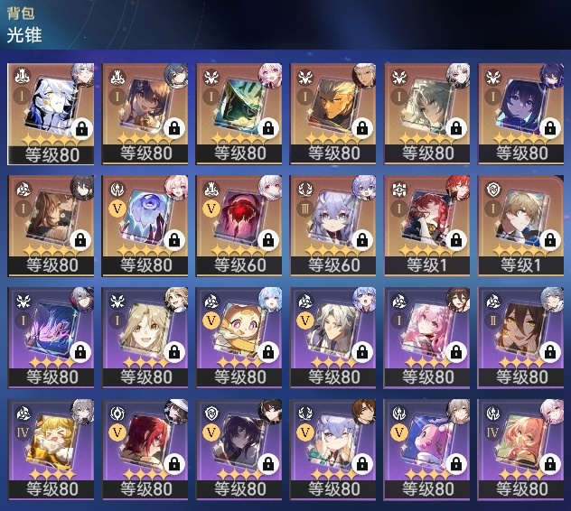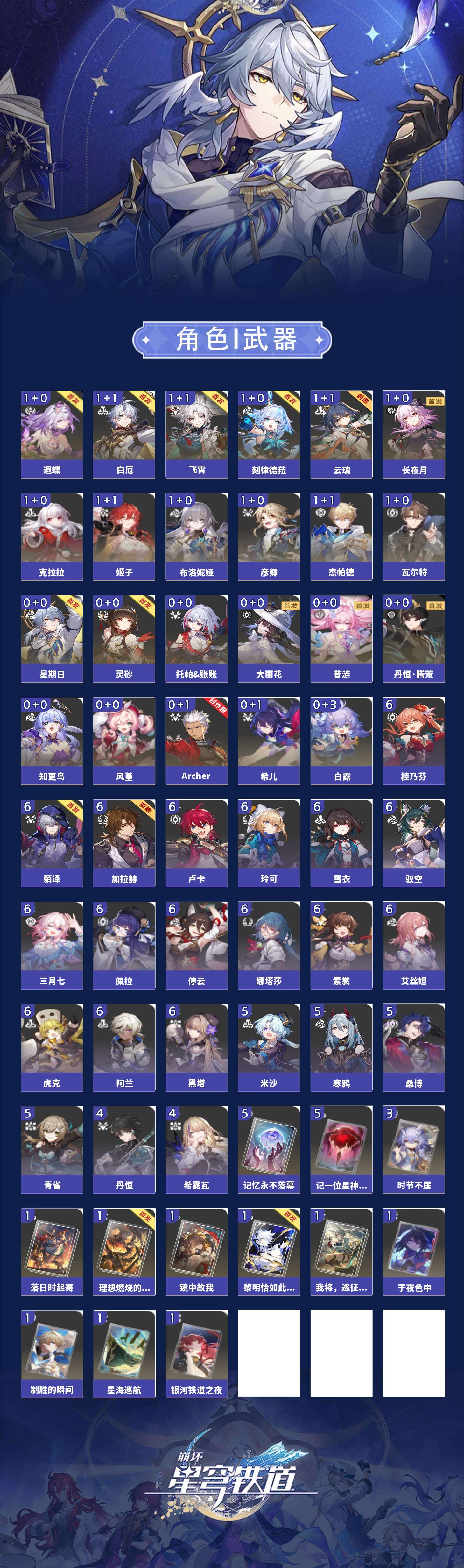 【崩坏·星穹铁道】【lyxq9224】冒险等级:70,女主,五星数量:35,五星角色:云璃 1命飞霄 1命布洛妮娅 1命姬子 1命杰帕德 1命彦卿 1命瓦尔特 1命克拉拉 1命遐蝶 1命白厄 1命刻律德菈 1命长夜月 1命希儿白露灵砂星期日托帕账账风堇知更鸟archer丹恒·腾荒昔涟大丽花__五星光锥:记一位星神的陨落 5精记忆永不落幕 5精时节不居 3精落日时起舞星海巡航制胜的瞬间银河铁道之夜于夜色中我将,巡征追猎镜中故我黎明恰如此燃烧理想燃烧的地狱__四星角色:阿兰 6命娜塔莎 6命虎克 6命貊泽 6命黑塔 6命艾丝妲 6命停云 6命素裳 6命三月七 6命佩拉 6命驭空 6命卢卡 6命玲可 6命桂乃芬 6命雪衣 6命加拉赫 6命桑博 5命青雀 5命寒鸦 5命米沙 5命丹恒 4命希露瓦 4命记忆队 白厄队